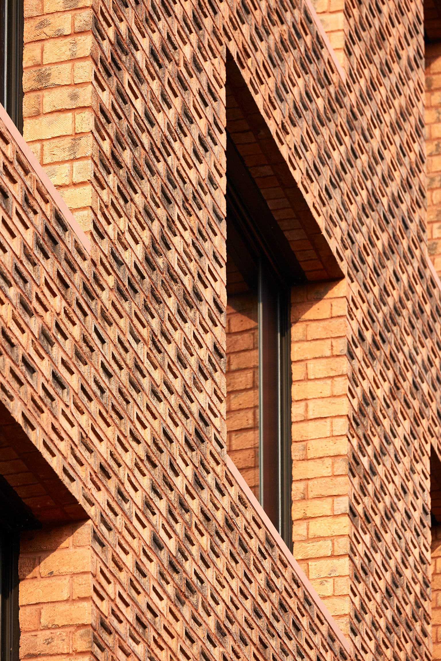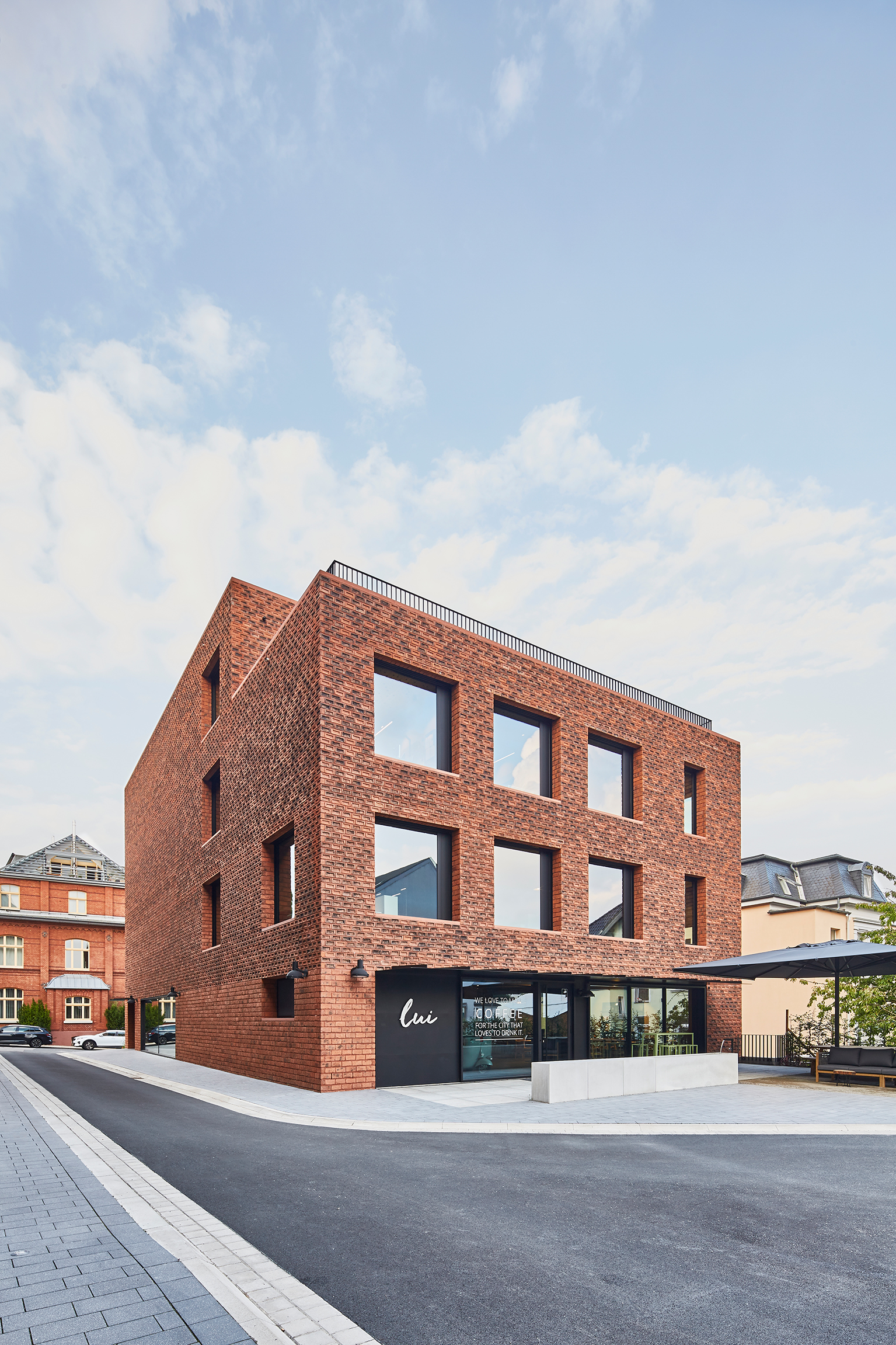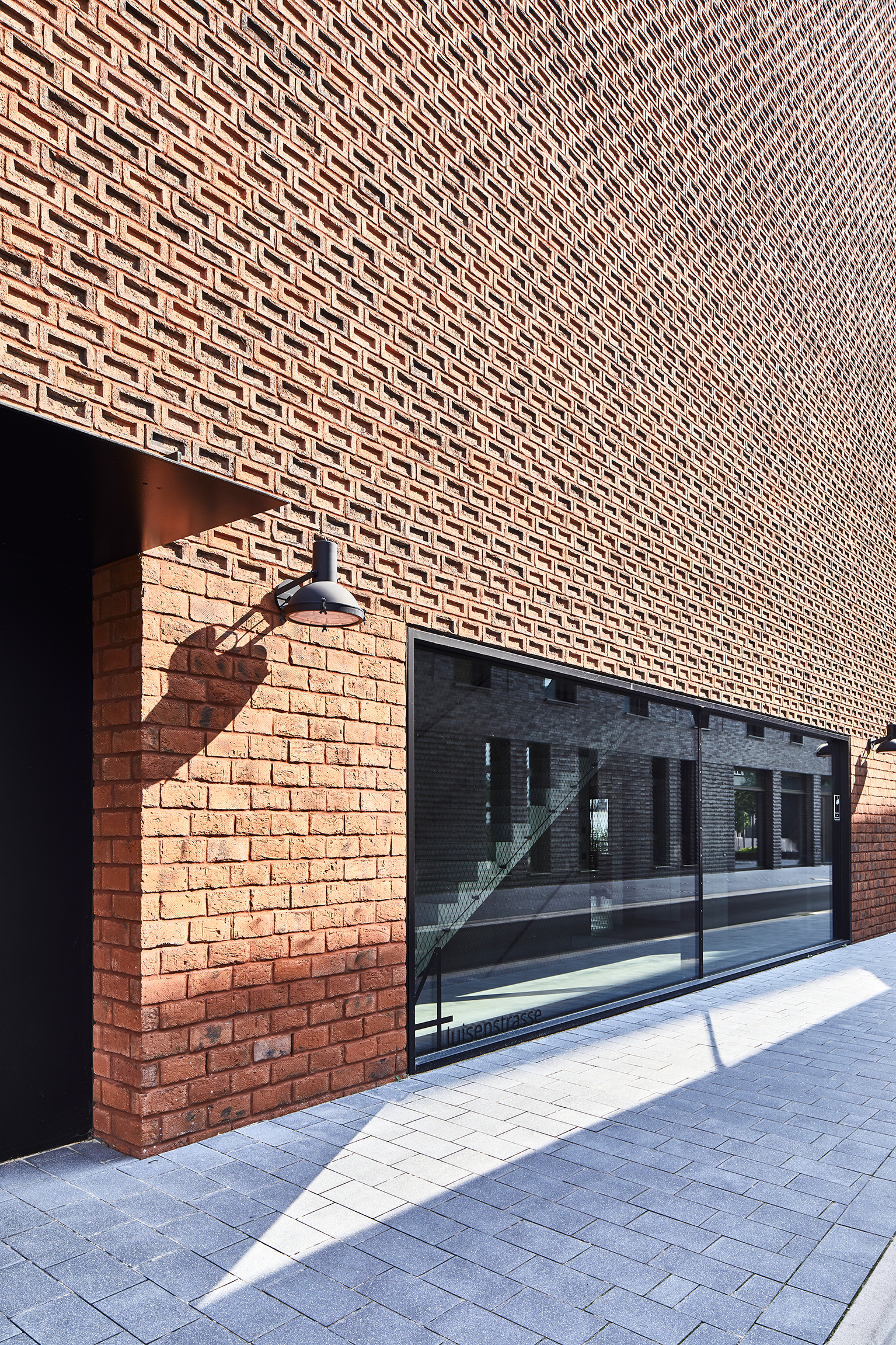 Die Fassaden aus dänischem handgefertigtem Klinker erinnern an Industriegebäude aus den 1920er- und 30er-Jahren und transformieren die Backsteinkultur dieser Zeit ins Heute. Ihre Tiefenwirkung erhält sie in den oberen Geschossen durch eine ungewohnte, hochkantige Vermauerung mit nach außen gedrehten Mörteltaschen. Diese befinden sich normalerweise in den Lagerfugen des Mauerwerks und sind mit Mörtel gefüllt. An diesem Gebäude aber sind die Mörteltaschen ein rein ornamentales Gestaltungsmerkmal. Der Sockel wurde flächig ausgeführt, mit konventionell vermauerten Klinkern und daher unsichtbaren Mörteltaschen. Herausfordernd war die Umsetzung eines „Ganzstein-Verbandes“. Die Gebäude-, Fenster- und Pfeilermaße ordnen sich dem Prinzip unter, sodass ausschließlich ganze Steine vermauert wurden.