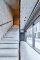 In der Fassade sitzen verschiedene Fenstertypen und -systeme von Schüco. Von innen rahmen die dunklen Metallprofile die Fenster wie ein Passepartout. Die Fensterelemente sind hier bündig mit dem Putz. Außen entsteht dadurch eine größere Laibungstiefe und damit eine ausdrucksstarke Tiefenwirkung. Alle Fenster mussten auf das spezielle Klinkerformat 228 x 85 x 108 mm (L x H x B) optimiert werden, um keine Steine anschneiden zu müssen. In den Obergeschossen wurden zwei Formate der Aluminium-Profilserie AWS 75.SI mit flächigen Metallprofilen verbaut: große, nahezu quadratische Fenster (ca. 2,45 x 2,45 m) sowie schmale Drehflügel-Varianten (ca. 1,20 x 2.45 m) mit schlanken Ansichtsbreiten. In allen quadratischen Fenstern gibt es einen über die ganze Höhe reichenden, 12 cm breiten Lüftungsspalt, der zugunsten des Nutzerkomforts manuell geöffnet werden kann. Im rund acht Meter langen Treppenhaus sorgt das Pfosten-Riegel-System FWS 50.SI für maximal viel Tageslichteintrag. Im öffentlichen Café sowie beim Zugang der Dachterrasse entschieden sich die Verantwortlichen für Panorama-Schiebetüranlagen ASE 67 PD. Sie lassen sich in beide Richtungen so weit aufschieben, dass rund 3,50 Meter breite, lichte Öffnungen entstehen. Der Übergang zwischen innen und außen verschmilzt. Die Profile haben maximal schlanke Ansichtsbreiten mit nur 30 mm. Wie auch die Fenster stammen die Türen aus dem Hause Schüco. Alle Treppenhaus-Zugangstüren wurden in sämtlichen Geschossen als Brandschutz-Aluminiumtüren der Reihe ADS 80 FR 30 verbaut. Die Eingangstür ist das Türsystem AD UP 75. Sie erfüllt allen voran hohe