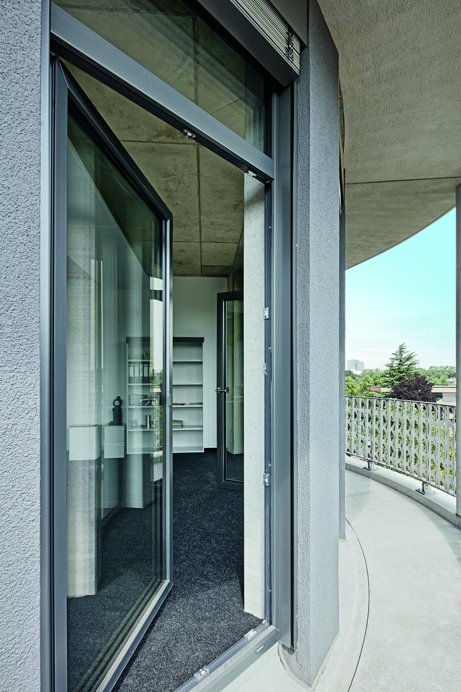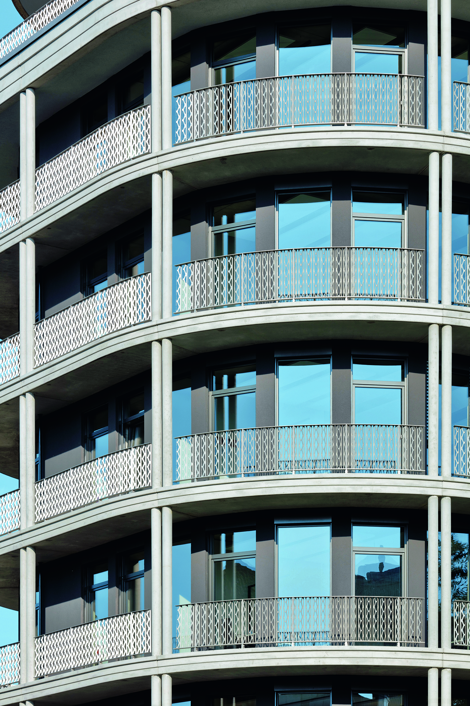 Die Flexibilität des Grundrisses spiegelt sich auch in der Fassade wider. Sie wächst aus einem Sichtbetonsockel aus großformatigen Fertigteilen heraus. Darüber beginnt eine Laubengangstruktur mit filigranen Doppelstützen aus Sichtbeton. Sie unterteilen die Laubengänge in kleinere Loggien-Einheiten und tragen die Lasten der Laubengänge ab. Die Absturzsicherung liegt genau zwischen den Stützen und umläuft das Gebäude jeweils auf allen sechs Geschossen wie eine zarte Bänderung. Sie besteht aus gefalteten Edelstahlblechen, in die ein Rautenmuster gelasert wurde. In ihrer Leichtigkeit unterstreichen die Bänder die Rundungen der Gebäudekontur. Dahinter erlauben bodentiefe Fenster von jedem Arbeitsplatz aus einen Zugang zu den Laubengängen. So profitieren die Büros von viel Tageslicht, das bekanntermaßen die Konzentrations- und Leistungsfähigkeit erhöht. Außerdem können die Räume auf diese Weise natürlich belüftet werden.