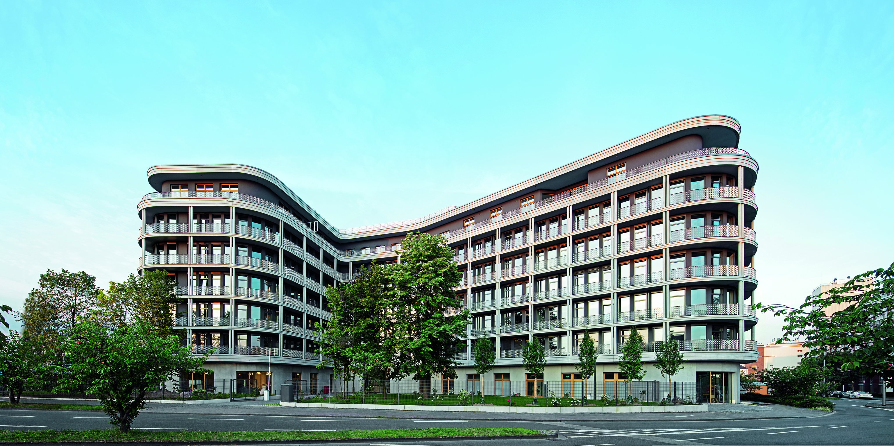 Das K8 ist eines der jüngst fertiggestellten Objekte der Projektentwicklungsgesellschaft Lucks Immobilien. Diese hat sich aus dem ortsansässigen Fenster- und Türenbau-Betrieb Wallburger heraus entwickelt, der für das K8 sämtliche Fenster hergestellt und verbaut hat. Während Erd- sowie Staffelgeschoss eine Lochfassade mit Eichenholzfenstern erhielten, kamen in den dazwischen liegenden fünf Regelgeschossen Kunststoff-Fenster der Serie Schüco LivIng in 82 mm Bautiefe in brillanter, dunkelgrauer Metallicoptik zum Einsatz. Mit seinen 7-Kammer-Profilen ermöglicht Schüco LivIng 82 AS hervorragende Wärmedämmwerte bis zur Passivhaustauglichkeit. Nicolai Lucks von Lucks Immobilien fasst zusammen: „Schüco LivIng 82 AS bot uns alle Funktionen und zu einem attraktiven Preis nahezu die gleiche hochwertige Ästhetik wie ein Aluminium-Fenstersystem“.