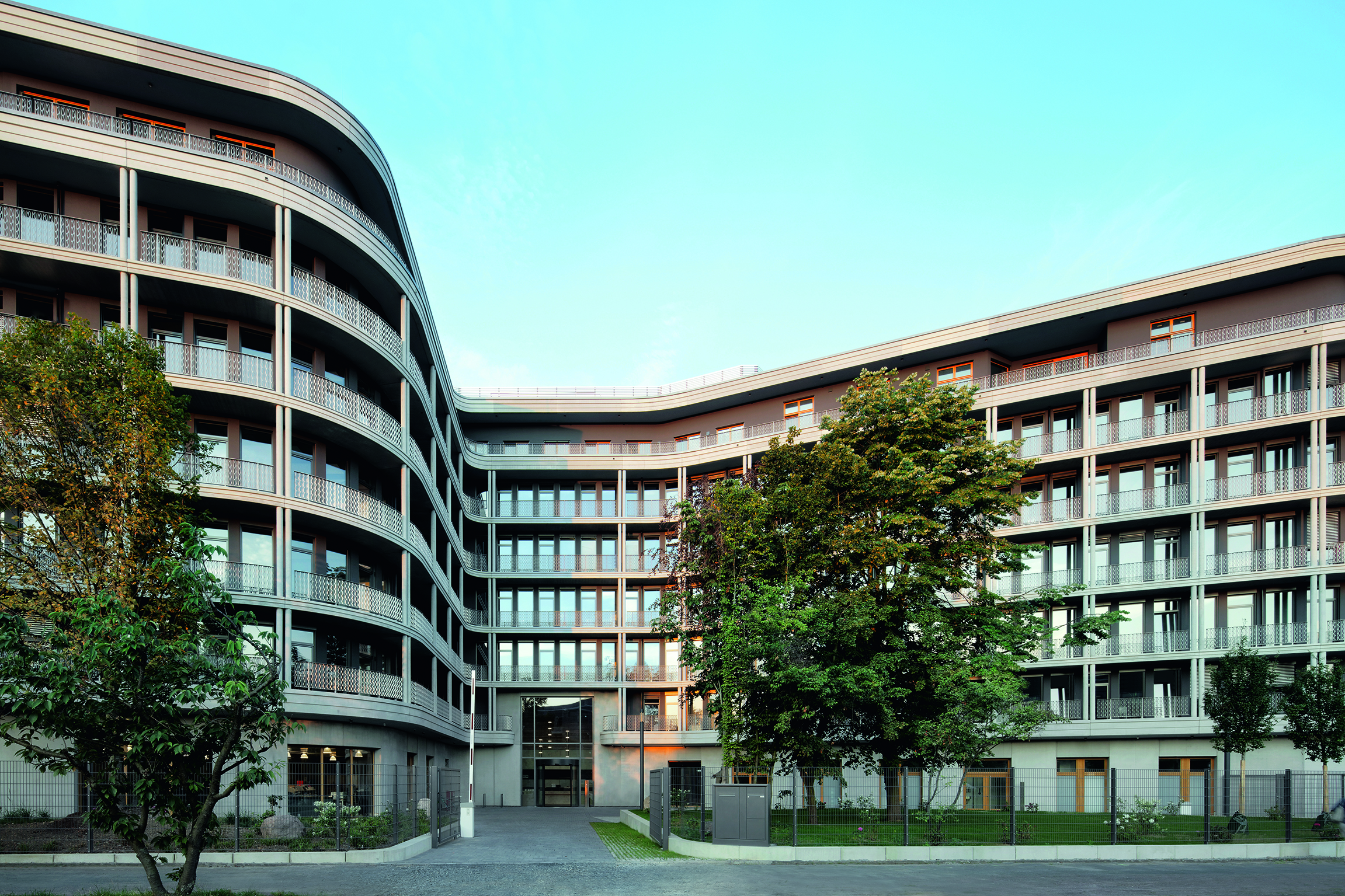 The six-storey newbuild designed by Format Architektur | Hatzfeld + Moster has an L-shaped floor plan with rounded edges. At Dr.-Simons-Straße to the north, the building opens out onto a prestigious, landscaped forecourt, from which the entrance hall is accessed via a glazed revolving door. To the southwest, the structure is connected to the neighbouring existing buildings.