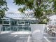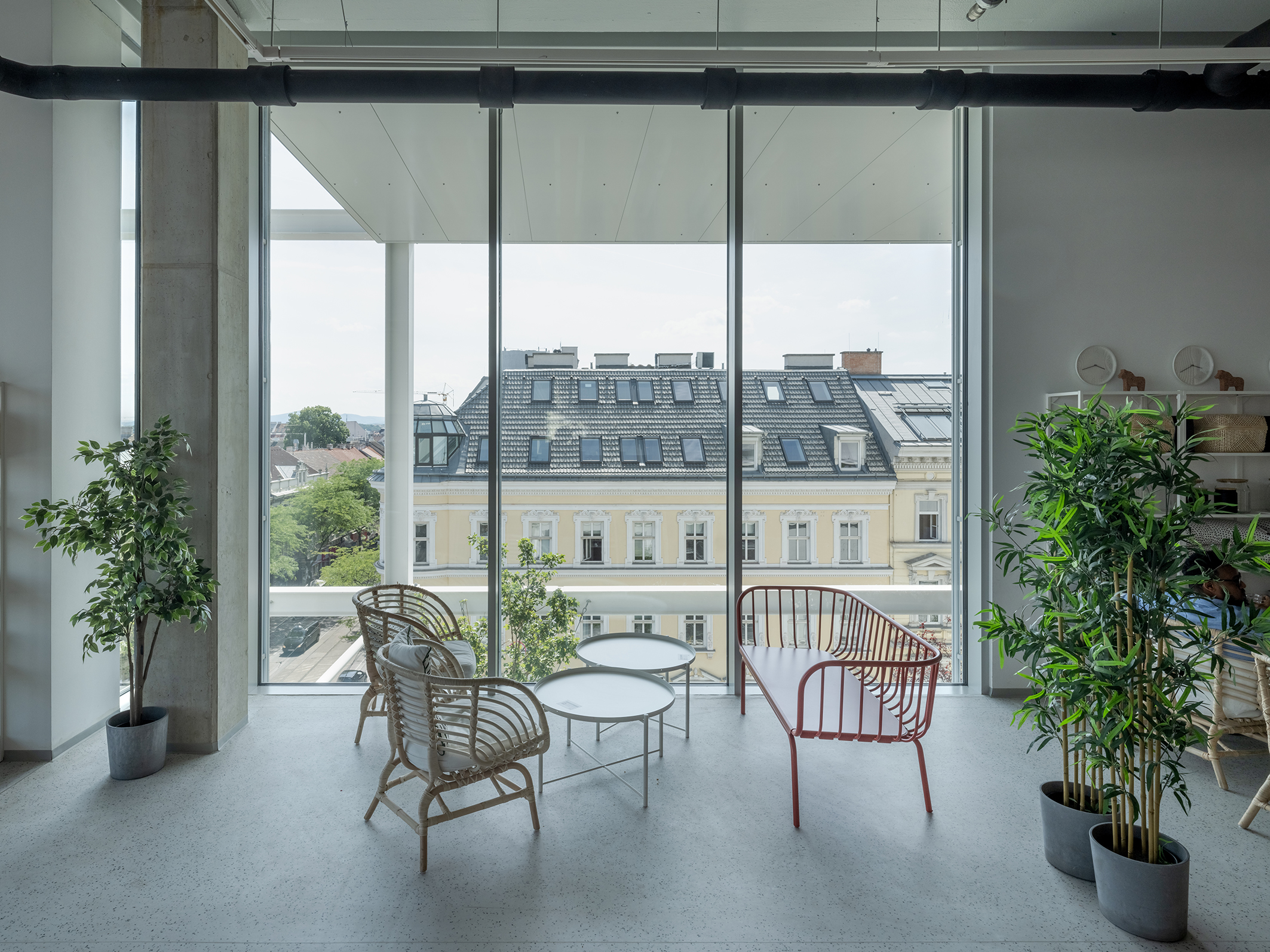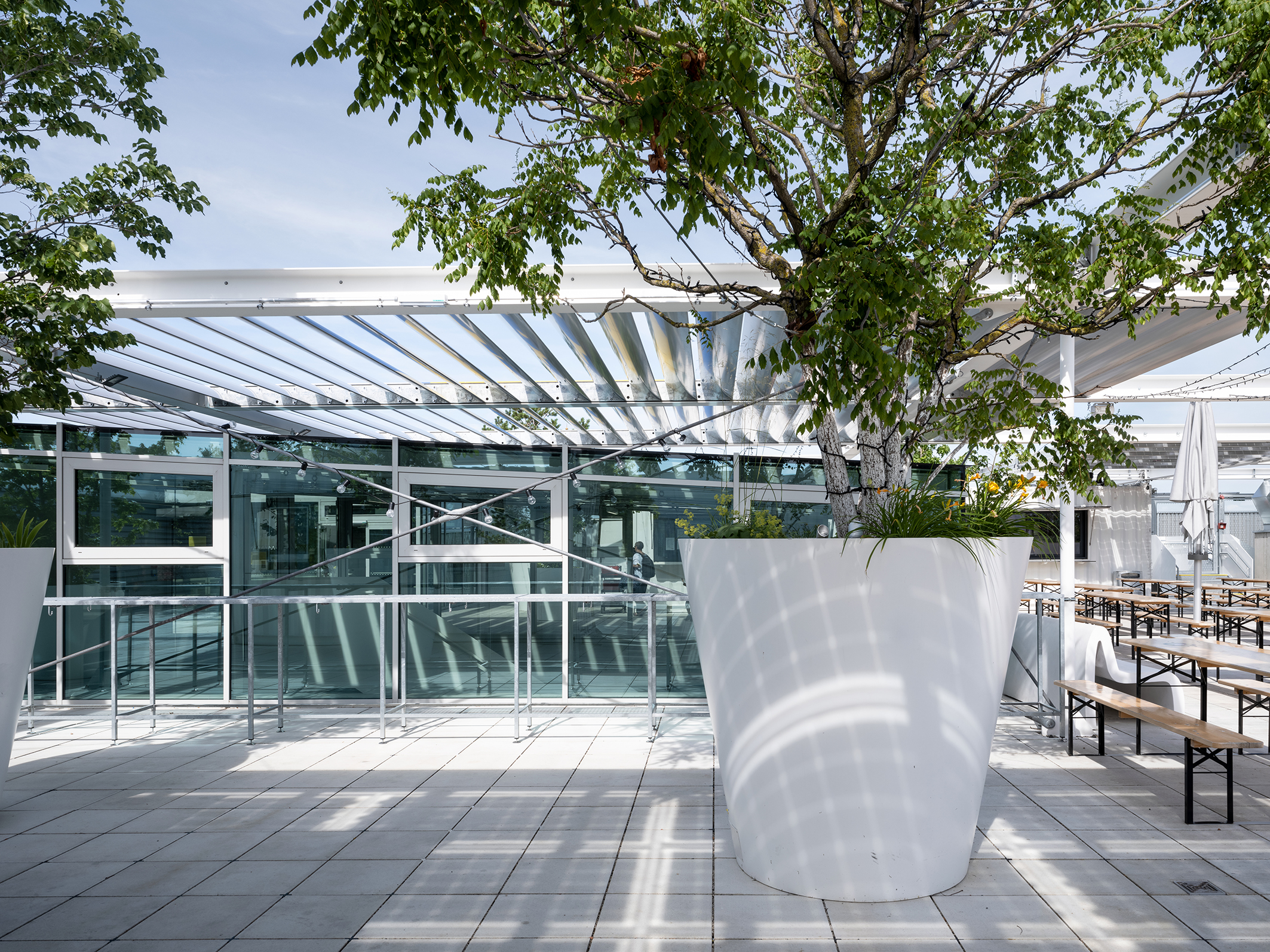 Den wohl größten Anziehungspunkt für die Öffentlichkeit haben die Architekten jedoch auf dem Dach geschaffen. Hier setzt sich das eindrucksvolle, weiß lackierte Stahlskelett als offene Pergola fort, die hier und da gefüllt ist mit schattenspendenden Lamellen und Solarpaneelen. Darunter erstreckt sich eine öffentlich zugängliche Terrasse über die ganze Dachfläche. Von hier aus können Besucher die Blicke schweifen lassen über die Wiener Innenstadt und die Hügelketten rund um die österreichische Hauptstadt.