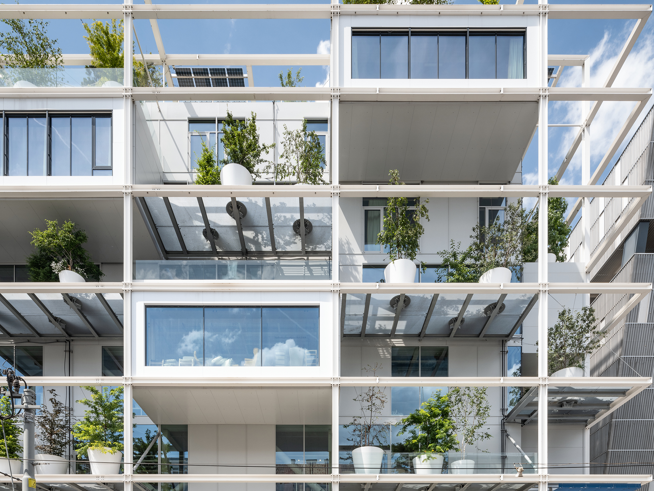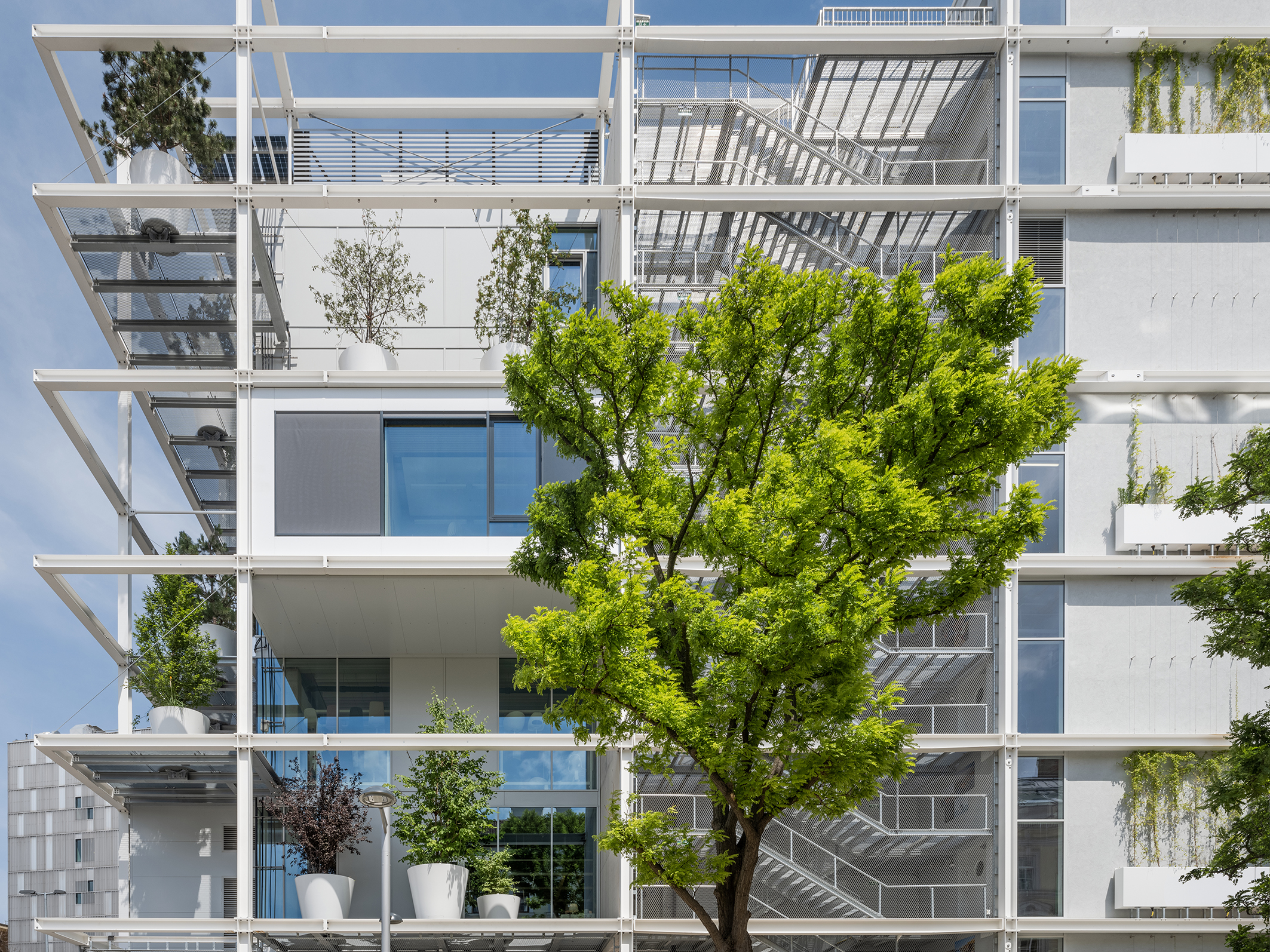 Insgesamt 160 Bäume wachsen auf und am Gebäude in bis zu 1,90 m hohen Blumentöpfen aus weiß lackiertem Stahl. Jeder von ihnen wird von einer automatischen, sensorgesteuerten Bewässerungsanlage versorgt, um auf den individuellen Wasserbedarf reagieren zu können.