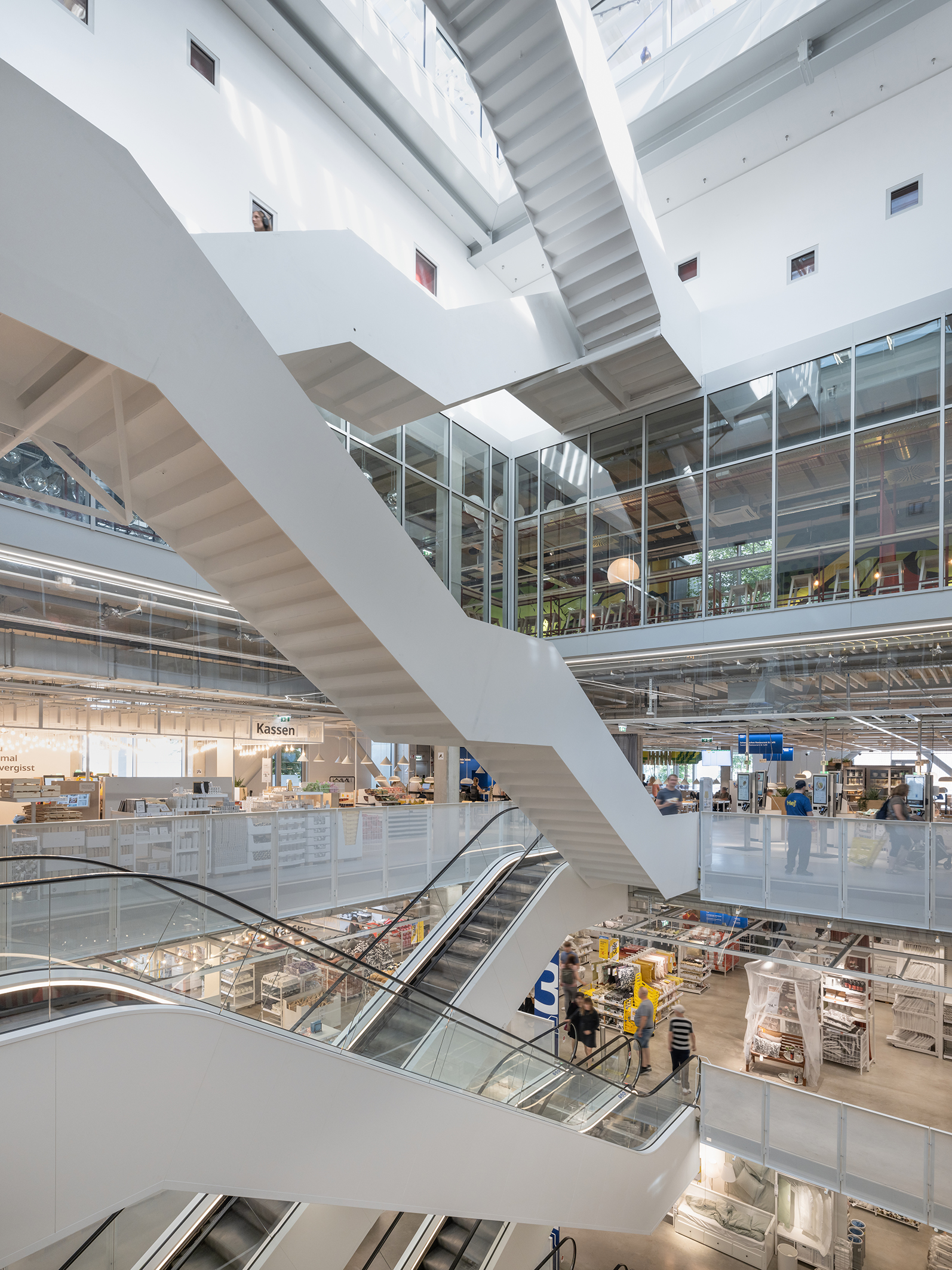 Die Offenheit, die das Haus nach außen signalisiert, setzt sich auch im Inneren fort. Hier belegt IKEA mit seinen Ausstellungsflächen, der Warenanlieferung und dem obligaten Restaurant die vier unteren Ebenen. In einem zentralen Atrium zirkulieren Rolltreppen bis hinauf ins 4. Geschoss. Weiter nach oben ins Hostel und zur Dachterrasse geht es über herkömmliche Treppenläufe oder alternativ mit dem Lift.