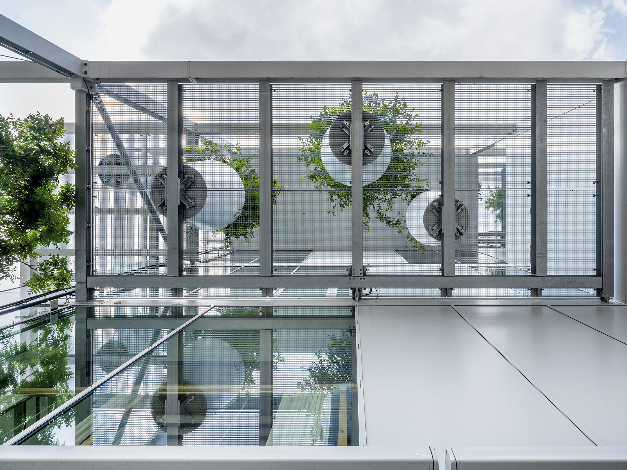 Für die eigentliche Gebäudehülle hinter dem Stahlregal wurde das mit Cradle to Cradle Silber zertifizierte Pfosten-Riegel-System FWS 50.SI von Schüco gewählt. Darin wechseln sich Glasflächen mit geschlossenen Paneelen ab, die außen mit weißem Stahlblech und innen mit Gipskartonplatten verkleidet sind. „Die Pfosten-Riegel-Fassade war ein Vorschlag des Generalunternehmers“, erinnert sich Jakob Dunkl. „Gegenüber der Sonderanfertigung, die wir ursprünglich im Sinn hatten, bietet sie viele Vorteile – etwa hinsichtlich Dichtigkeit und Gewährleistung. Außerdem ist das System flexibel genug, dass der Bauherr relativ spät noch entscheiden konnte, wo er geschlossene Paneele platzieren wollte und wo Glasflächen.“