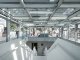 An die Stelle des 4,50 m tiefen Stahlregals tritt im Inneren des Hauses ein Stahlbetonskelett mit rund 10 m Spannweite. Durch die großen Stützenabstände lassen sich die Flächen flexibel nutzen und immer wieder anders möblieren. Sichtbetondecken mit offen geführten Leitungen, Böden aus flügelgeglättetem Beton und Estrich ohne zusätzlichen Belag, weiß lackierter Stahl und viel Glas sind die dominanten Materialien in den Innenräumen.