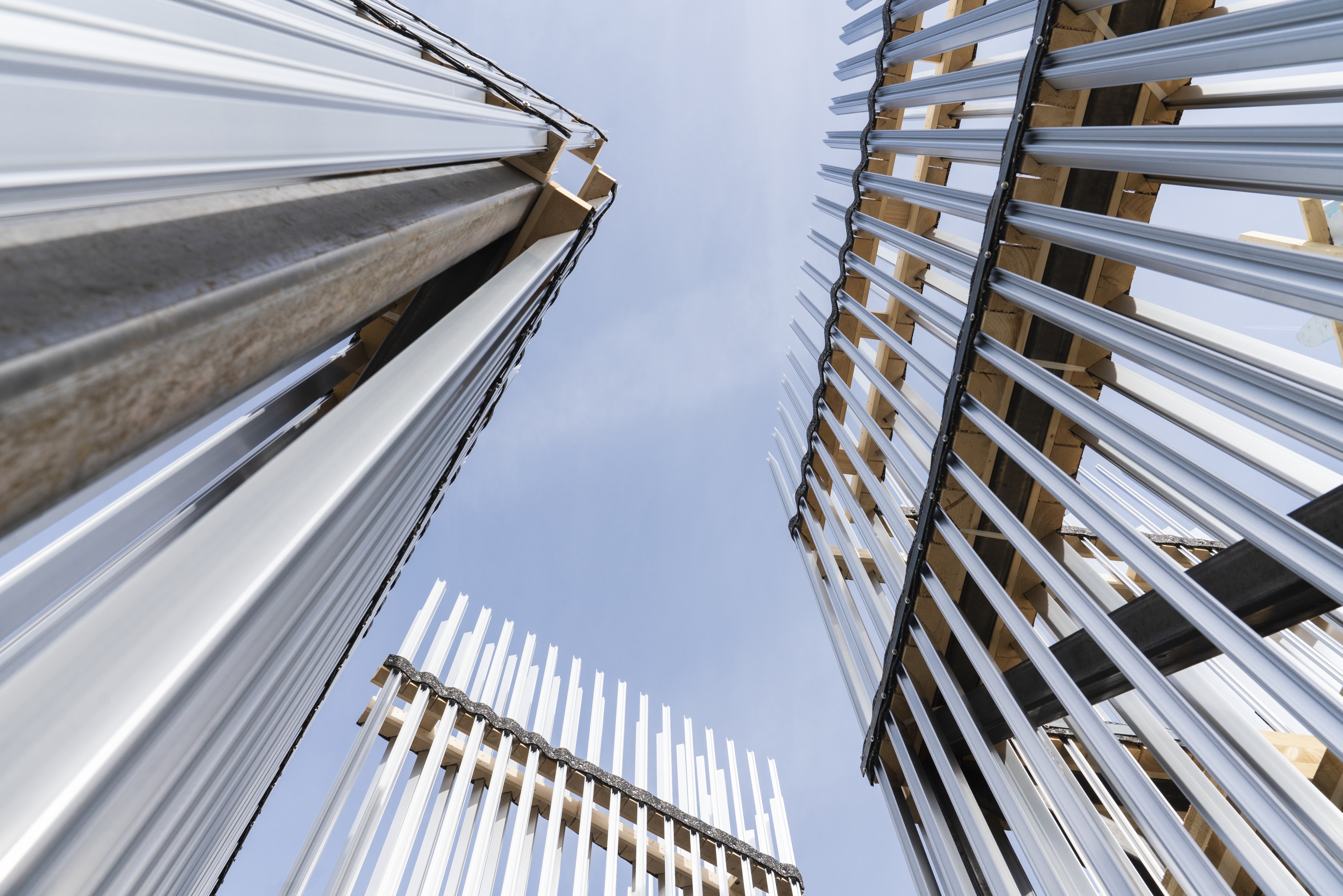 Der Info-Pavillon des Hamburger Architektur Sommers 2023 stellt Überlegungen des nachhaltigen und ressourcenschonenden Bauens in den Mittelpunkt. Er ist dabei Infopunkt, Kunstinstallation und Anschauungsobjekt für zirkuläres Bauen zugleich. Im kreativen Ansatz des Künstlerkollektivs umschichten wurden Leihgaben und Materialspenden zur grundlegenden Gestaltungsprämisse. Konkret in Form von 500 sechs Meter langen Aluminiumprofilen von Schüco und ca. 20 Tonnen Ausschnitten aus Brettsperrholz-Wandelementen von Derix, die als begeh- und erfahrbare Installation die Materialien Holz und Aluminium physisch erlebbar machen. Lukasz Lendzinski von umschichten beschreibt die Botschaft der Installation als Einladung, den Wert von Material als Ressource erlebbar zu machen. „Material ist eine wertvolle Ressource, die einen behutsamen Einsatz verdient hat, um möglichst lange im Kreislauf bleiben zu können“, so Lendzinski.
