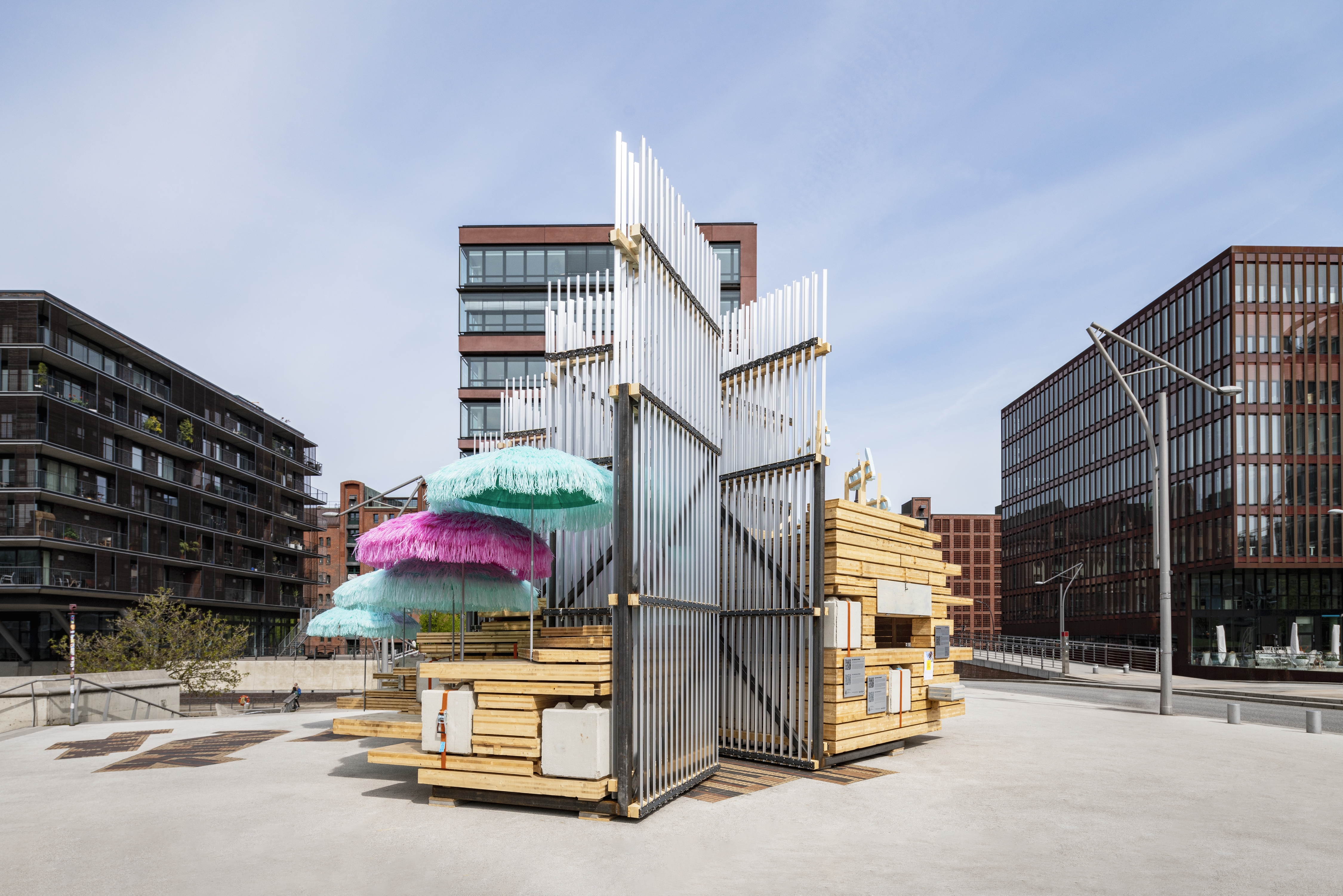 Die Installation auf dem Hamburger Architektur Sommer ermöglicht dabei Zirkularität als etwas zu begreifen, das einen wichtigen Baustein in der Baukultur von heute darstellt. Anstelle eines pragmatisch gebauten Raumes mit vier Wänden, lässt das Material in einer künstlerischen Zuspitzung imaginäre Räume aus den Fragmenten entstehen und völlig neue Konfigurationen zu. So entsteht eine raumgreifende Skulptur, die von der Bühne bis zur Sitzgelegenheit zahlreiche Nutzungsmöglichkeiten bietet.