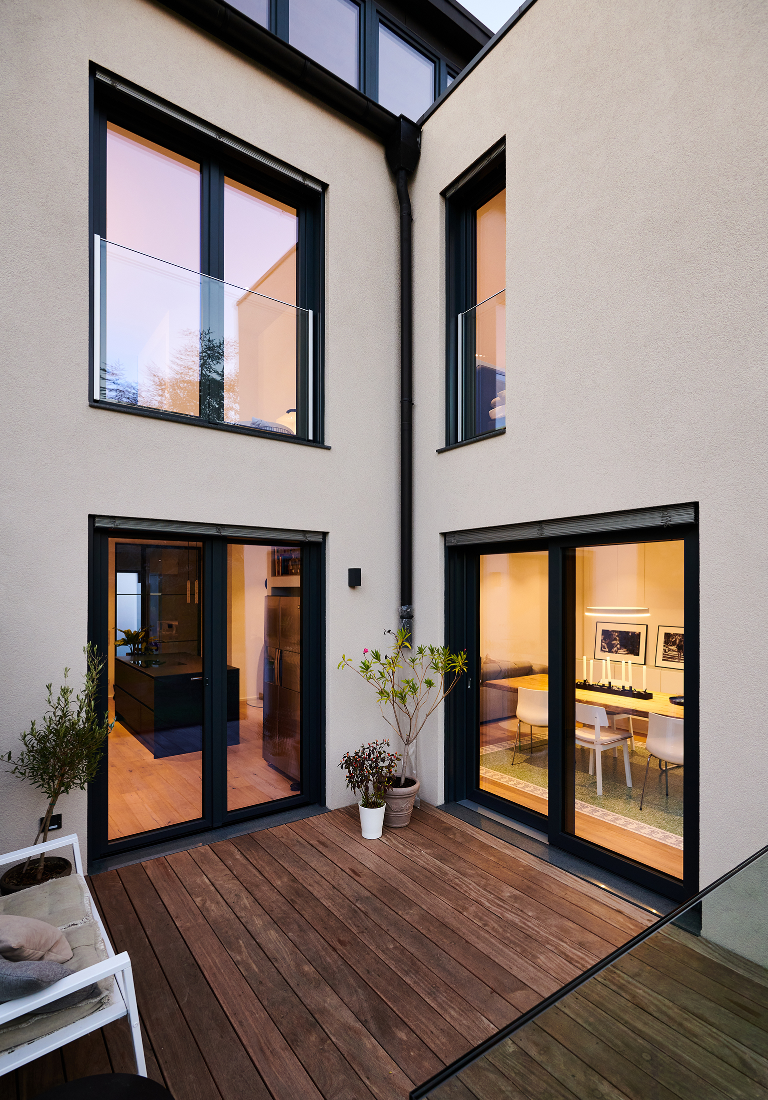 To create more living space, Christian Richter proposed adding an extra floor as well as a two-storey extension at the rear of the building. As a result, the architect increased the living space from the original 120 square metres to 180 square metres and completely redesigned the garden façade in the process as well. Viewed from the street, only minor changes have been made so that the façade does not stand out from the neighbouring properties. Richter explains: "Although we have retained the small windows on the front façade, we have upgraded them. As the building lives from the inside out, we have created views to match. This has obviously resulted in some different openings than there used to be." PVC-U windows from the Schüco LivIng system have been used throughout. There is one large opening vent and one small fixed unit on the street-facing façade of the townhouse. Their slimline, anthracite grey frames are embedded in a brightly plastered façade with deep reveals.