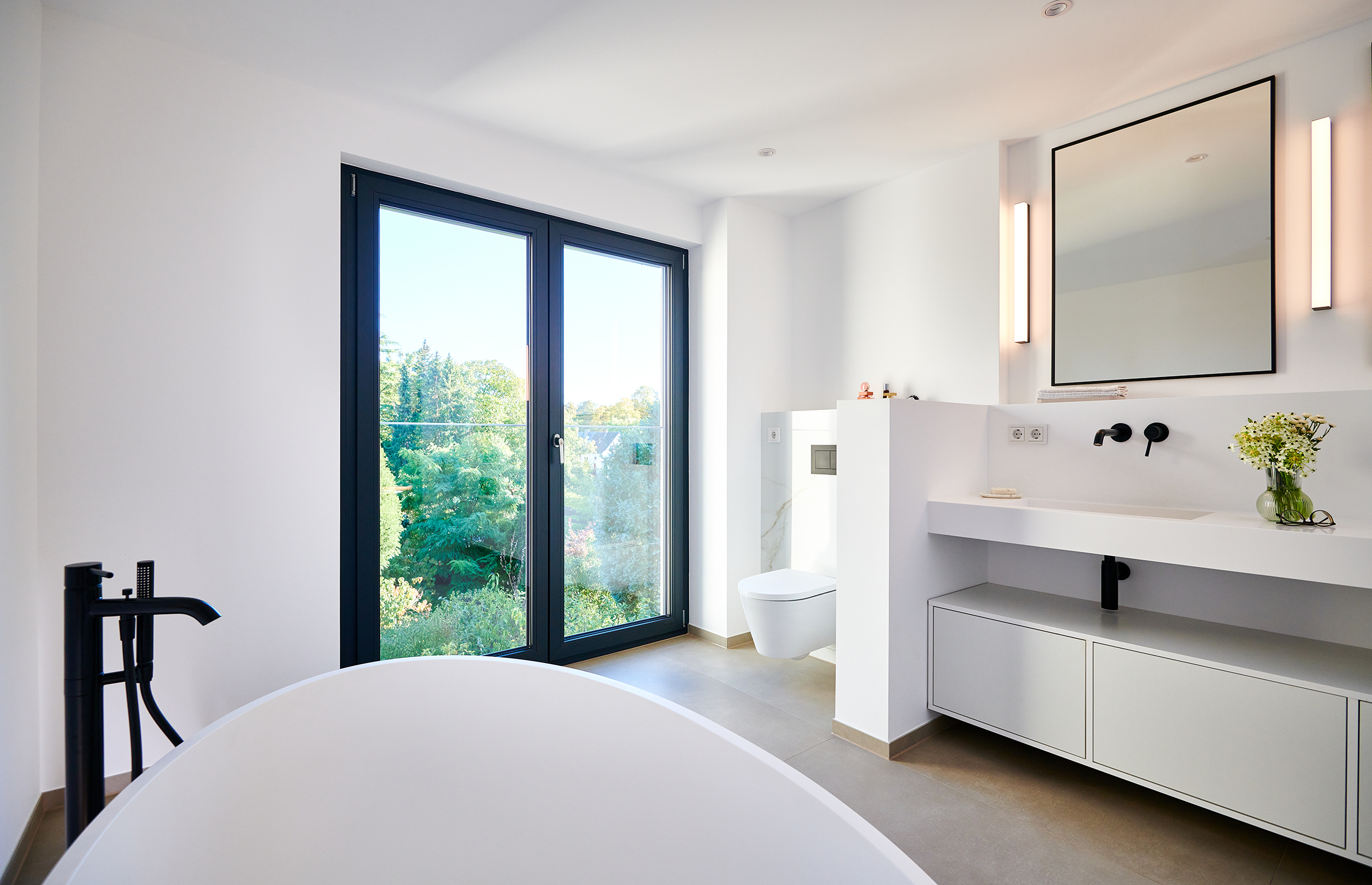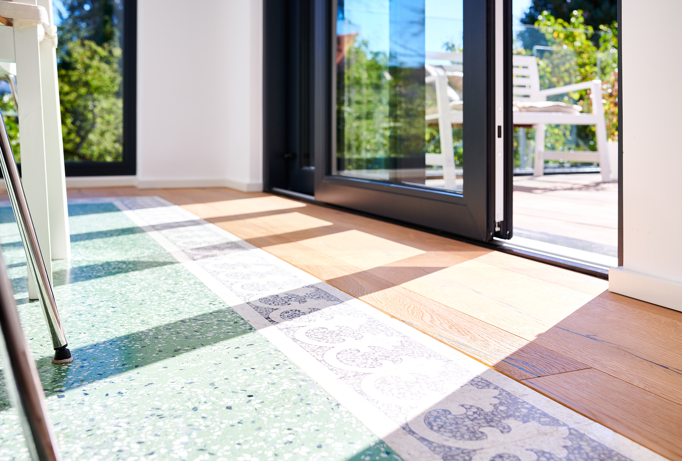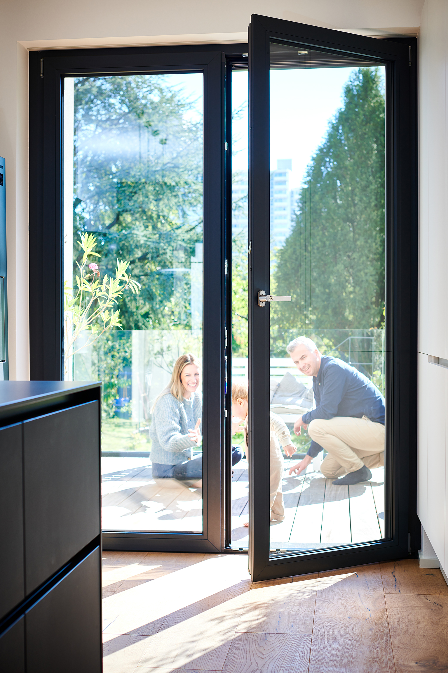 On the garden side of the building, the architect had a different aim for the design: the whole house opens up. Where there used to be balconies, the house has now been extended out by one metre for the kitchen on the ground floor and the bathroom upstairs. Three metres wide and four metres deep, the protruding extension adjacent to it houses sections of the living room and the parents' bedroom. From the living room, you can access a small, steel terrace through a lift-and-slide door from the PVC-U Schüco LivIngSlide system, while the garden can be reached from the terrace via a steel staircase in matching anthracite grey. Access from the kitchen to the balcony is also via a Schüco LivIngSlide Loft door in the same colour, RAL 7016. "To simply open the door, step outside and breathe in the fresh air – it was really important to me to be able to extend the kitchen and living space outside," says the client. "When you set foot inside the house, you look straight into the garden through the kitchen and Loft door. It gives the space enormous depth!" One reason the clients opted for PVC-U windows and sliding doors was the outstanding thermal insulation values combined with the excellent value for money that they offer. However, the design was also pivotal in their choice. Kerstin Kuck: "We wanted the whole frame to have just one colour on the inside, for example. The Schüco series made this possible."