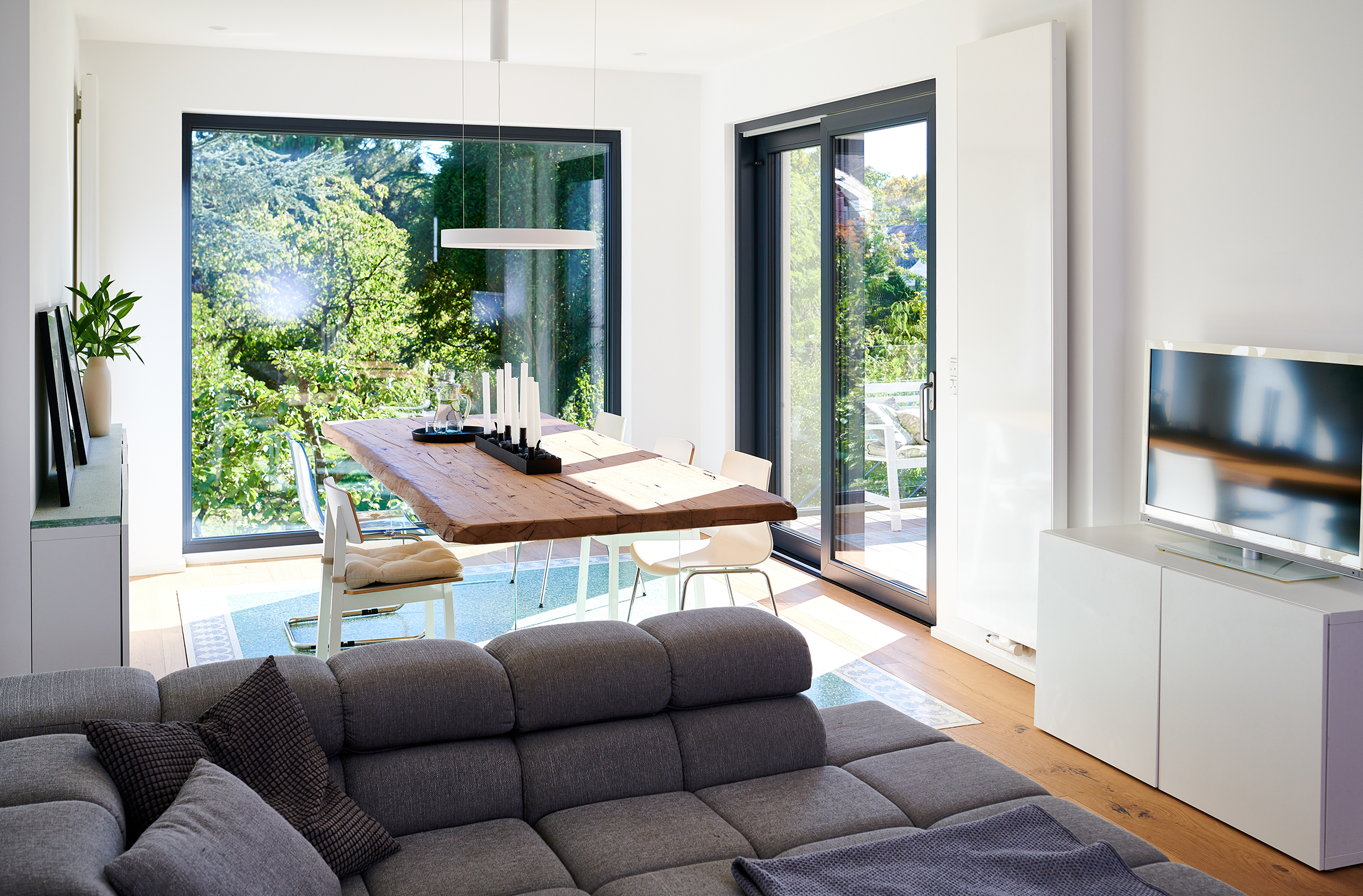 In the rear façade, the two floor-to-ceiling fixed openings also create a link with the outdoors: two window units measuring around 2.3 x 2.3 metres from the Schüco LivIng system. They frame a view that changes according to the time of day and the season, creating a different atmosphere inside the home. "It's wonderful waking up to this view of the garden and looking at the greenery and fruit trees from the dining table," the client gushes, before adding: "Schüco products strike a great balance between visual appeal and cost-effectiveness. We're really pleased with them."