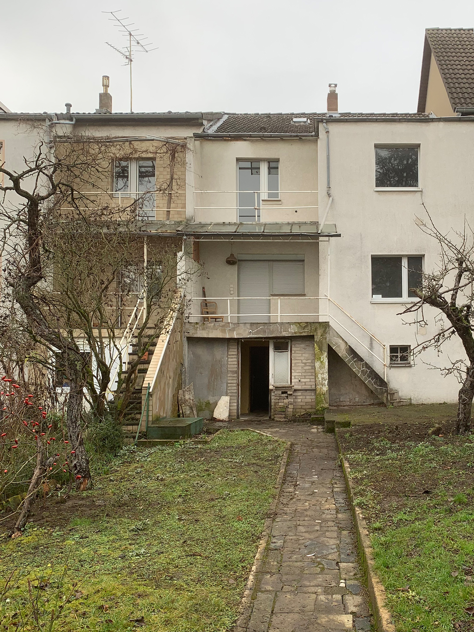 The townhouse, which had belonged to Dominic Kuck's grandmother until ten years ago, is located in a large, trapezium-shaped block of houses in the district of Poll on the left bank of the Rhine, close to the city centre. The river is just a few hundred metres away; you can catch a glimpse of it from the front garden. On the southeast side at the rear, the terraced house borders an eight-metre wide and about 50-metre deep garden containing old fruit trees. It is surrounded on all three sides by other private gardens, some of which are very leafy.