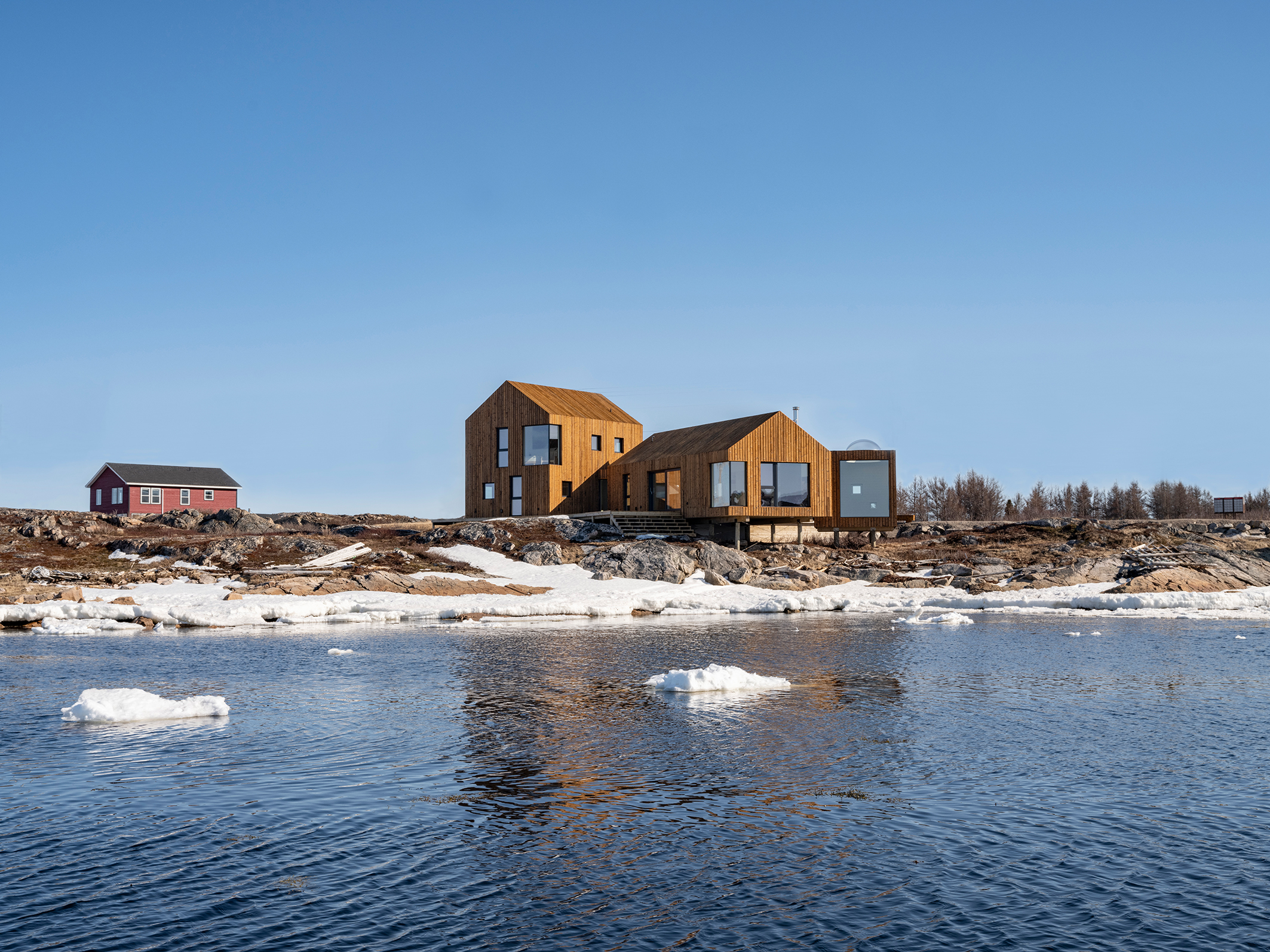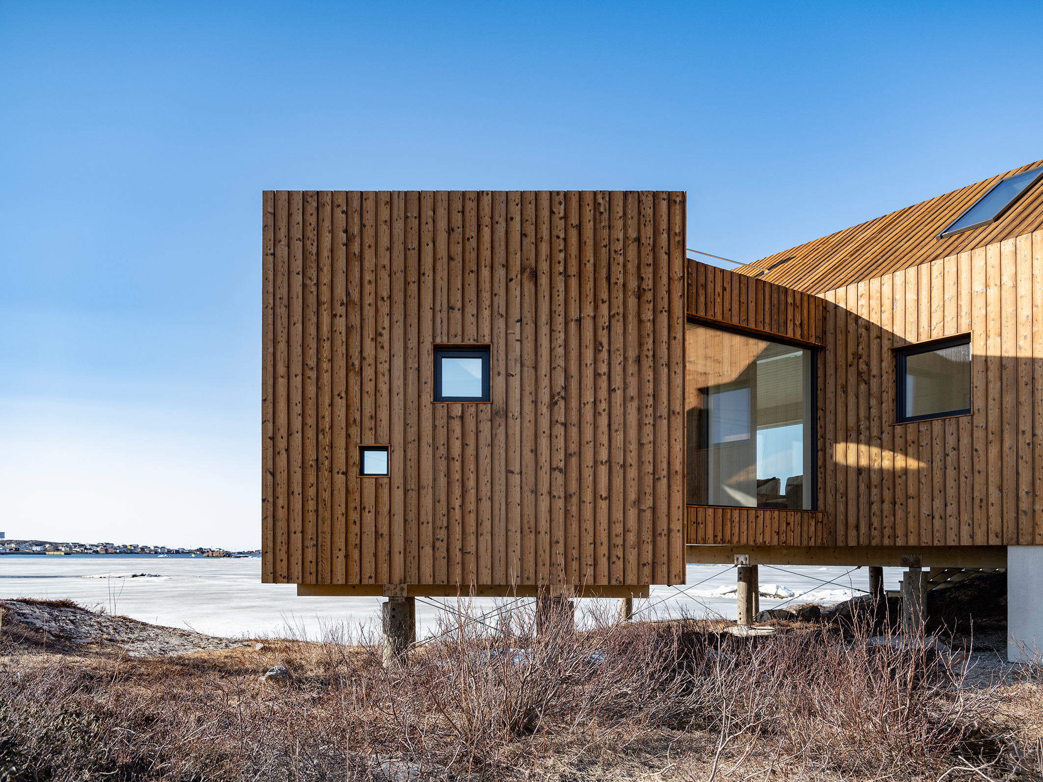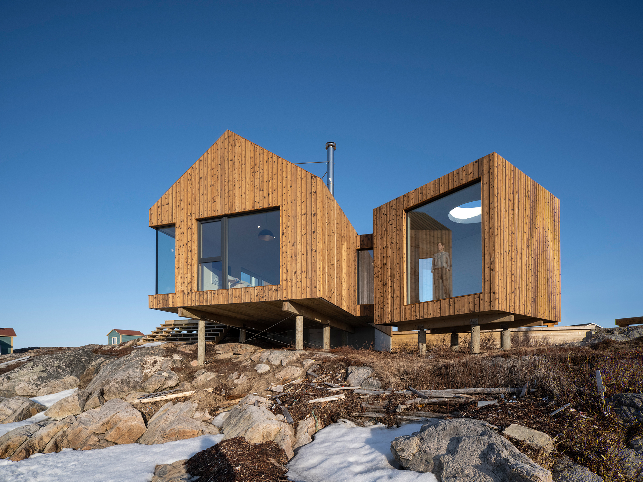 Auffallend modern gibt sich ein Neubau in dem kleinen Dorf Joe Batt’s Arm, geplant und realisiert von Architekt Kingman Brewster. Brewster stammt aus New York und zog vor über zehn Jahren mit seiner Familie von Brooklyn (NY) nach Fogo Island. Beabsichtigt war ein Aufenthalt von ein paar Monaten, doch die Familie blieb. Seitdem verbindet Kingman Brewster sein zeitgenössisches Gespür für Design und Komfort respektvoll mit seiner Wertschätzung für die lokale Architektur. Dies ist auch ganz offensichtlich bei diesem Einfamilienhaus zu erkennen: Teilweise auf Pfähle gesetzt scheint das Gebäude über der felsigen Landschaft zu schweben. Es wirkt dadurch leicht, wie ein sanfter Fußabdruck auf flechtenüberzogenem Gestein. Die Stelen sind einerseits praktisch, um in dem unebenen Gelände zu bauen, gleichzeitig sind sie eine Hommage an die typischen Holzhäuschen, in denen heimische Fischer ihren Fang verarbeiten.