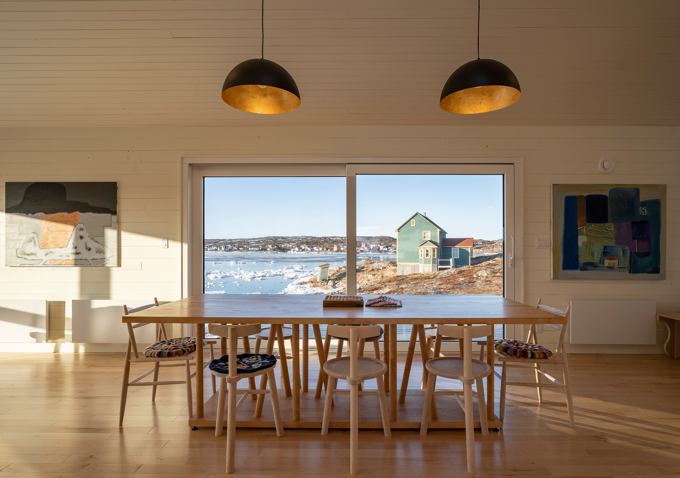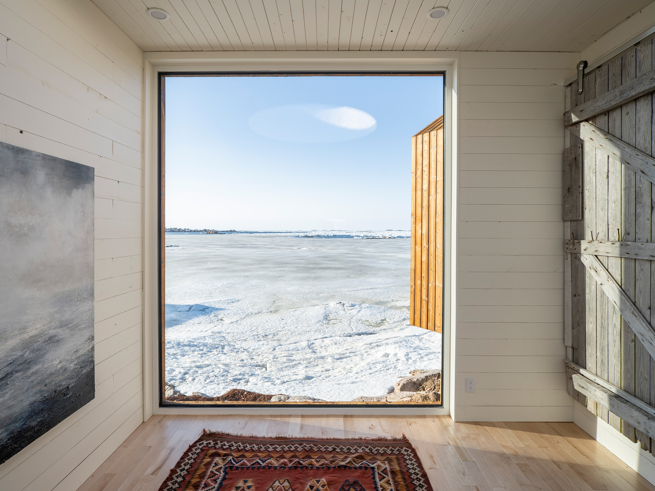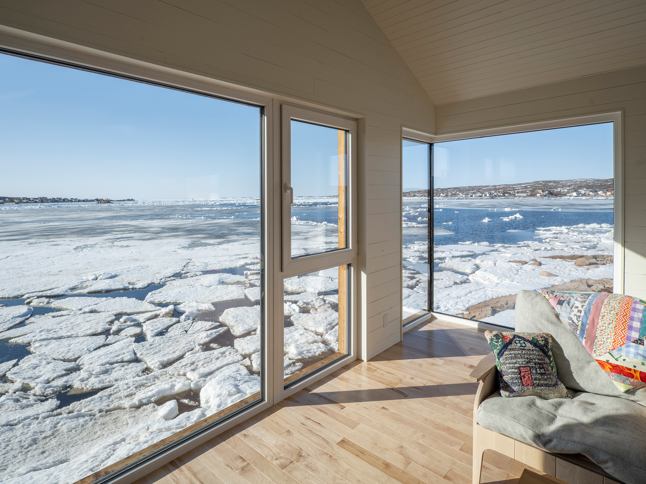 Große, bewegliche Fensterflügel sind bei dem oft starken und kalten Wind auf Fogo Island nicht funktional, so fiel die Wahl an zwei Stellen im Haus auf großformatige Festfelder. Dafür kam das Schüco Aluminium-Fenstersystem AWS 75.SI+ (Super Insulated) zum Einsatz. Dank besonders schmaler Profile verbindet es optische Leichtigkeit mit der hohen Stabilität von Aluminium. Da festverglaste Fenster nicht das Gewicht eines beweglichen Öffnungsflügels tragen müssen und auch keinen Öffnungsspielraum im Inneren benötigen, können sie groß ausfallen – wie hier u.a. in einer Dimension von 2,4 m x 2,8 m.