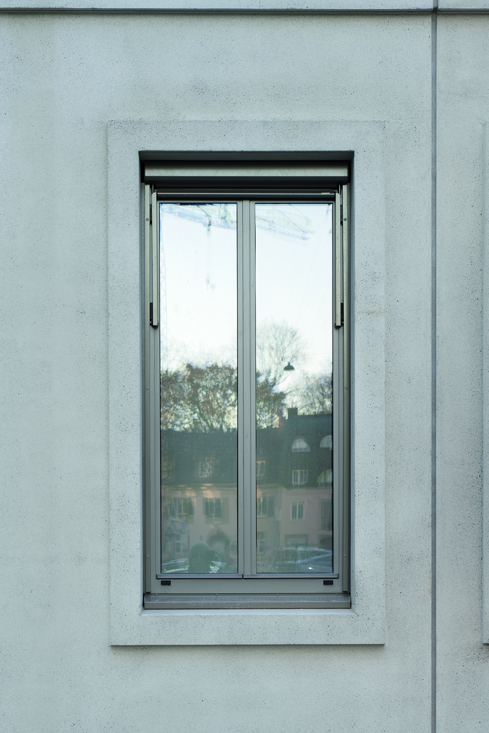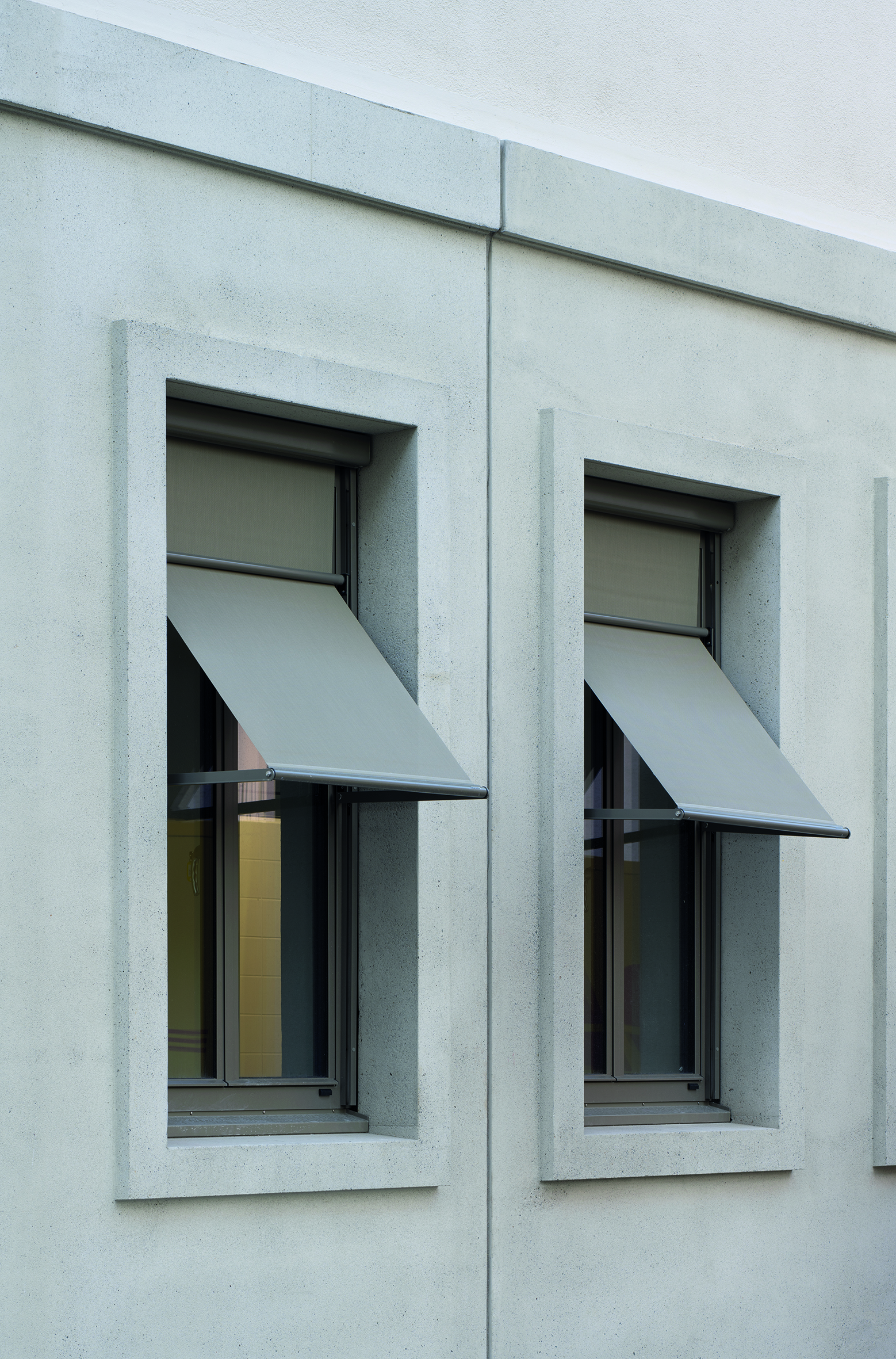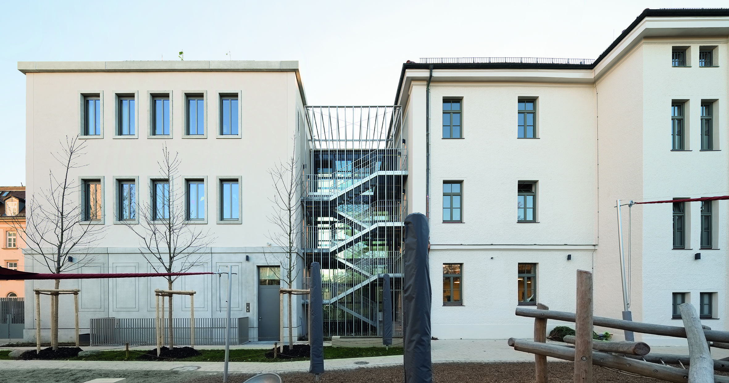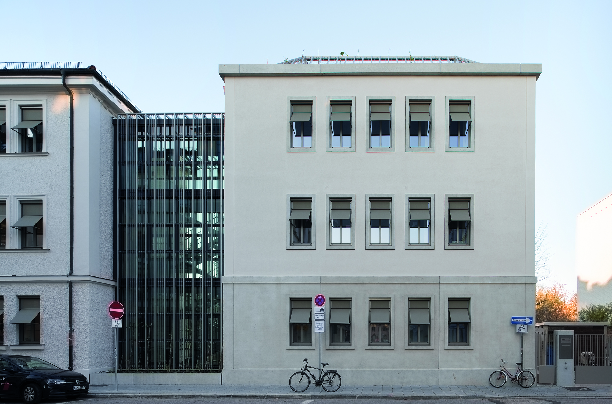 Eine monochrome Farbgebung charakterisiert die schlichte Fassade des Altbaus. Je nach Geschoss und Bauteil unterscheidet sie sich lediglich durch eine differenzierende Körnung des Putzes. Um diesen Status zu erhalten, wurde das Gebäude von innen heraus statisch ertüchtigt: in den (mit Ausnahme der Deckenbalken) vollständig entkernten Altbau wurde ein Stahlbetonskelett als Tragstruktur eingebracht. Der Neubau bezieht sich in Größe, Proportion, Gliederung und Detailausbildung auf den Bestand. Zwischen beiden Baukörpern sitzt das neue Fluchttreppenhaus, ausgebildet als geschossübergreifende, vollverglaste bauliche Fuge aus dem Profilsystem VISS TVS von Schüco Stahlsysteme Jansen. Das voll isolierte Stahlsystem zeichnet sich trotz großer Wandungsstärken durch extrem kleine Kantenradien aus. Rein optisch gesehen trennt diese Fuge den Altbau vom Neubau; funktional beherbergt sie jedoch die Flure, die die beiden Gebäudeteile miteinander verbinden. Die Fassade des Neubaus greift die differenzierende Putzstruktur des Altbaus mit zeitgemäßen Mitteln auf: Erdgeschoss und Fensterlaibungen sind mit einem farblich dem Bestand angeglichenen, gestrahlten Weißbeton verkleidet; die Wandflächen der Obergeschosse weisen unterschiedliche Putzkörnungen auf.