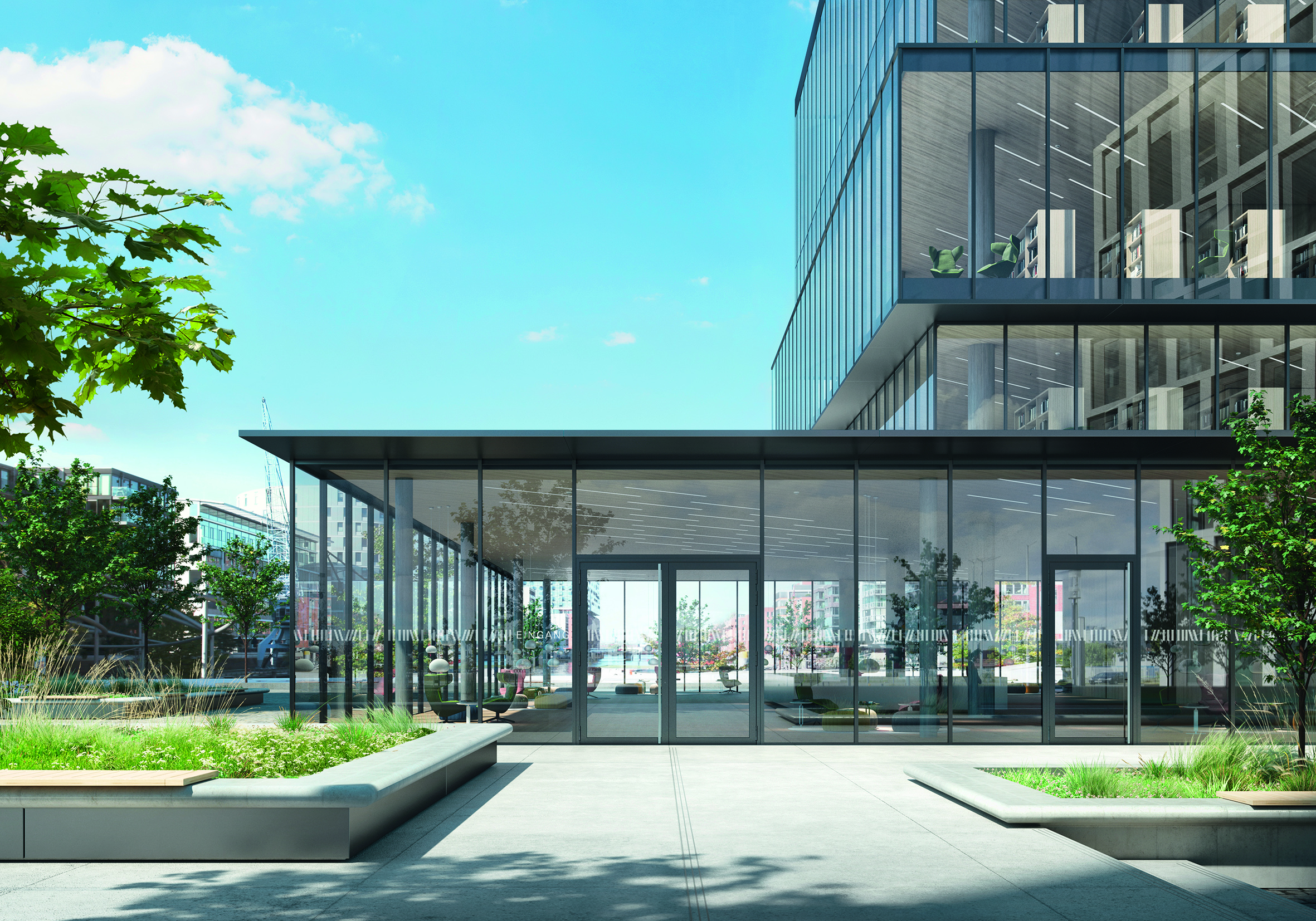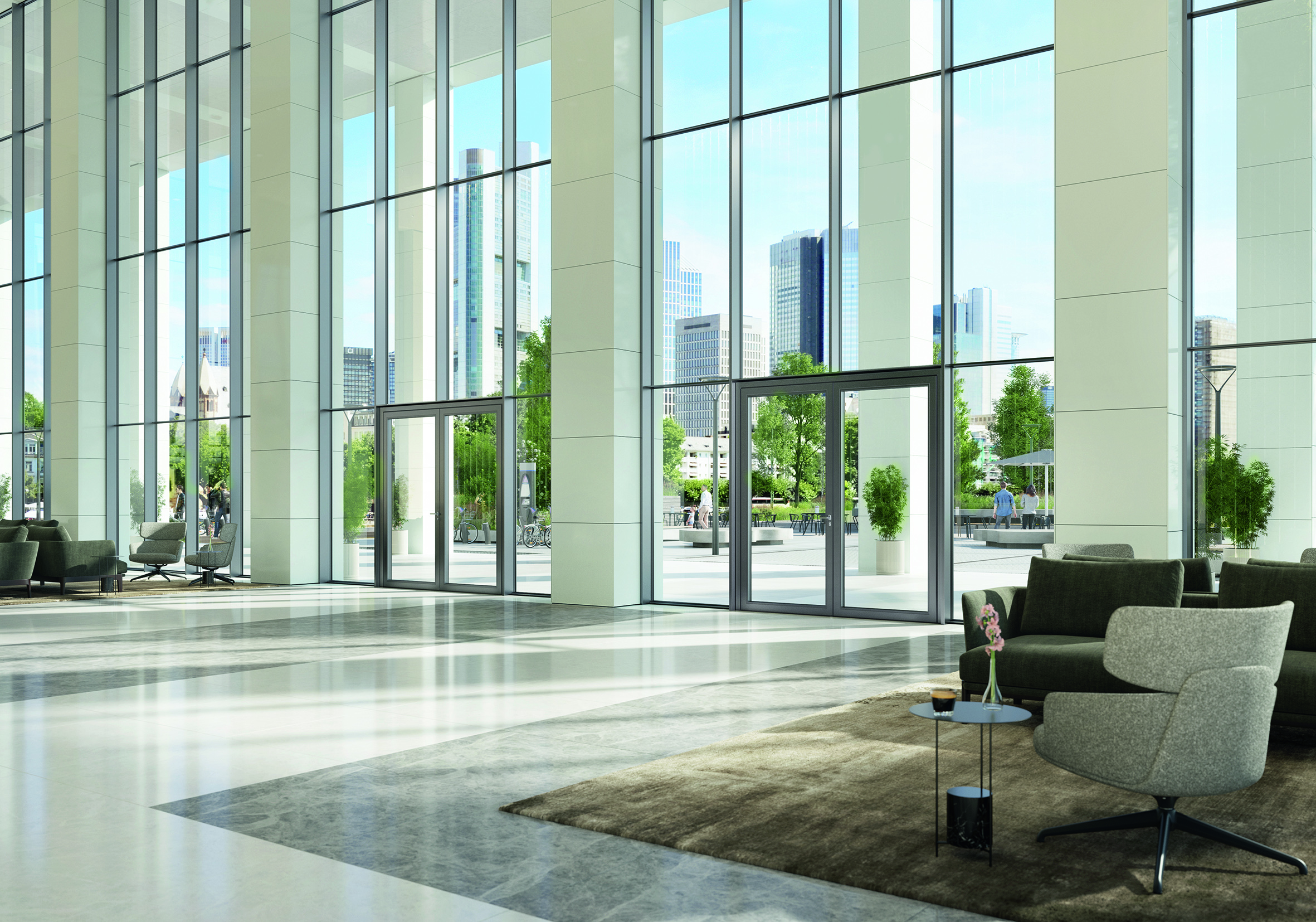 Mit Schüco AD UP 75 Commercial vereinfacht der Bielefelder Gebäudehüllenspezialist den Planungs- und Fertigungsprozess von Türen und reagiert damit auf den steigenden Fachkräftemangel. Ein reduzierter Materialeinsatz bei hoher Gleichteileverwendung minimiert die Lagerhaltung und gestaltet die Auswahl der einzelnen Bestandteile übersichtlicher. Das spart Kosten und Zeit - und macht Arbeitsabläufe effizienter. Gleichzeitig senkt ein geringer Materialverbrauch auch den GWP-Wert (Global Warming Potenzial). Nachhaltig ist auch eine lange Lebens- und Nutzungsphase von Türelementen. Denn wechselnde Nutzungsanforderungen können einfach bei laufendem Betrieb realisiert und das eingebaute Türsystem flexibel darauf angepasst werden. Die Eingangstür AD UP 75 Commercial mit ihrem 3-Kammer-Flügel bietet skalierbare Dämmwerte, um maßgeschneidert auf individuelle Projektbedürfnisse zu reagieren. So ist auch Rauchschutz möglich, beispielsweise für offene Treppenhäuser oder Laubengänge. Trotz geringer Komplexität punktet die AD UP Commercial mit den gewohnten Systemeigenschaften der Plattform: hohe Dichtigkeit, Barrierefreiheit dank der Nullschwelle und Einbruchschutz bis RC 3 – auch mit der Panik- und Teilpanikfunktion.