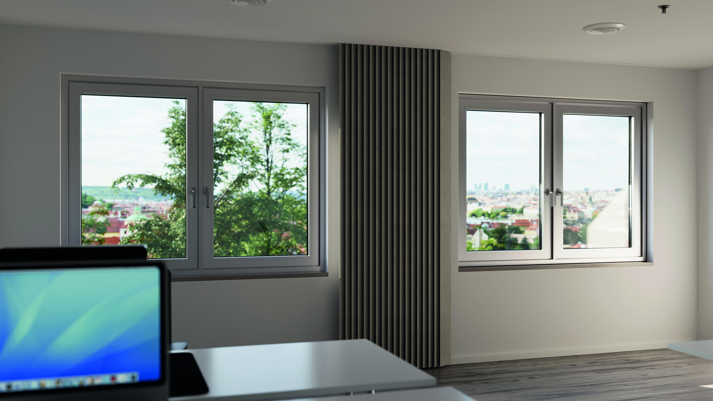 Für die Kernsanierung im laufenden Betrieb bietet Schüco objektspezifische Lösungen für eine Zweite-Haut-Fassade. Mit Hilfe von Lisenen wird vor die bestehende Altfassade eine neue, funktionale Fassadenebene mit Warm- und Kaltbereichen montiert. Die alten Fensterelemente werden nachträglich ausgebaut. Durch diese förderfähige Sanierungsmaßnahme entstehen keine Kosten durch Mietausfälle oder Arbeitszeitverlust und gleichzeitig wird das Lärmaufkommen während der Sanierung geringgehalten.