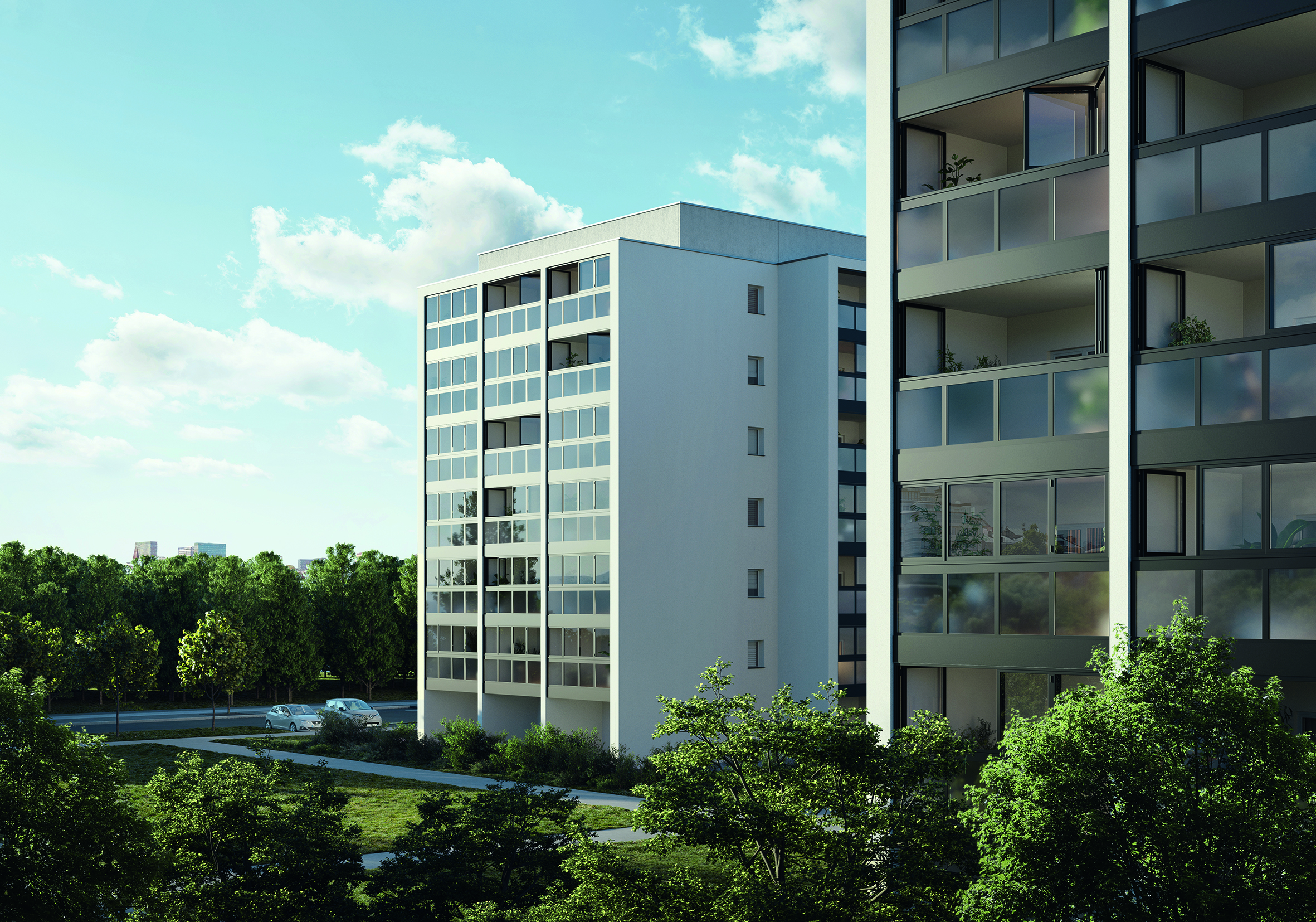 Wenn Ertüchtigung und Elementtausch nicht ausreichen, um den Wert der Gebäude zu erhalten oder zu steigern, ist eine Kernsanierung notwendig. Auch dafür hat Schüco ein breites Portfolio bestehender und neuer Produkte. So bietet das Systemhaus für die Kernsanierung oder Nutzungserweiterung eine Balkonsanierungs-Verglasung mit einem Faltschiebesystem: Schüco AS FD. Hohe Wärmeverluste über Balkone und Fassaden können eine Balkonsanierung erforderlich machen. Diese Sanierung ist häufig aufwändig und teuer. Mit dem wärmegedämmten Schüco Faltschiebsystem in Form von Fensterbändern kann die Gebäudehülle energetisch und kostengünstig saniert werden. Die Schüco AS FD fungiert dabei als thermische Gebäudehülle ohne die Balkonnutzung einzuschränken und ermöglicht sogar, je nach Baurecht, einen Zugewinn von Wohnraum.