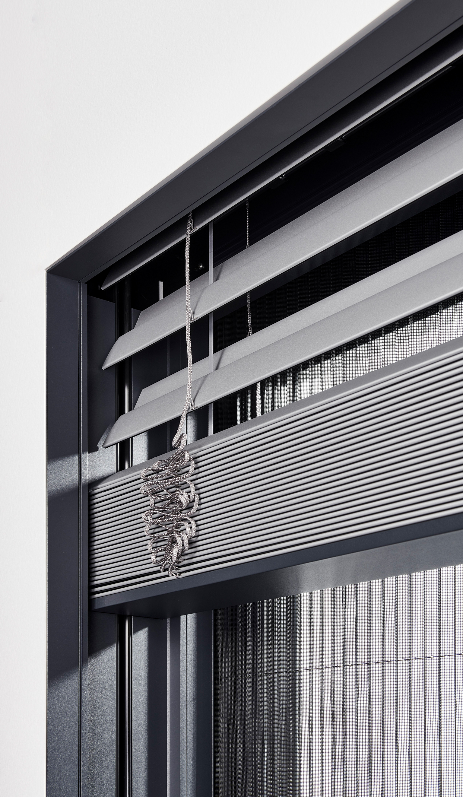 Schüco Perfect besteht aus einem Fenster- oder Schiebeelement und einem vorgesetzten „Perfect-Modul“ aus Aluminium. Dieses ist in 130 mm und 190 mm Systembautiefe der seitlichen Führungsschienen verfügbar, so dass je nach Bauvorhaben und individuellen Wünschen unterschiedliche Add-Ons gewählt und beliebig miteinander kombiniert werden können. Dafür stehen unter anderem drei Sonnenschutzvarianten zur Verfügung: Raffstore (für eine gezielte Lichtlenkung), Rollläden (für eine perfekte Verdunklung der Räumlichkeiten) oder der textile Sonnenschutz Zip Design Screen (für eine individuelle Farbgestaltung). Für Wohnbauten bis 200 m² ist ab sofort eine funkbasierte Steuerung per Fernbedienung oder App umsetzbar. Alle Sonnenschutzvarianten können zeit- oder sensorgesteuert auf die jeweiligen Wetterverhältnisse reagieren und automatisch in die optimale Position fahren. Neben dem Sonnenschutz kann ein Insektenschutz als vertikales Rollo oder als horizontales Plissee installiert werden. Als Bodenabschluss kann das Modul mit einer Designfensterbank, einer Absturzsicherung in Form einer integrierten Glas- oder Geländerausführung oder auch mit einer Nullschwelle mit Entwässerungsrinne (wahlweise einer 20 mm Schwelle) ausgestattet werden. Ein Austausch der Komponenten ist auch im Nachgang jederzeit möglich.