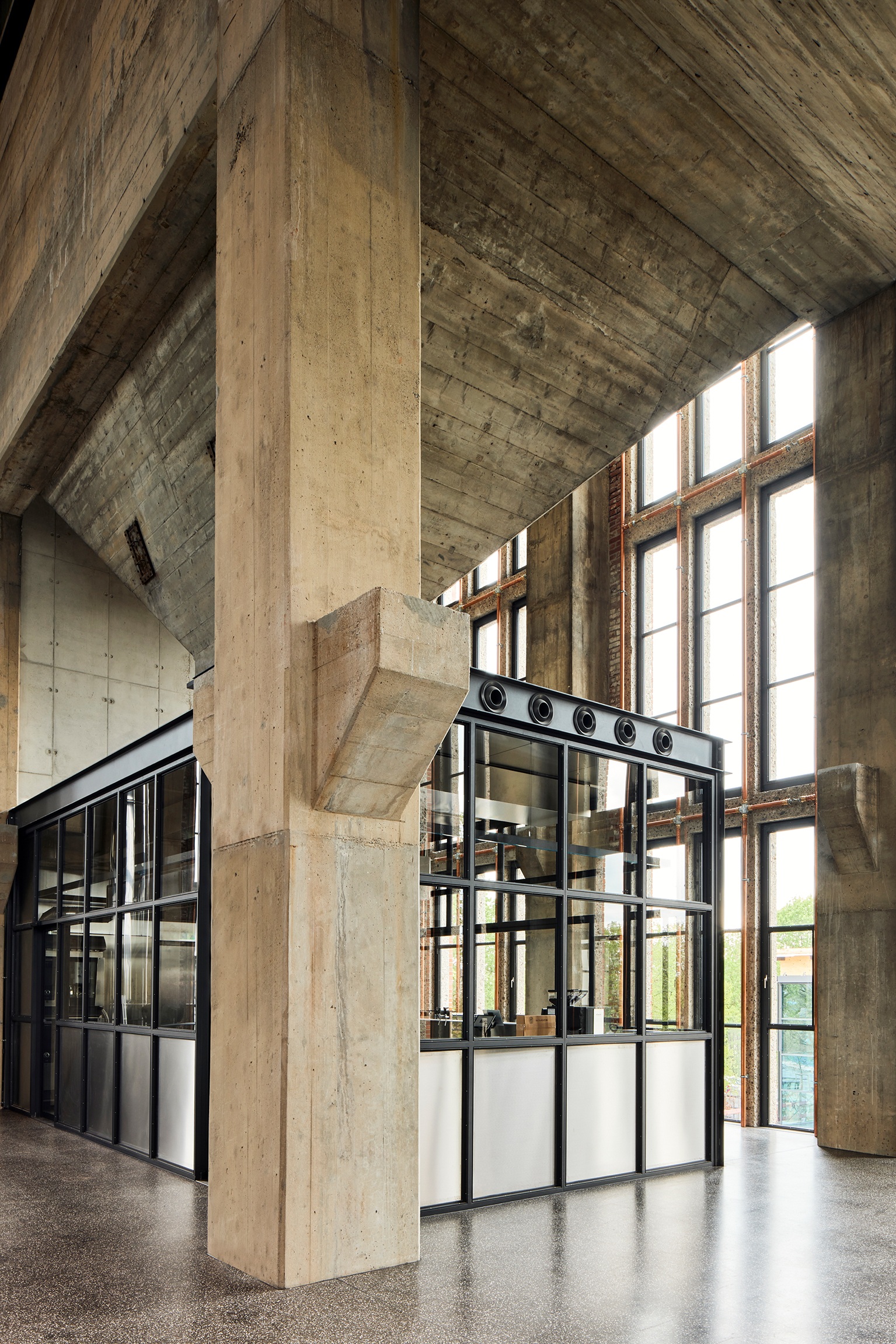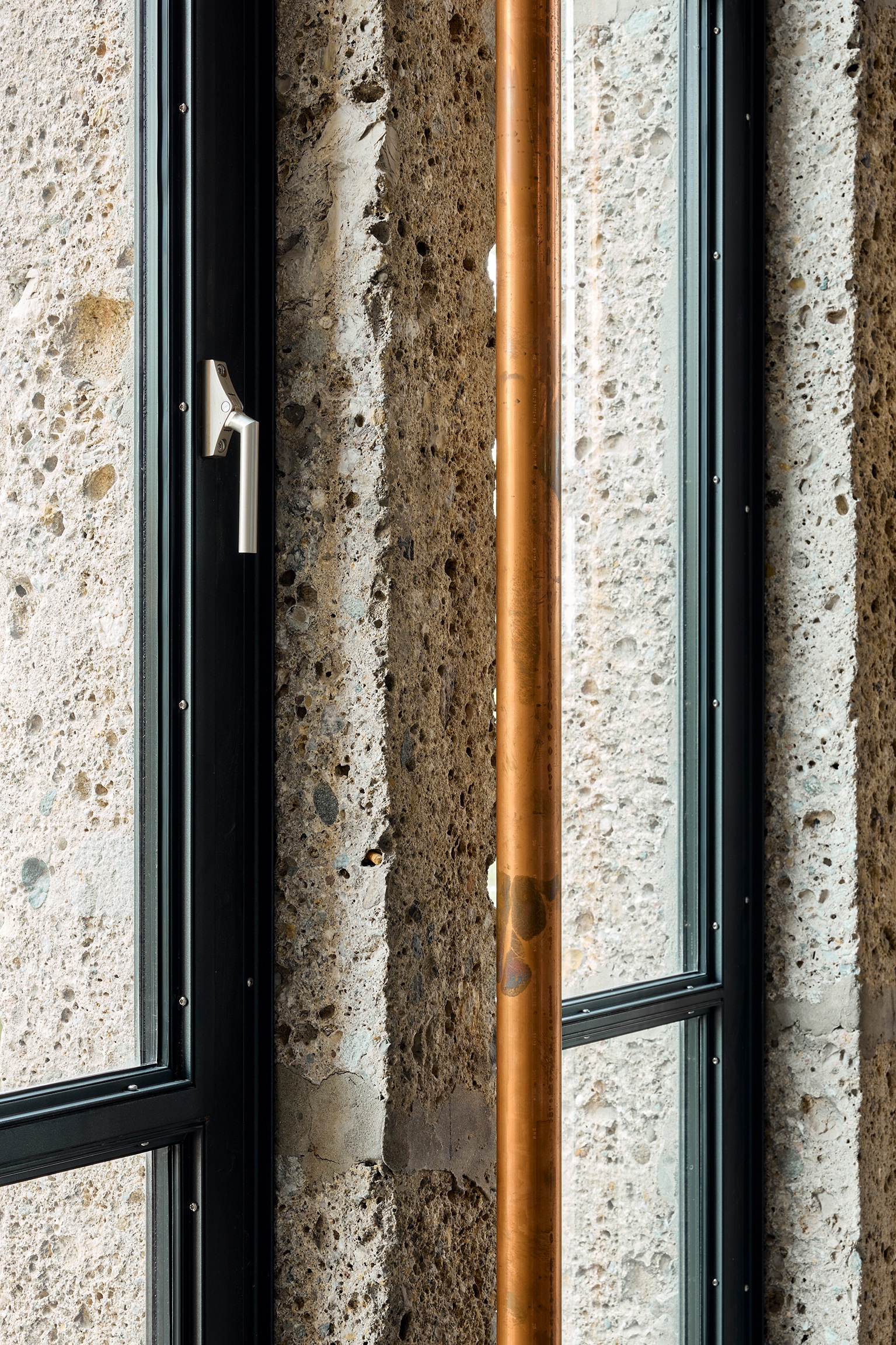 Die Kesselhalle misst 45 x 29 Meter und ist beeindruckende 23 Meter hoch. Ihre drei im Originalzustand erhaltenen Fassaden – die beiden Schmalseiten sowie eine Längsseite – bestehen aus Ziegelmauerwerk, das von bis zu 18 Meter hohen Fensterbändern durchbrochen wird. An der nordwestlichen Längsfassade war der Anbau eines weiteren Gebäudeteils zur Stromerzeugung geplant, aber nicht realisiert. So wurde die zwischen den beiden Gebäuden gedachte Trennwand zu einer (hierfür bauphysikalisch ungeeigneten) Außenfassade. Aus Gründen des Denkmalschutzes waren additive Maßnahmen zum Wärmeschutz nur an dieser nordwestlichen Außenfassade möglich. Die charakteristischen Fensterbänder aus Nagelfluh an den drei übrigen Fassaden wurden im engen Dialog mit dem Landesamt für Denkmalpflege restauriert und mit einer Begleitheizung aus Kupfer-Rohren ertüchtigt. Ziel war es, die von außen nach innen durchgehenden Natursteinbauteile innenseitig zu temperieren und so die wärmeschutztechnischen Schwachstellen und den damit einhergehenden Kaltluftabfall zu minimieren. Die im Bestand vorgefundenen, einfachverglasten Holzfenster waren nicht erhaltenswert. Erhalten werden – im Sinne des Denkmalschutzes – sollten jedoch die äußerst schmalen Ansichtsbreiten der Eichenholzprofile.