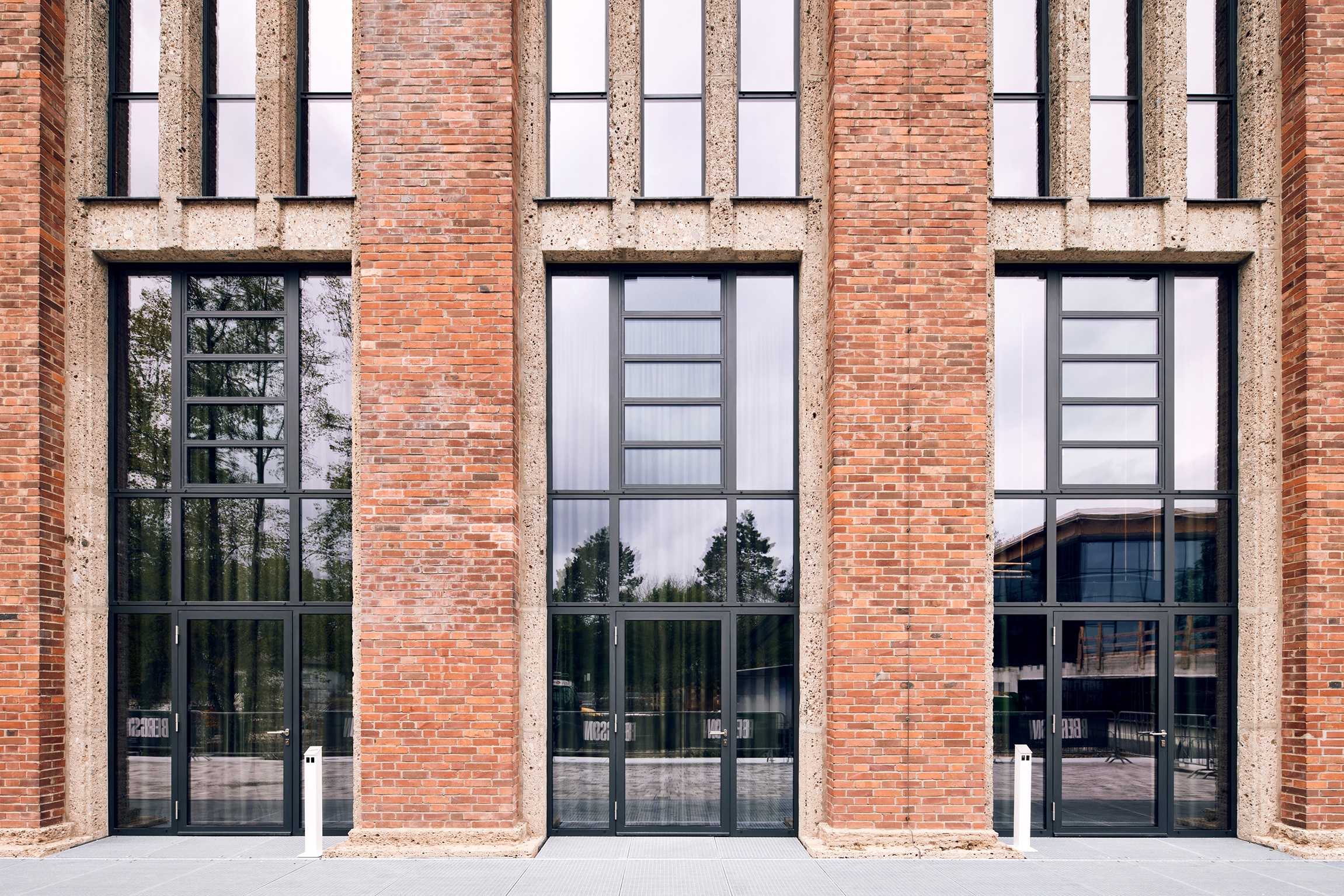 „Die filigranen Fenster stehen im Kontrast zur monumentalen Ziegelfassade und den oberflächenrauen Nagelfluh Einfassungen und verweisen damit auf den Übergang von architektonischem Historismus und industrieller Moderne“, sagt Markus Stenger von Stenger2 Architekten und Partner, München. Zur Erneuerung der vielen Fensterelemente entschieden die Planer sich für das feine Sprossensystem Janisol Arte 2.0. „Ausschlaggebend für die Wahl von Janisol Arte 2.0 waren der geringe Querschnitt, die sehr wertige Oberfläche und die scharfkantigen Anschlüsse – die insgesamt natürlich den geforderten ‚Industriecharakter‘ verdeutlichen“, so Stenger weiter. Dazu kommt, dass der Werkstoff Stahl wesentlicher Baustein der in der Kesselhalle umgesetzten Gestaltungskonzeption ist. Die Fensterbänder aus Nagelfluh – je fünf an den beiden Schmalseiten und neun an der Längsseite – sind jeweils drei Meter breit und 16 Meter hoch; im Bereich der Eingangstüren beträgt die Gesamthöhe 18 Meter. Die darin eingebauten Einzelelemente haben eine Größe von jeweils 0,75 x 3,65 Meter. Jedes Fensterband addiert sich aus einem zusammenhängenden System eines Zwölfer-Rasters gleich großer vertikaler Öffnungen. In diese Öffnungen hinein wurden die dreiteiligen Fensterelemente aus Janisol Arte 2.0 eingefügt. Die gewünschte Detaillierung der Fensterbänder, welche insbesondere im Kontrast zu den direkt angrenzenden Massivbauteilen in Erscheinung tritt, konnte mit Janisol Arte 2.0 bis hin zur profilierten, sichtbar verschraubten Glashalteleiste umgesetzt werden. Für die Verglasung waren neben den Anforderungen an den Wärmeschutz auch Vorgaben zum Schallschutz und teilweise zur Absturzsicherheit ausschlaggebend; deshalb sind nicht alle Elemente mit der gleichen Verglasung versehen. Alle Gläser wurden jedoch als Sonnenschutz-Verglasung ausgeführt, weil es aus denkmalpflegerischen Gründen nicht möglich war, einen außen liegenden Sonnenschutz anzubringen.