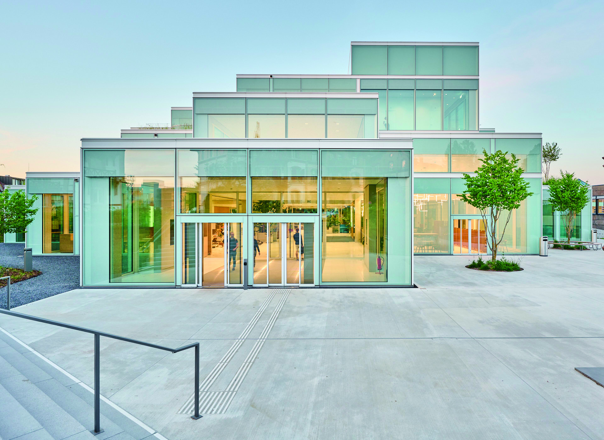 Um im Innern, aber besonders auch an der Fassade eine möglichst perfekte Transparenz und Leichtigkeit zu erreichen, bedurfte es einer anspruchsvollen Gebäudehülle mit verglasten raumhohen und brüstungsfreien Fassadenelementen. Diese sind komplett von der offenen Gebäudestruktur getrennt und direkt miteinander verbunden. Ermöglichen Brüstungen höhere Toleranzen und ein Nachjustieren, durfte es bei der Fassadenkonstruktion des «Square» nur zu minimalsten Toleranzen kommen: Die Aepli AG hat hierfür die Fassadenelemente in einer Closed Cavity Façade (CCF) mit Sonderprofilen von Schüco im Werk vorproduziert, basierend auf dem Fenstersystem Schüco AWS 90.SI (Super Insulated).