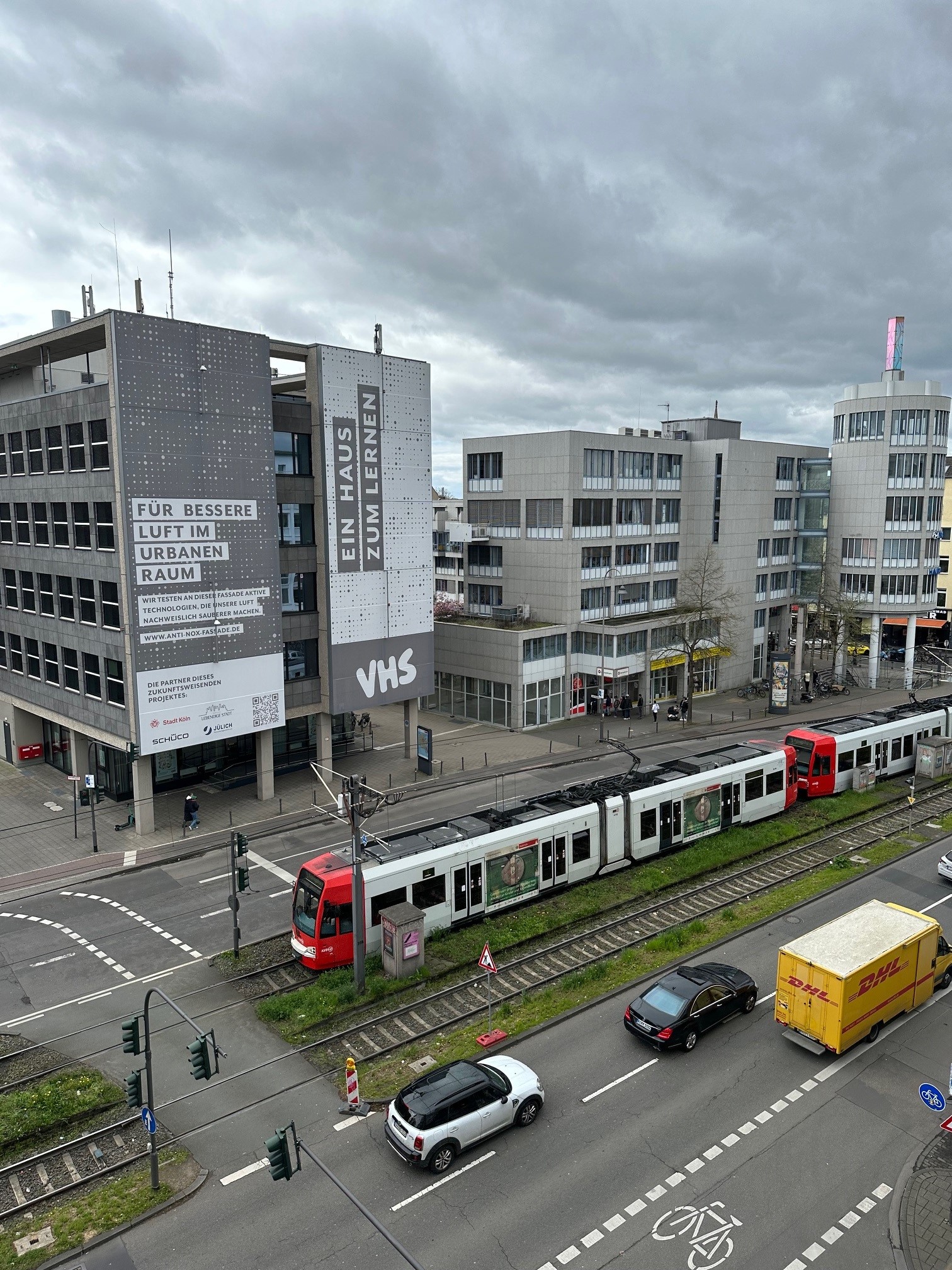 Die im Oktober 2024 begonnenen Messungen an der stickoxidbindenden Membran am Gebäude der Volkshochschule in der Cäcilienstraße 35 belegen, dass auf Basis gemittelter Monatswerte Filterleistungen von rund 30 Prozent erreicht werden. Einzelne Tagesmessungen liegen sogar darüber. Für die weniger lichtintensive Nordausrichtung des VHS-Gebäudes ist dies ein beeindruckender Wert. Im Projekt wurde auch nachgewiesen, dass die Filterleistung mit zunehmender Tageslichtdauer und Temperatur steigt. Seit Januar 2025 hat sich der Wert der Filterleistung kontinuierlich verbessert. Dieser positive Trend setzte sich bis zuletzt unverändert fort. Bei einer Südausrichtung der Membran unter sonst gleichen Umgebungsbedingungen ist daher von einer bis zu dreifach höheren Lichtintensität auszugehen, wodurch die Filterleistung deutlich größer als an einer Nordfassade wäre.
