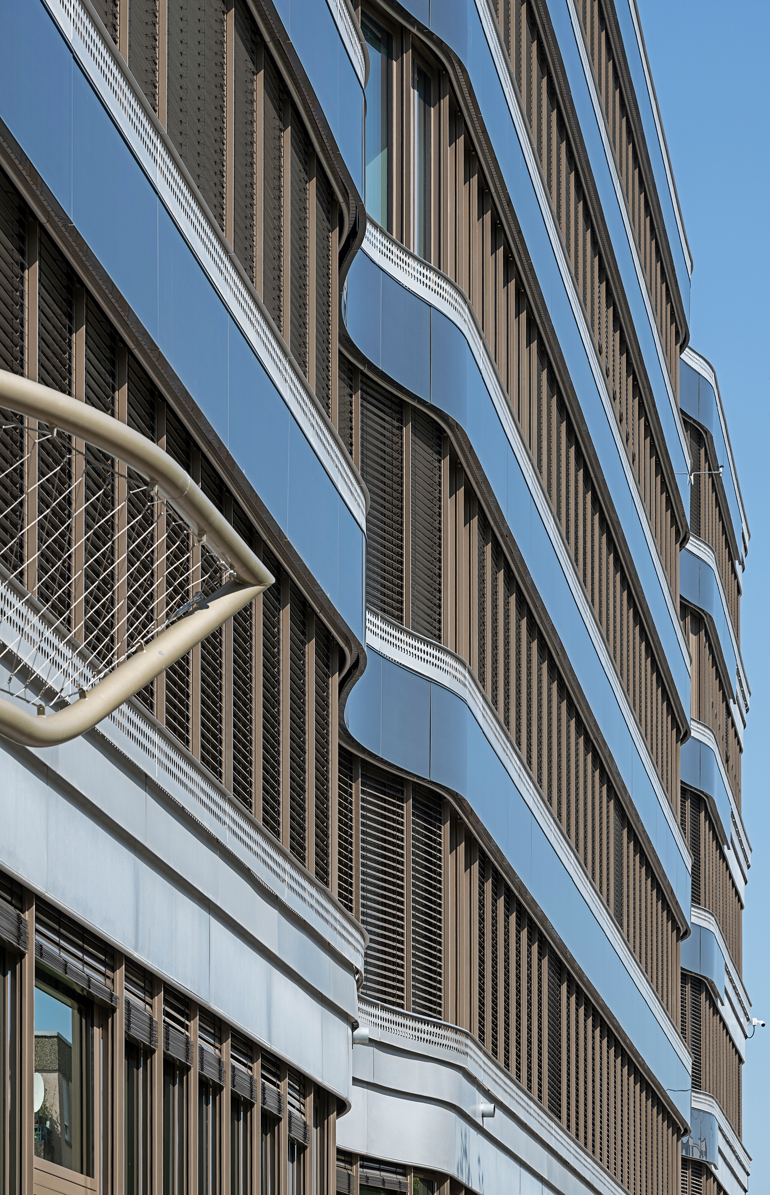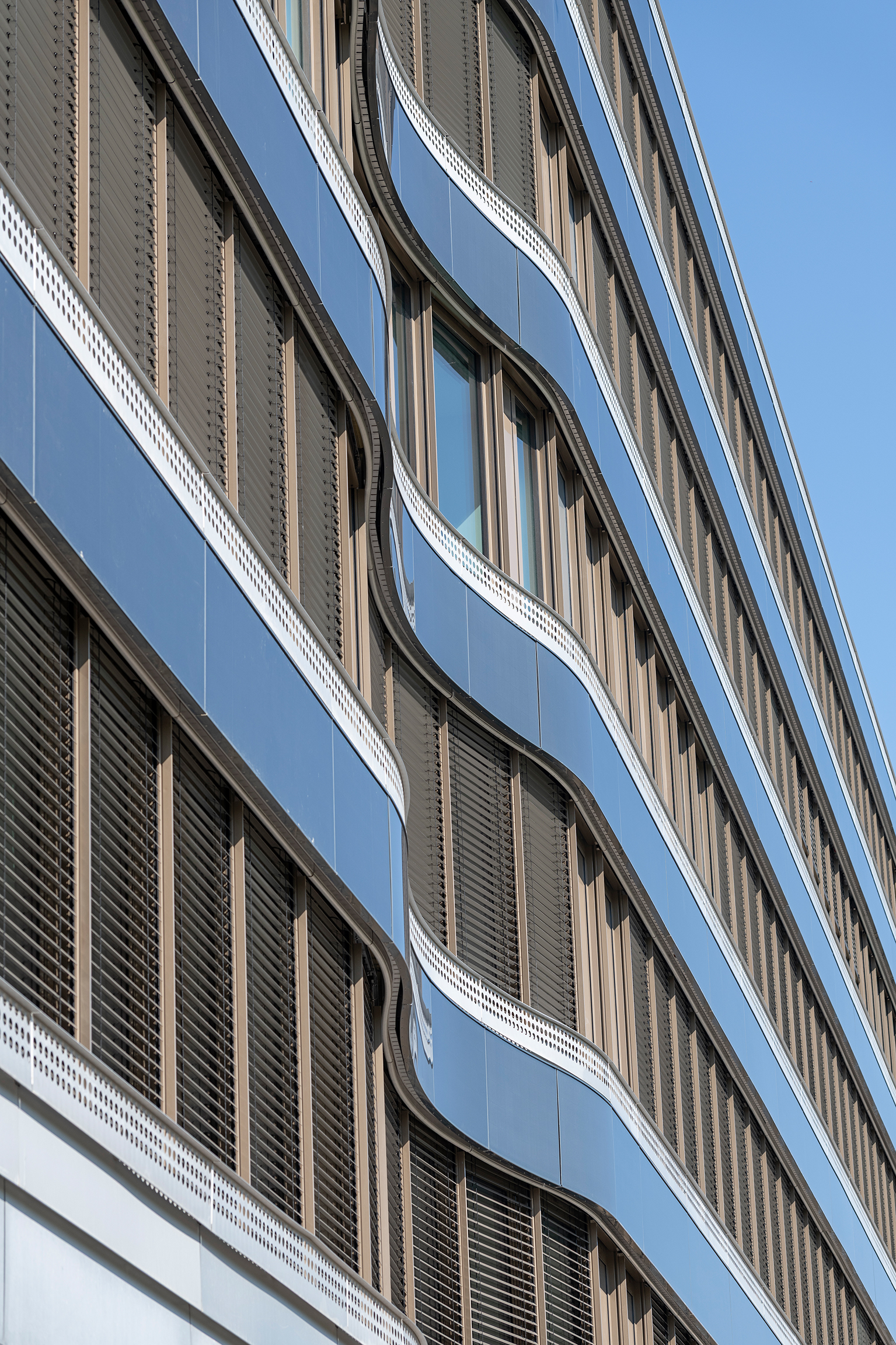 Eine besondere Herausforderung stellte die Sanierung der umlaufenden Brüstungsverkleidungen aus Aluminiumblech auf Höhe der Zwischendecken dar. Neben der vollständigen Demontage und Aufarbeitung der Elemente wurden beschädigte Bleche durch neue ausgetauscht, sowie die Unterkonstruktion statisch und bauphysikalisch ertüchtigt. Zur regenerativen Energieerzeugung wurden sie teilweise mit bauwerksintegrierter Photovoltaik (BIPV) versehen. Um das optische Erscheinungsbild nicht zu beeinträchtigen, entwickelte Schüco in Zusammenarbeit mit Forster Fassadentechnik ein projektspezifisches, dezentes Halteprofil. Das Bemerkenswerte dabei: Der Form der Brüstungsverkleidungen am Gebäude folgend, kamen neben üblichen flachen PV-Modulen auch eigens angefertigte konvexe und konkave PV-Module von Schüco zum Einsatz.