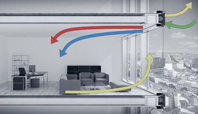 Genau dies tut die Schüco E² Fassade, indem sie als erste einschalige hoch integrierte Systemfassade über intelligente Schnittstellenlösungen die Funktionen Lüftung (incl. Heizung und Kühlung), Öffnungselemente, Sonnenschutz und solare Energiegewinnung auf wirtschaftliche und ästhetische Weise miteinander verknüpft. Wesentlicher gestalterischer Kunstgriff ist dabei die versteckte Positionierung dezentraler Anlagentechnik für Lüftung sowie des Sonnenschutzes in den Bereich der Geschossübergänge. Auf diese Weise gelingt es auch bei einschaligen Fassaden, eine homogene, hoch transparente Fassadenansicht herzustellen, die ihre energetische, multifunktionale Leistungsfähigkeit mit Eleganz und konstruktiver Schlichtheit kaschiert.
