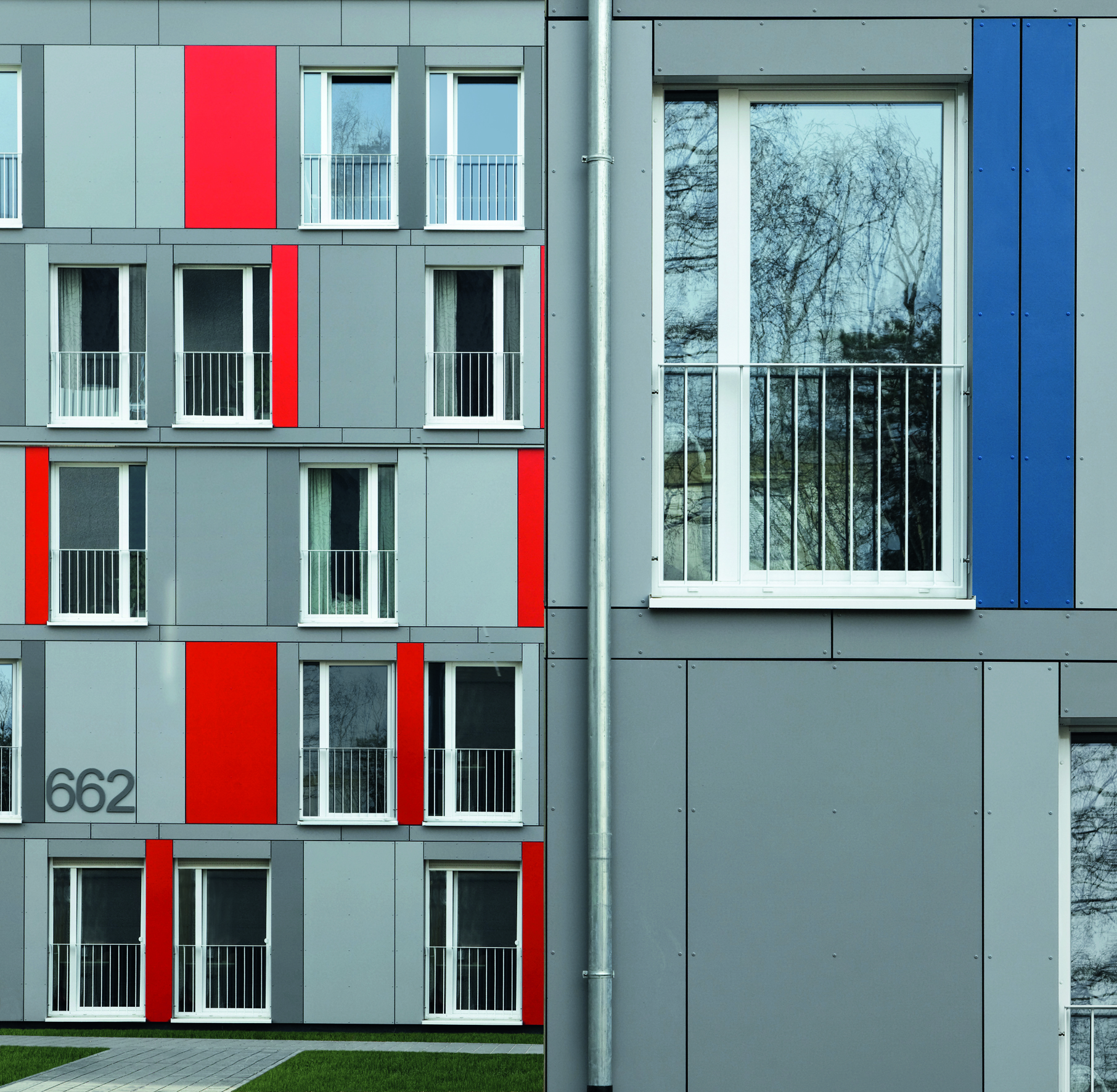 Die Studentenapartmenthäuser bestehen aus drei fünfgeschossigen Gebäuden mit 265 Bettenplätzen in attraktiven Ein- bis Dreizimmerapartments sowie 12 Lese-, Lern- und Serviceräumen. Neben der Verdichtung wird durch die konsequente Ausrichtung nach Osten, Süden und Westen eine hohe Wohnqualität erzielt. Dies drückt sich bei den Gebäuden 660 (gelb) und 661 (blau) durch eine 1-hüftige Bauweise in Ost-Westrichtung aus mit nach Süden ausgerichteten Apartments. Städtebaulich wird in dem vielschichtigen Umfeld durch die drei neuen Baukörper ein homogener Abschluss zum nördlich angrenzenden Klausenpfad erreicht.