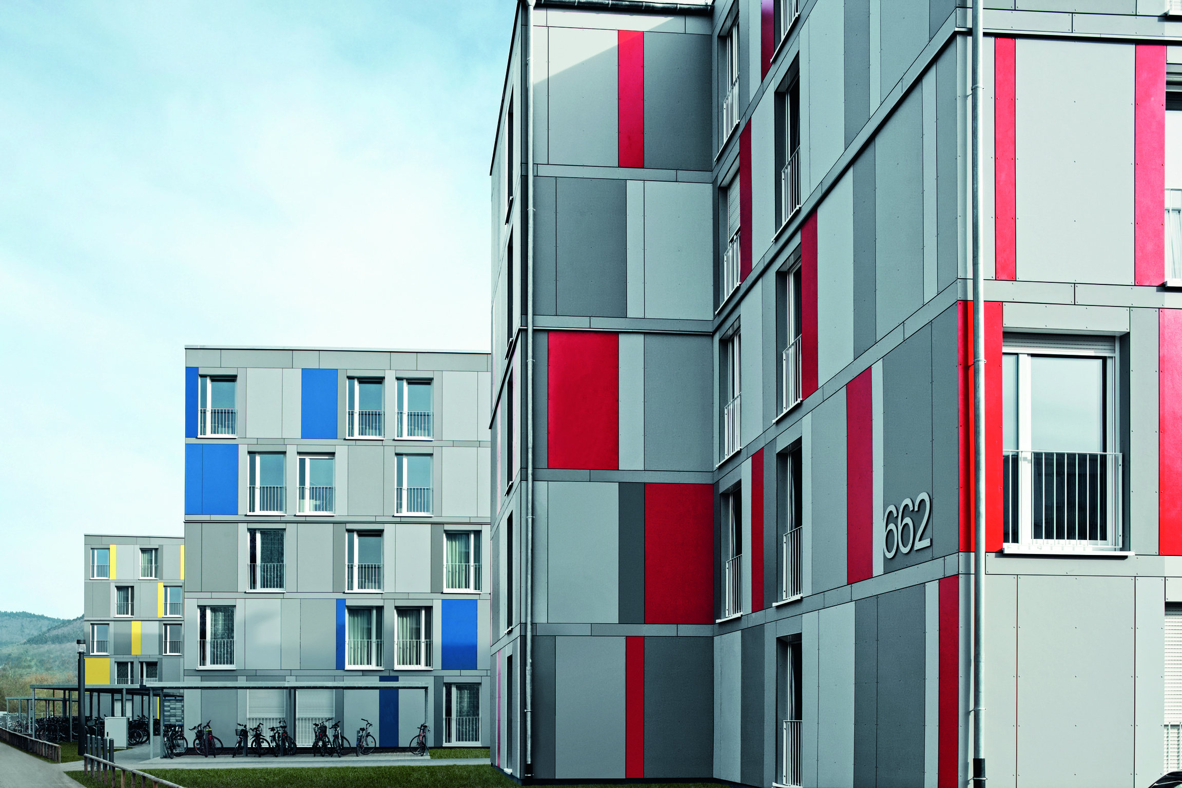 Das von LiWooD entwickelte Farbkonzept hebt durch die abgestuften Grautöne der Außenfassade die Gemeinsamkeit der drei Baukörper hervor. Zugleich wird mit der Zuordnung der unterschiedlichen Primärfarben Gelb, Blau und Rot zu den Gebäuden auf Baukörperebene eine jeweils eigene Identität geschaffen. Bei den ebenfalls mit farbigen Faserzementplatten verkleideten Innenfluren wiederholt sich das Thema der unregelmäßig angeordneten, in drei Grautönen abgestuften Tafeln, durch die im Innenbereich in den nutzungsbedingt schmalen Fluren eine optische Raumtiefe erzeugt wird.