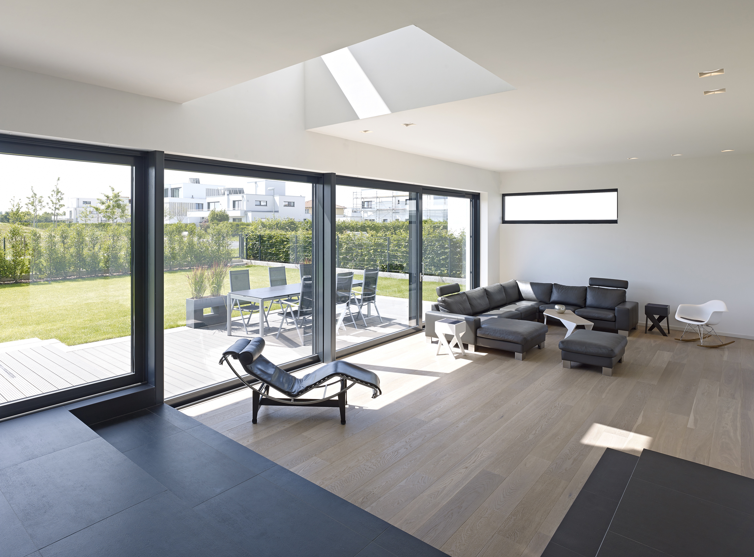 Die hohe angestrebte Energieeffizienz des Gebäudes sowie die modernen Stilcharakteristika des Entwurfs ließen die Architekten hoch isolierende Systemelemente in Aluminium mit Dreifach-Isolierverglasung vorsehen. Im Zuge einer umfangreichen technischen Beratung durch den Schüco Außendienst entschieden sie sich in Abstimmung mit den Bauherrn für die Systemfamilie Schüco AWS 70.HI, die bei einer durchgängigen Einbautiefe von nur 70 mm alle vorgesehenen Konstruktionslösungen in hoch wärmedämmernder Ausführung ermöglichte. Die hohen Anforderungen an Wärmedämmung und Schlagregendichtigkeit kamen insbesondere bei dem großflächigen Hebe-Schiebetürsystem zwischen Wohnraum und Terrasse im EG zum Tragen. Hier konnte das System Schüco ASS 70.HI angesichts großer Elementflächen bis zu 2,65 x 2,65 m sowie der Anforderung eines barrierefreien Übergangs seine ästhetischen und technischen Vorteile in vollem Umfang unter Beweis stellen.