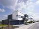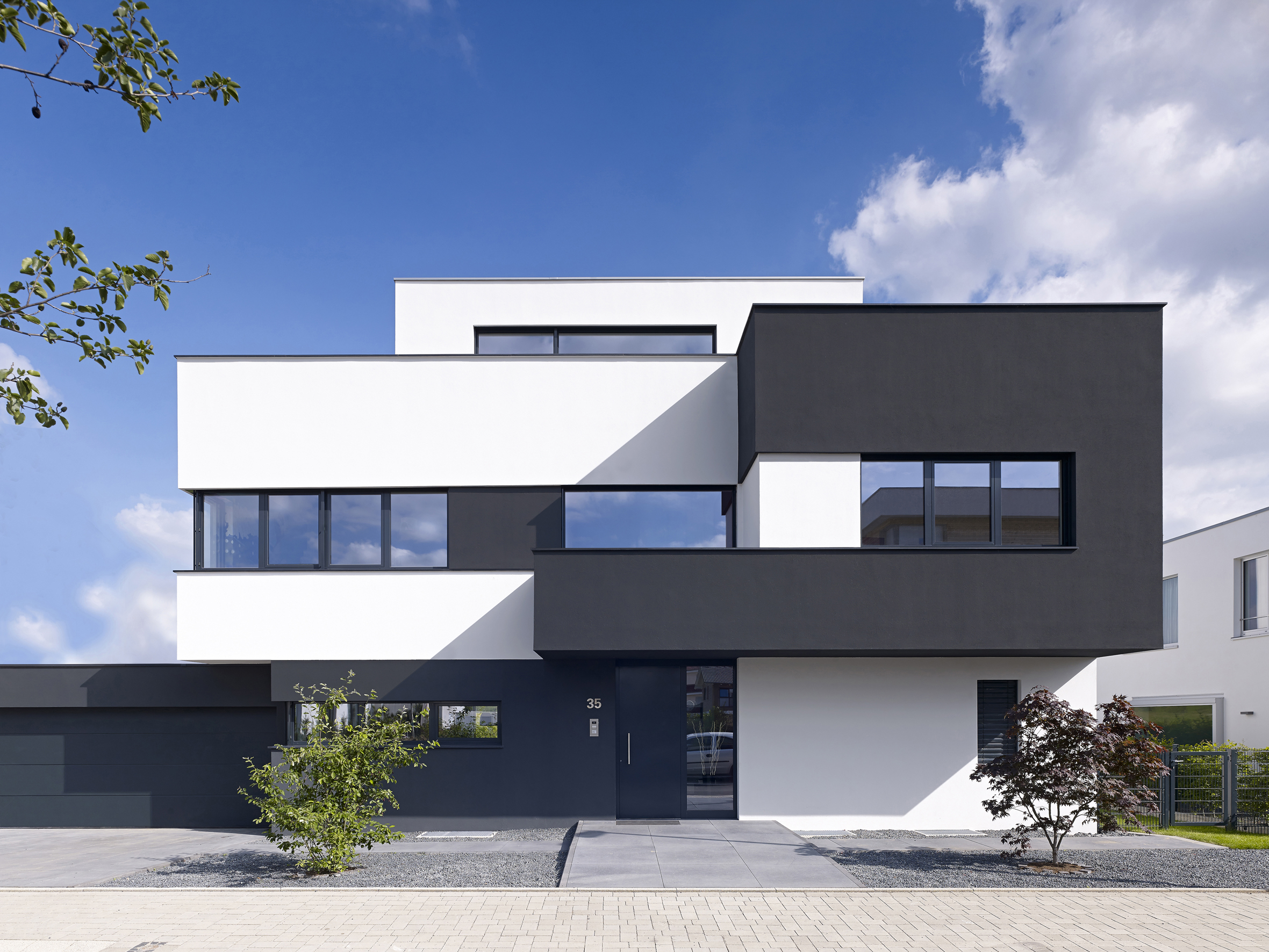 Die matt schwarzen und weißen kubischen Elemente der in Massivbauweise erstellten Gebäudehülle sind zwar entwurfsprägend, erhalten jedoch durch horizontale Einschnitte in Form von Fensterbändern eine deutliche optische Auflockerung. Umso mehr, als die Fenster sehr unterschiedliche Formate aufweisen, die mit der jeweiligen Einbausituation und Fassadenausrichtung sowie dem Diskretionsbedarf privaterer Nutzungszonen abgestimmt sind. Verbindendes Element aller Verglasungen ist die schlanke horizontale Gliederung durch die Aluminium-Systemprofile sowie die Farbgebung in dem Grauton RAL 7016.