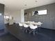 Im Inneren schaffen zwei Lufträume - einer im Wohnbereich, einer über dem Eingangsbereich - eine Verbindung zur Vertikalen und ermöglichen abwechslungsreiche Einblicke und Durchblicke. Im Erdgeschoss befinden sich abgehend von der Diele eine Garderobe, das Gäste-WC und ein Arbeitszimmer. Die offene Küche mit direktem Zugang von der Diele schließt an den offenen Essplatz an, der in einen um zwei Stufen abgesenkten Wohnbereich übergeht. Durch eine großzügige Verglasung zur Terrasse hin entsteht optisch ein fließender Übergang zwischen Innenraum und Gartenzone.