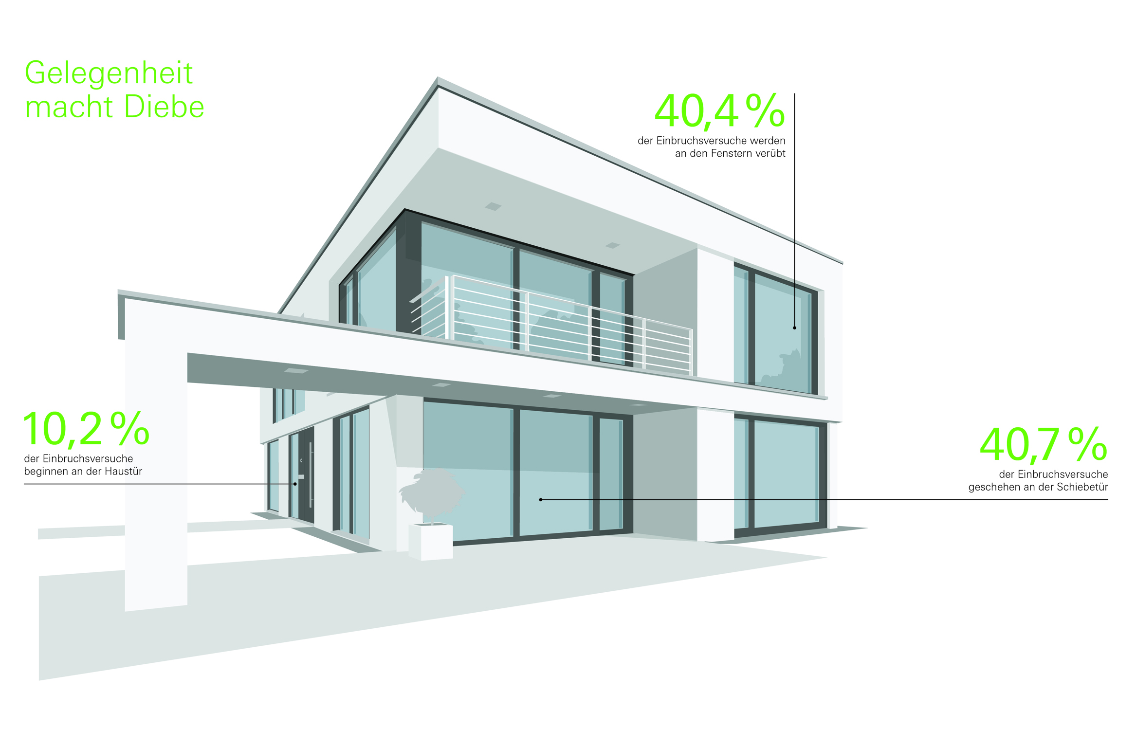 In über 90 Prozent der Fälle brechen Einbrecher über gering gesicherte Fenster, Türen und Schiebetüren ein. Die positive Meldung: Mehr als ein Drittel aller Einbruchsversuche scheitern, weil Wohnungen oder Häuser gesichert sind. Fenster, Türen und Schiebetüren von Schüco mit perfekt aufeinander angestimmten Sicherheitskomponenten erfüllen die von der Polizei empfohlenen Widerstandsklassen und schützen das Zuhause gegen unerwünschte Gäste.