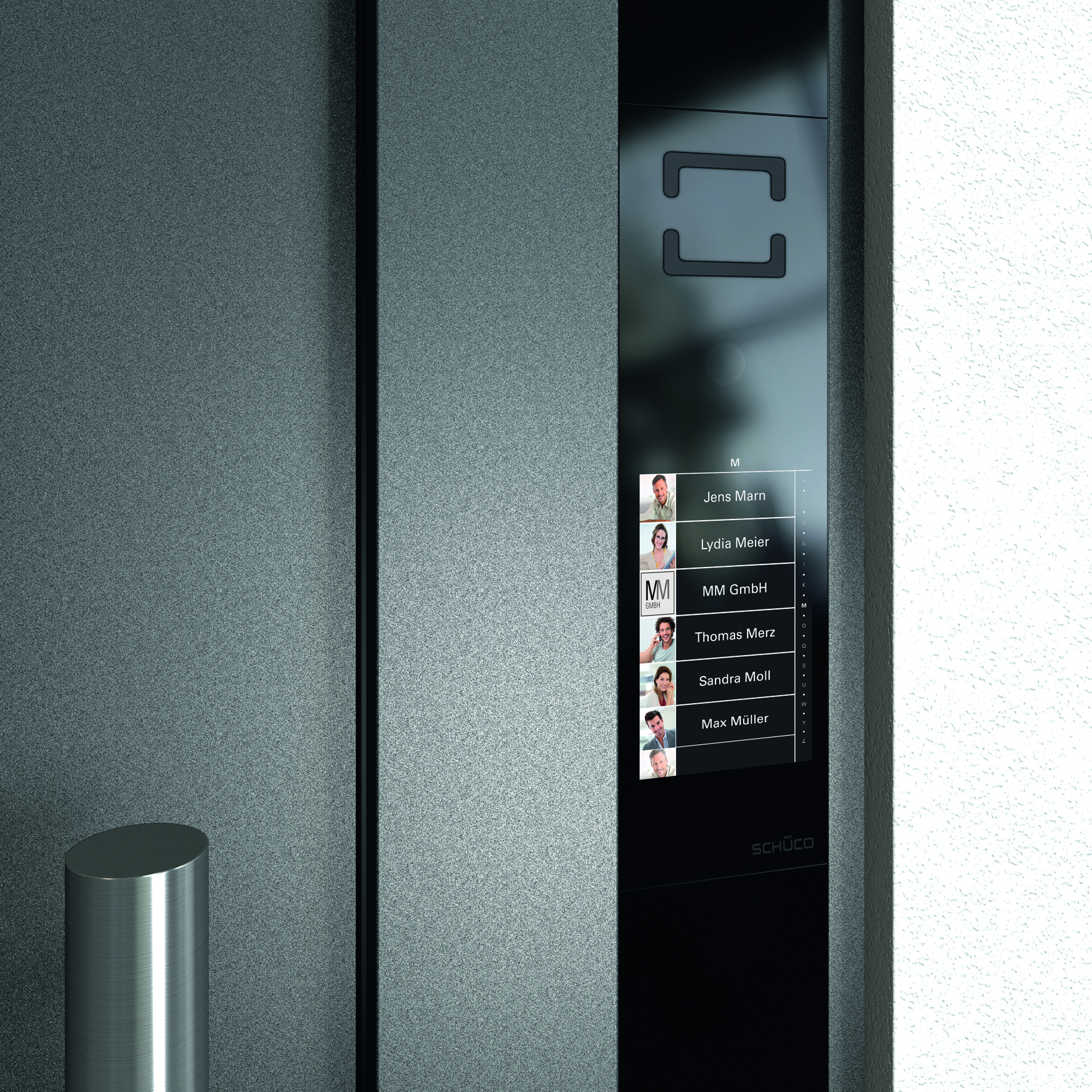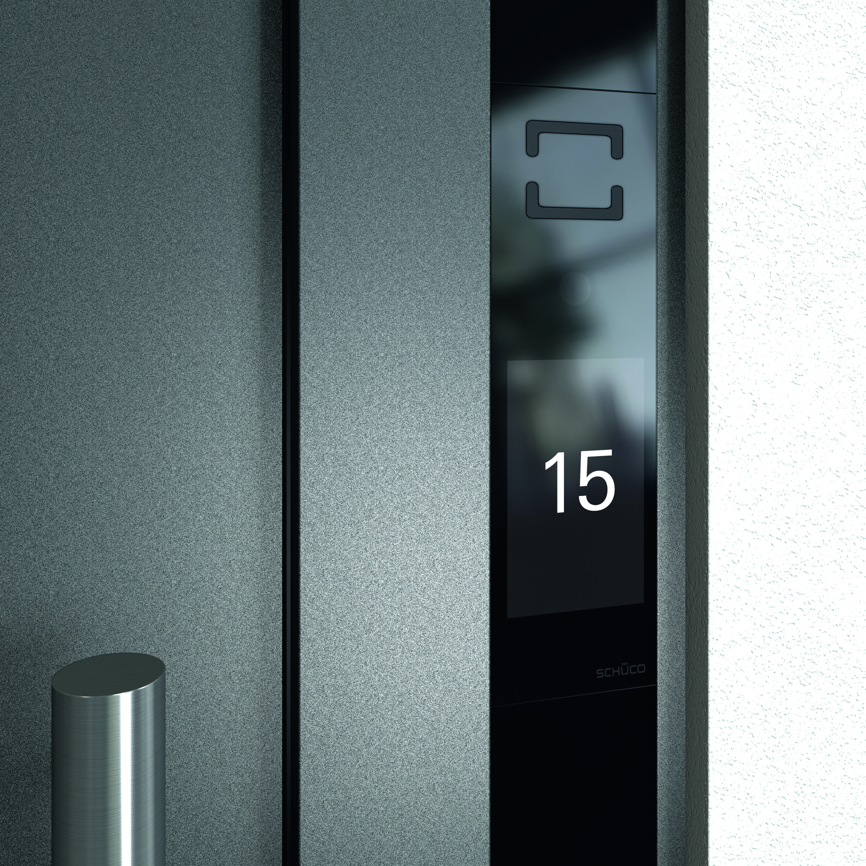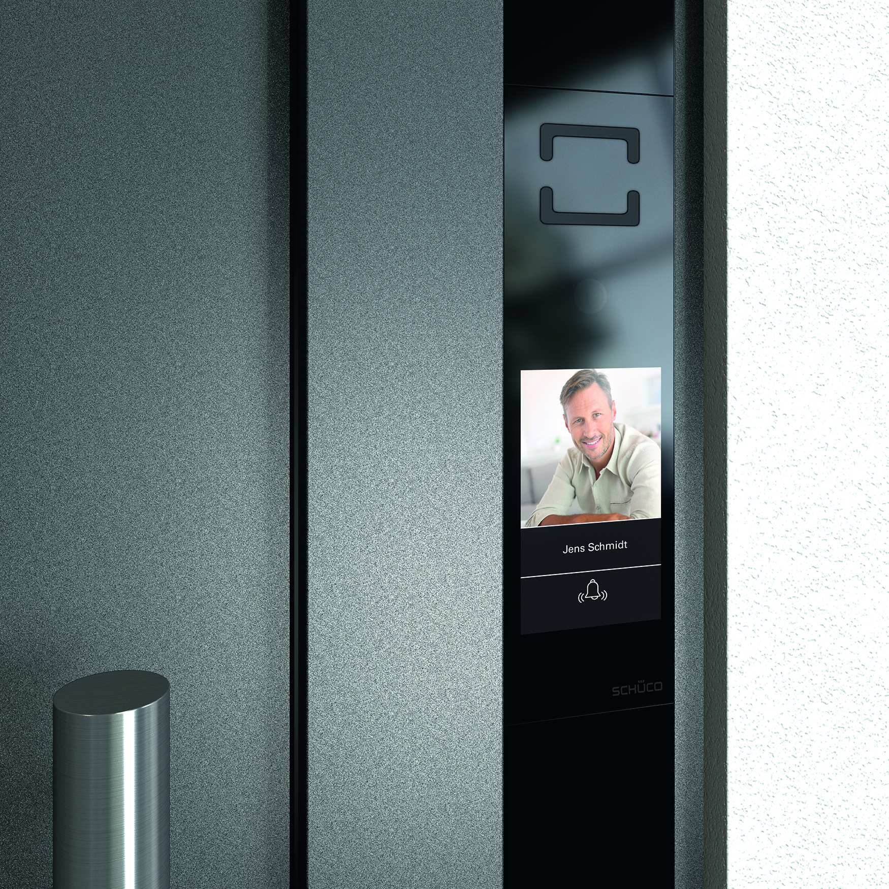 Und so funktioniert das individuell programmierbare Schüco DCS Touch Display: Die Bewegungserkennung der Videokamera aktiviert das System, sobald sich eine Person dem Eingang nähert. Bei einem Einfamilienhaus wechselt die Ansicht von der Hausnummer zum Klingelsymbol mit dem Namen des Hausbesitzers. Ebenfalls zu sehen ist eine Porträtsilhouette, die sich durch ein reales Foto des Bewohners ersetzen lässt. Bei Mehrfamilienhäusern wechselt die Hausnummer bei Annäherung zu einer Klingelliste, die alphabetisch geordnet und wie beim Smartphone scrollbar ist. Berührt der Besucher das Klingelsymbol auf dem Display, wird der Ruf ausgelöst und mit einem Klingelton bestätigt. Der Klingelton ist sowohl akustisch als auch visuell wahrnehmbar. Die Videokamera überträgt das Bild des Besuchers auf die Innensprechstelle (Schüco Video-Innenstation oder IP-Videotelefon, SmartPhone, Tablet, Softphone), so dass der Bewohner erkennt, wer vor seiner Haustür steht, ohne das er die Tür öffnen muss. Der breite Erfassungswinkel der Videokamera ermöglicht dabei einen komfortablen Rundum-Überblick des Eingangsbereiches. Entscheidet der Bewohner sich, über die Sprechanlage Kontakt mit dem Besucher aufzunehmen, erscheint auf dem Außenbildschirm das Symbol eines Mundes. Beide Personen können jetzt miteinander kommunizieren. Bei lauten Umgebungsgeräuschen sichern eine automatische Hintergrundgeräuschunterdrückung und Lautstärkeanpassung die optimale Verständigung. Betätigt der Bewohner den Türöffner, zeigt das Display ein Türsymbol an und der Besucher kann die Tür öffnen.