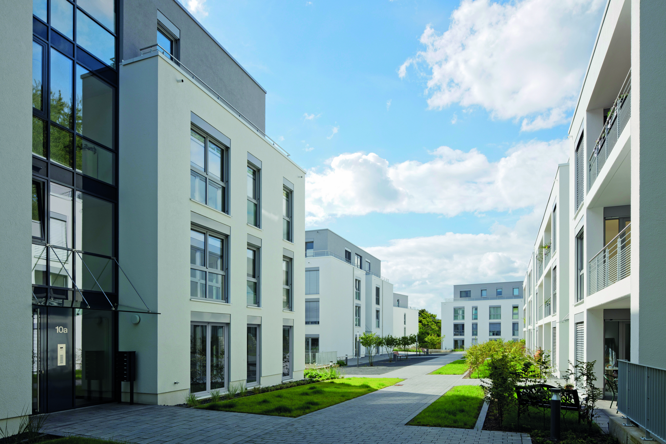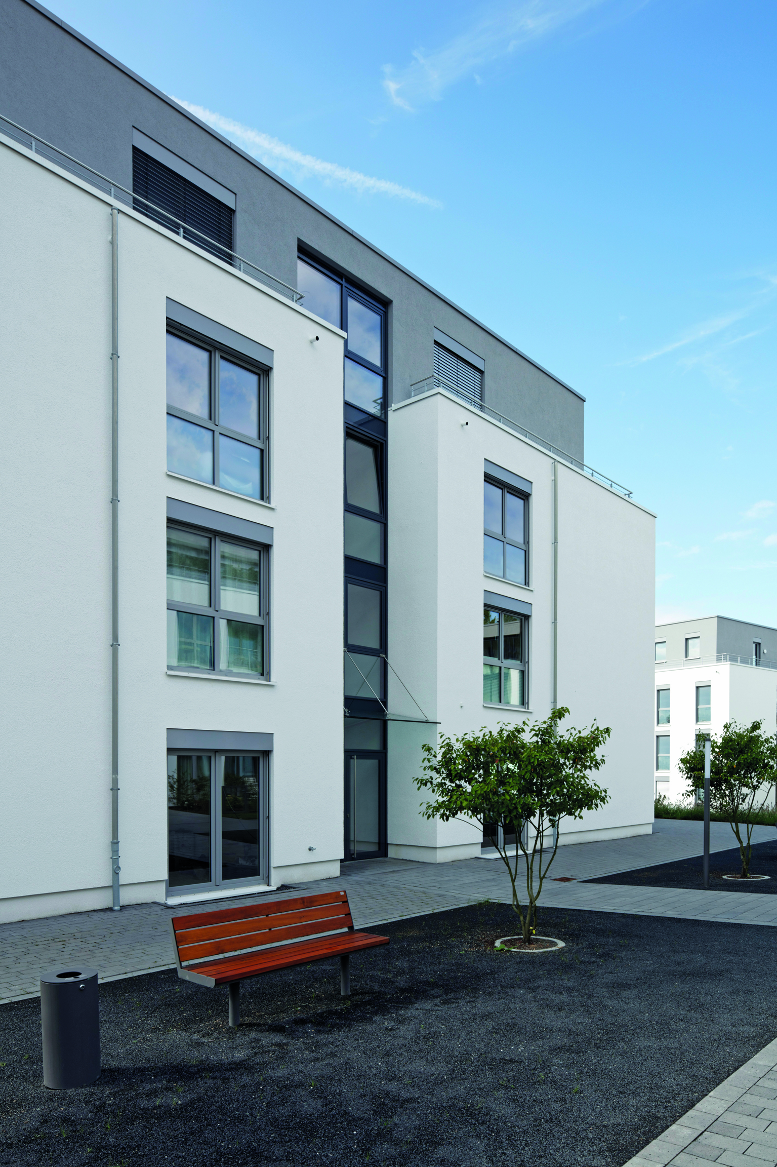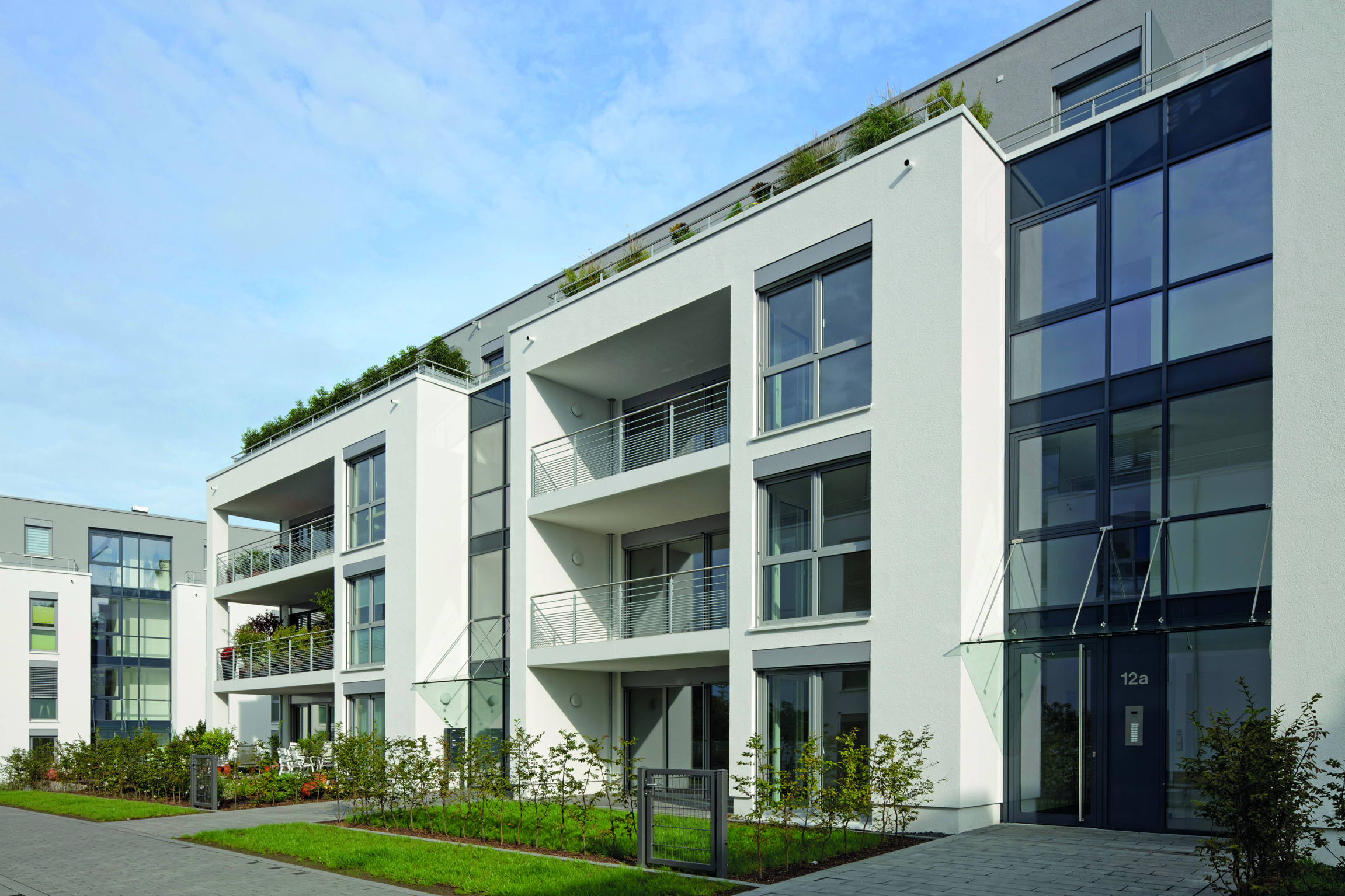 Das Gebäudeensemble wurde nach der Energie-Einsparverordnung (EnEV 2009) errichtet und erzielt seine hohe Energieeffizienz durch die Kombination von nachhaltigen Baustoffen und Fenstersystemen mit einer energieeffizienten Wärmegewinnung durch Erdgas-Brennwertkessel und Blockheizkraftwerk. Die in den meisten Fällen bis zum Boden reichenden, silbergrau folierten Kunststoff-Fenstersysteme Schüco Corona SI 82 sorgen für hohen Tageslichteifall ohne Wärmeverluste. In den Wohnbereichen werden großflächige Elementabmessungen von 4,76 m Breite und 2,25 m Höhe erreicht, was in Verbindung mit der Dreifach-Isolierverglasung die statische Leistungsfähigkeit des Fenstersystems aufzeigt. Bei den Verglasungen handelt es sich um beschichtete Dreifach-Isoliergläser mit einem Wert von Ug = 0,7 W/(m²K). Im Brüstungsbereich ab dem 1. OG aufwärts wurden gemäß TRAV-Anforderungen VSG-Sicherheitsverglasungen in den Scheibenverbund integriert, im Badbereich zusätzlich auch Mattfolien für den Sichtschutz. Die beschriebene Fensterkonfiguration erreicht damit Dämmeigenschaften im obersten Leistungsbereich, verbesserte Schalldämmwerte und optimierte Sicherheitseigenschaften.