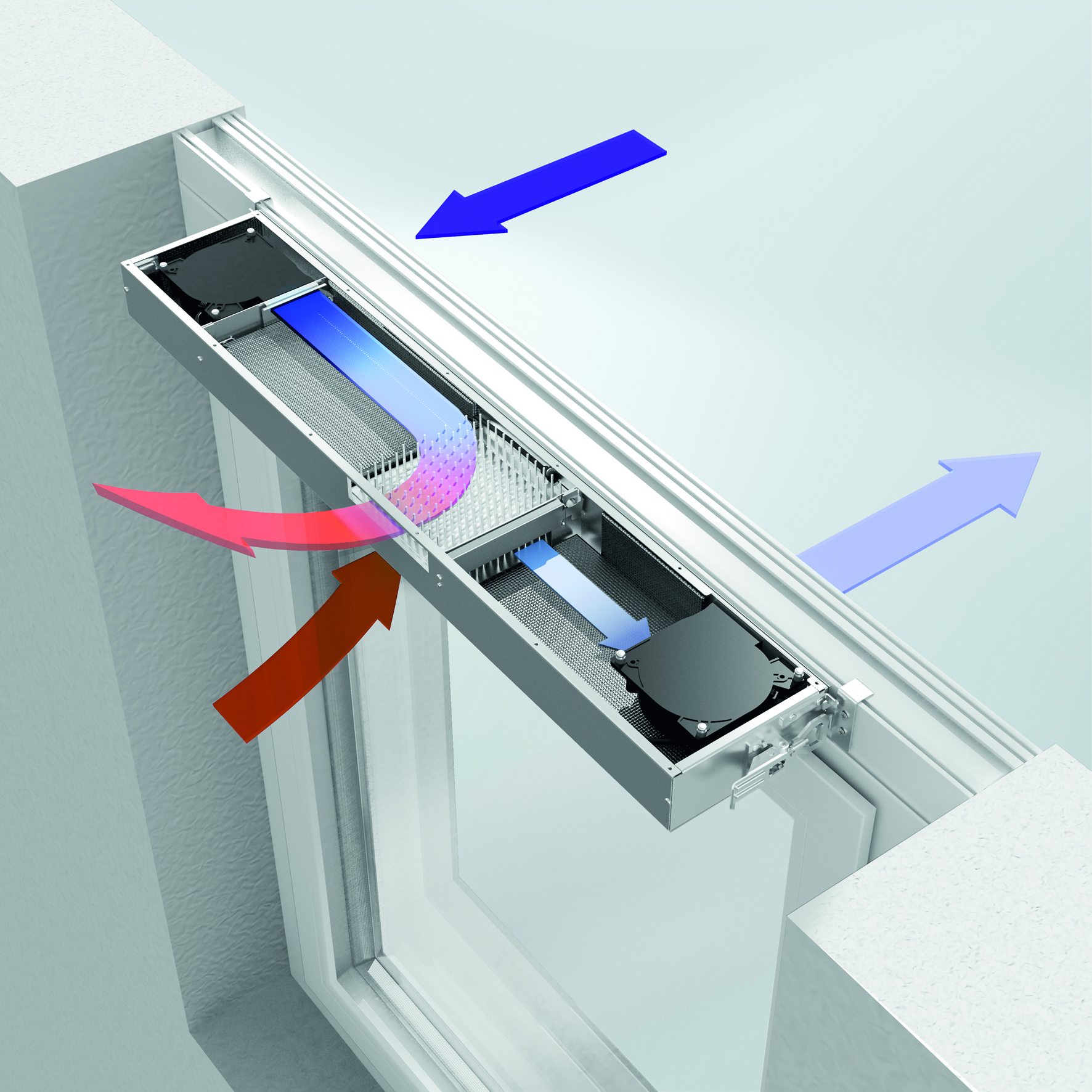 Die zweite Komponente im Rahmen des dezentralen Lüftungskonzeptes sind die motorischen Lüftungsmodule Schüco VentoTherm. Neben der Energie-Einsparfunktion, die aus einer kontrollierten Lüftung mit Wärmerückgewinnung resultiert, gehört auch die Luftreinigung und -erwärmung ganzjährig zu den Vorteilen dieses Be- und Entlüftungssystems. Funktionen, die nicht nur das Raumklima verbessern und die Immobilie aufwerten, sondern auch dort von Bedeutung sind, wo erhöhte Hygieneanforderungen bestehen und/oder Allergiker eine kontrollierte, gereinigte Luftqualität benötigen. Schüco VentoTherm erfüllt die anspruchsvolle Hygieneklassifizierung F9 nach VDI 6022 und stellt damit eine ideale Lösung nicht nur für Wohnhäuser, sondern vor allem auch für Seniorenheime und Krankenhäuser dar.