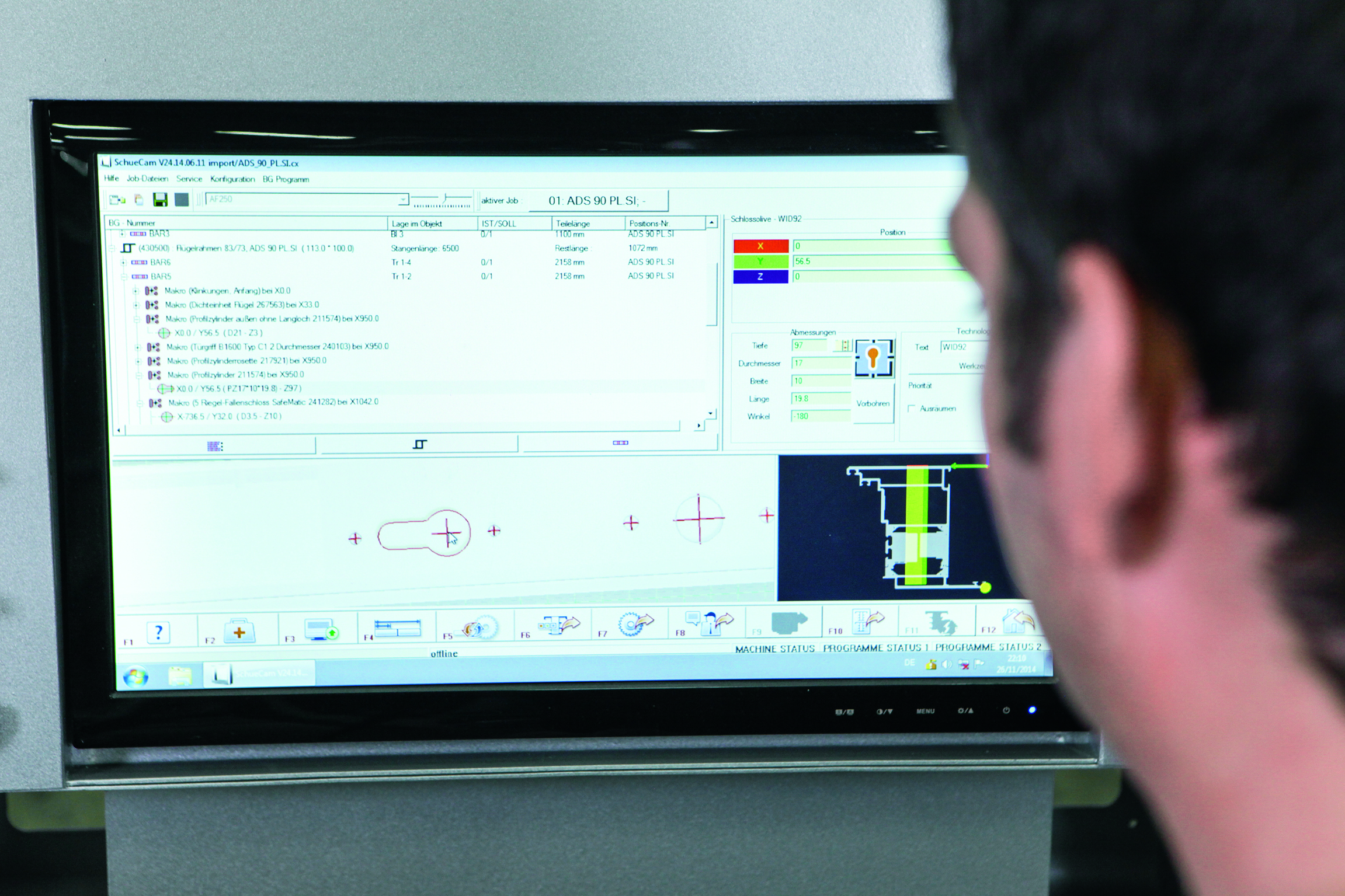Die einfache Bedienung und Ansteuerung erfolgt über ein übersichtliches und ergonomisches Bedienterminal mit 19 Zoll Farbdisplay. Die Bearbeitungsdaten für die Schüco AF 250 werden direkt in SchüCal generiert und anschließend per USB oder über ein Netzwerk übertragen. Ebenfalls möglich ist eine einfache menügeführte manuelle Programmierung. Da die Steuerungssoftware SchüCam auch am PC im Büro eingesetzt werden kann, lässt sich vor der eigentlichen Bearbeitung durch die anschauliche 3-D-Visualisierung der Profile, Werkzeuge und der Bearbeitung auch eine Kontrolle durchzuführen. Die Fahrbewegungen der Maschine werden von der Steuerung zusätzlich durch die Interpolation der Achsen optimiert. Mehr noch: Die Steuerungssoftware berechnet über Optimierungsalgorithmen automatisch die effektivsten Bearbeitungsreihenfolgen. Die für die Profilbearbeitung von der SchüCam ermittelten Spannerpositionen werden über das Portal automatisch verfahren. Kollisionsgefahren werden durch die softwareunterstütze Positionierung konstant vermieden. Eine Profillängenmesseinrichtung ermöglicht das Ausmessen der Profillängen und korrigiert die Längentoleranzen nach dem Zuschnitt. Die Bearbeitungen werden in der SchüCam automatisch angepasst.