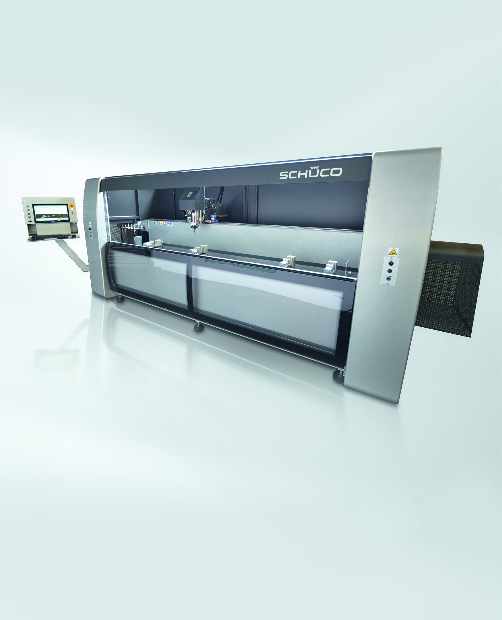 Hochwertige Produkte basieren nicht nur auf fundiertem Know-How bei der Entwicklung, sondern auch auf ganzheitlichen professionellen Fertigungsprozessen: Mit der AF 250 präsentiert Schüco eine kompakte Drei-Achsen-CNC-Maschine mit pneumatisch drehendem Auflagetisch. Dank Bearbeitungslängen von 3,2 bzw. 6,4 Metern im Überlängenmodus und dreiseitiger sowie Vor-Kopf-Bearbeitung von Aluminium- und Stahlprofilen ist die Maschine optimal auf die Produktion von Schüco Fenster- und Türsystemen abgestimmt. Die dreiseitige Bearbeitung der Profile (90°/0°/-90°) wird durch die schwenkbare A-Achse ermöglicht. Dabei kann zusätzlich dank der mechanischen Klemmvorrichtung jeder beliebige Winkel frei eingestellt werden. Neben einem Einzelstab mit einer Länge von bis zu 6.400 mm kann die AF 250 auch zwei Profilstäbe mit unterschiedlichen Konturen und Längen bearbeiten. Bei einer Werkzeuglänge von 160 mm lassen sich Bearbeitungsquerschnitte bis zu 250 mm x 150 mm realisieren – mit geschwenkter A-Achse sind Bearbeitungen bis zu 200 mm x 115 mm machbar.