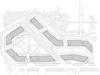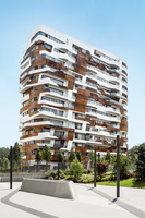 Die Wohnanlage umfasst insgesamt sieben Baukörper unterschiedlicher Höhen und arrangiert sich zu einer offenen Blockbebauung, die durch Grünflächen und Plätze aufgelockert wird. Verbindendes Element der unterschiedlichen Gebäude ist die elegante, horizontal und vertikal mäandrierende Fassadengestaltung. Fensterbänder, Balkone, verglaste und geschlossene Brüstungsbereiche variieren fließend zwischen Auskragung und Einbuchtung – weitere Variation entsteht durch den Wechsel von unterschiedlichen Fassadenmaterialien wie weißen Paneelen, Naturholzflächen und Glas. Das geschossübergreifende, oftmals diagonale Arrangement der Elemente lässt eine lebhafte Gebäudehülle entstehen, bei der trotz wiederkehrender Muster auf allen Ebenen immer neue Variationen des Gestaltungsthemas realisiert wurden.
