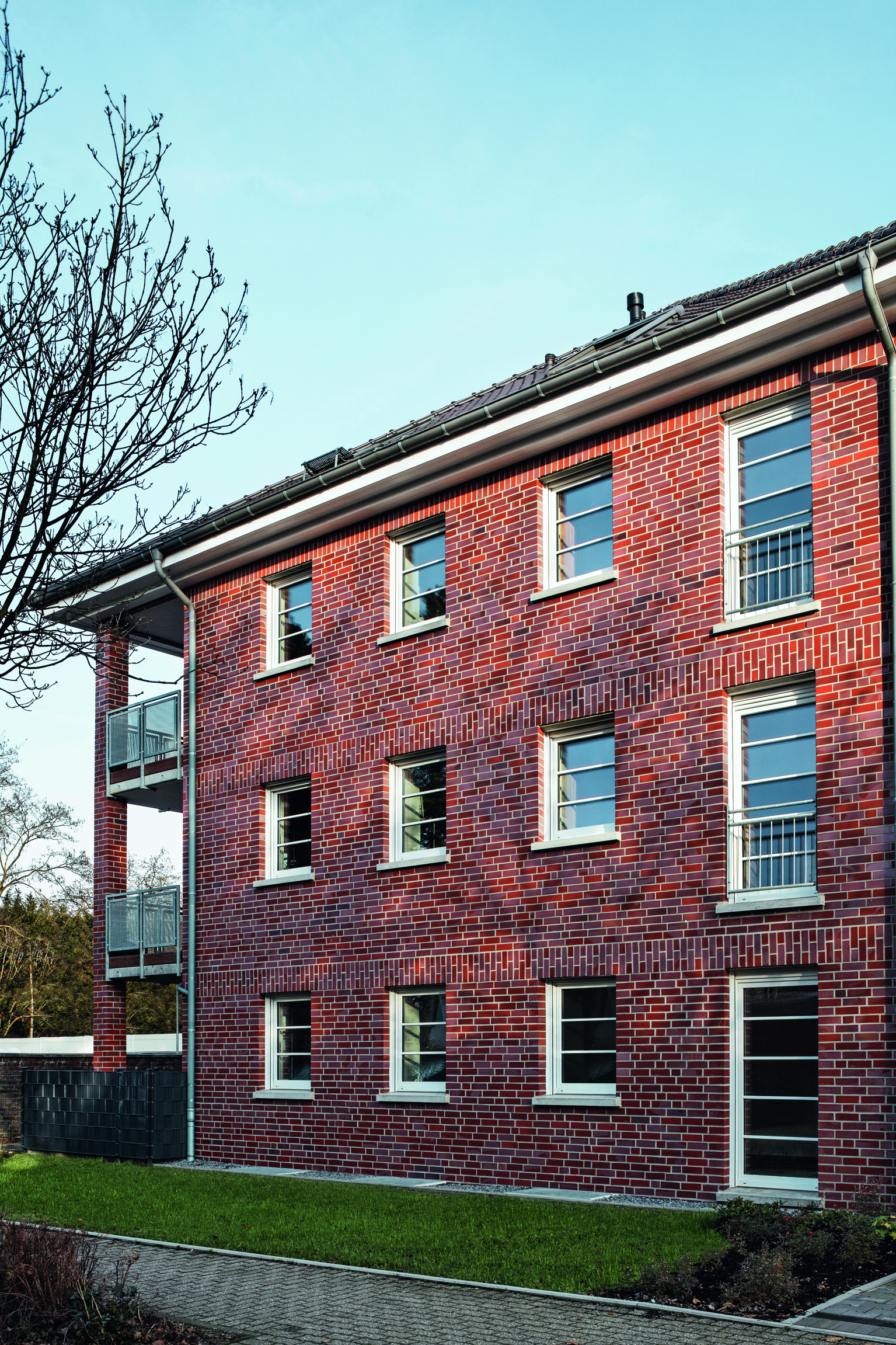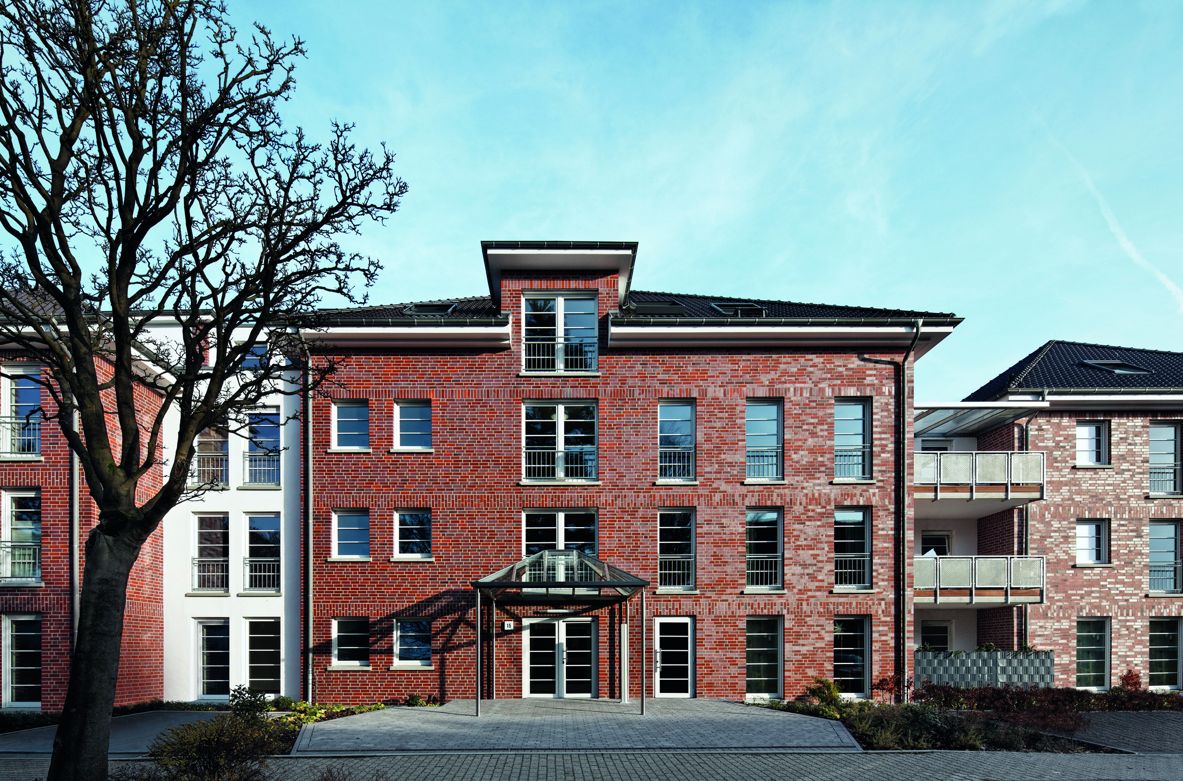 Der in Kempen entstandene, citynah gelegene Wohnpark Wiesenstraße liefert ein gutes Beispiel für eine gelungene Umsetzung dieses zeitgemäßen Anforderungsprofils. Der Bauherr, die GWG Gemeinnützige Wohnungsgesellschaft für den Kreis Viersen AG, errichtete nach dem Entwurf des Kempener Architekten Udo Thelen auf einem großzügigen Grundstück eine Anlage mit insgesamt 30 zum Teil öffentlich geförderten Senioren-Mietwohnungen. Wohneinheiten mit Größen zwischen 47 m² und 90 m² findet man dort verteilt auf drei 3 1/2-geschossige Hauptbaukörper, die über zwei Zwischengebäude miteinander verbunden sind. Die beiden besonders großzügigen 90 m²-Wohnungen erstrecken sich über zwei Geschosse - das 2. Obergeschoss und das Dachgeschoss.