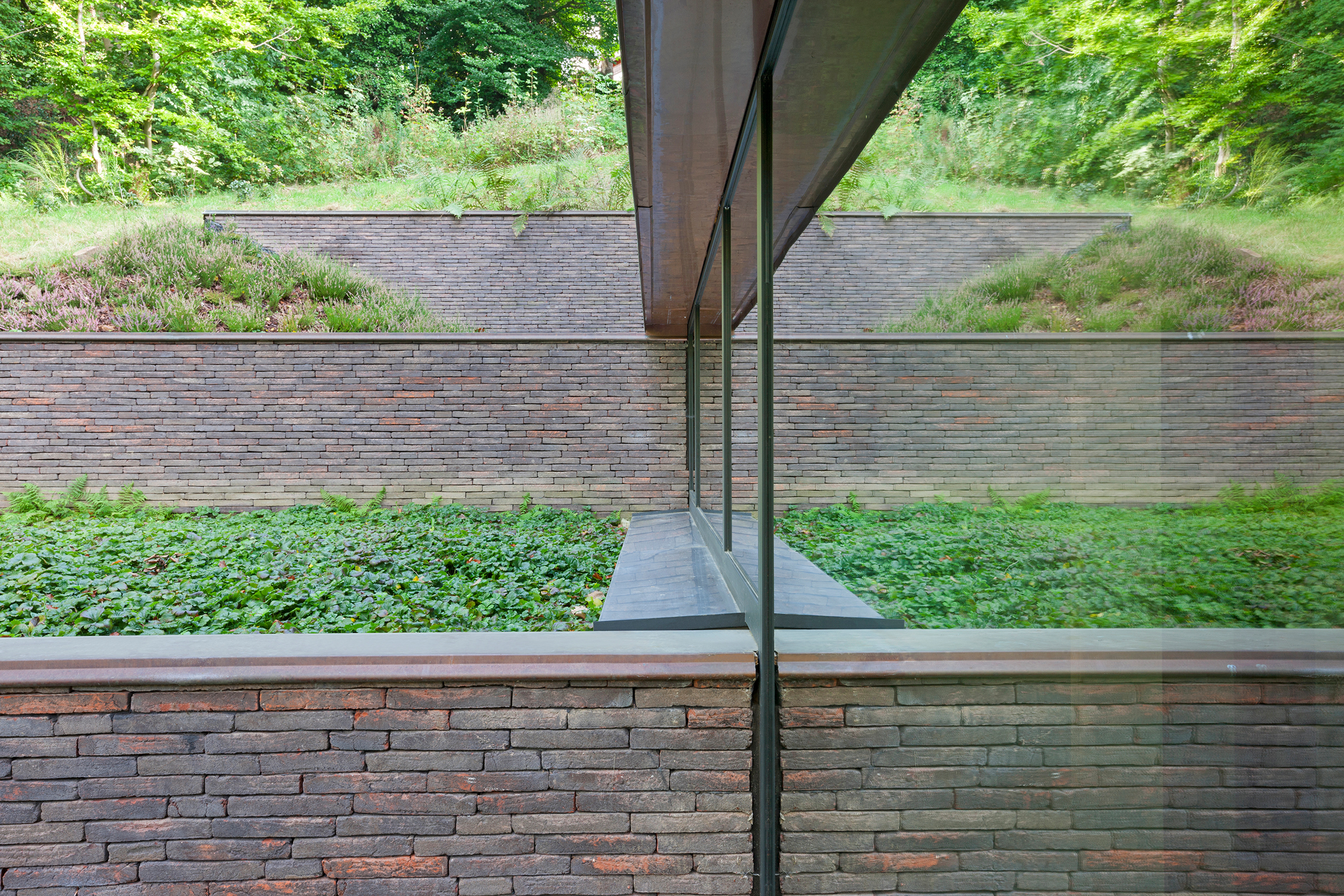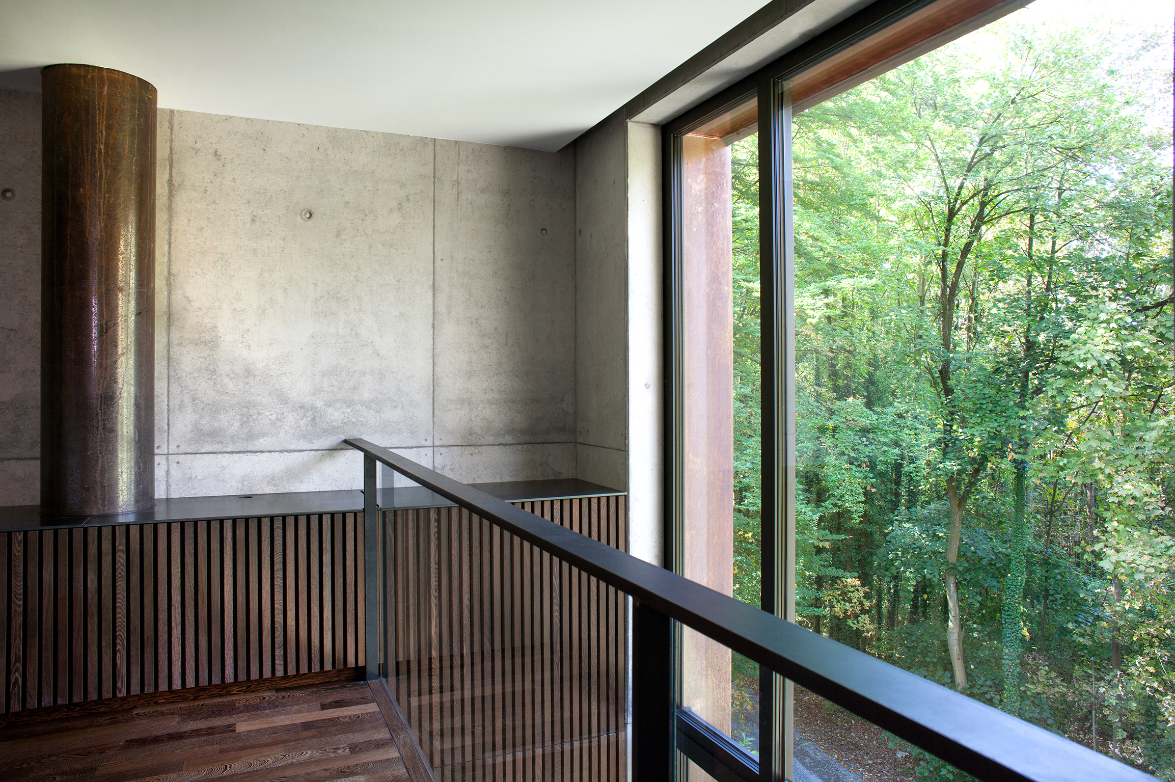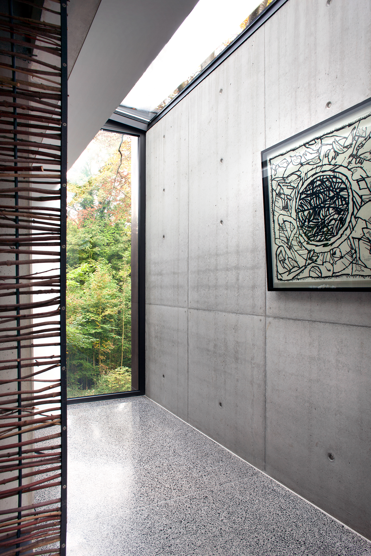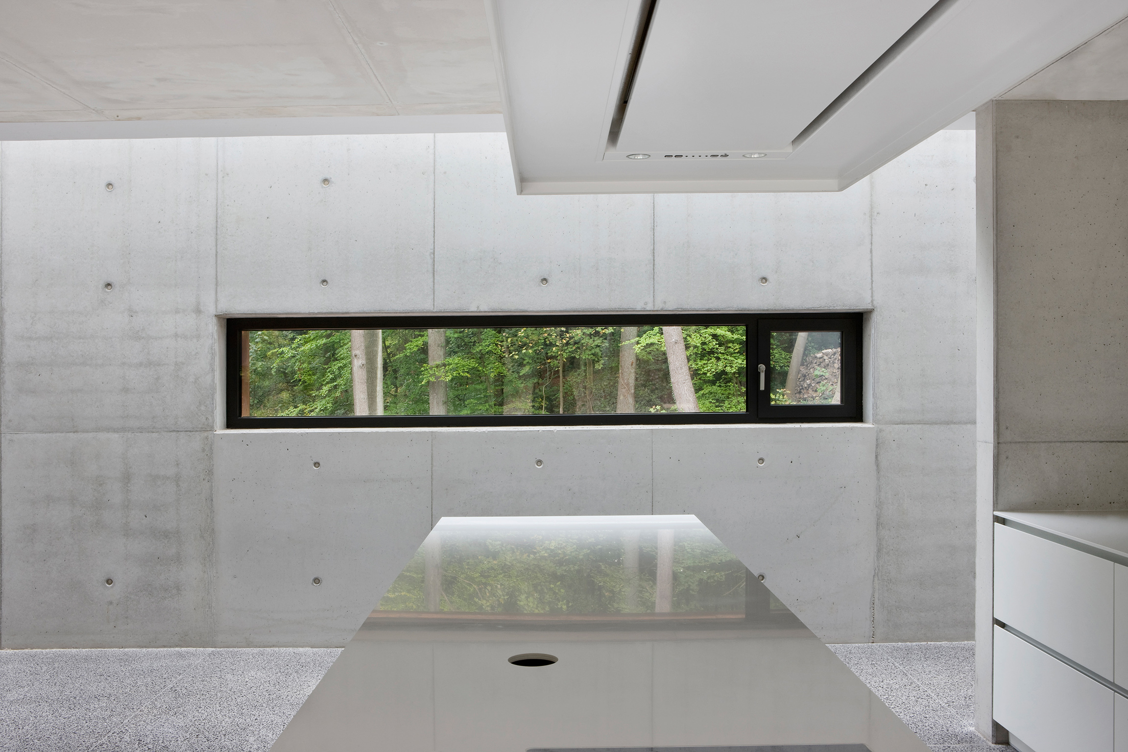 Die Positionierung erscheint auf den ersten Blick ungewöhnlich: Rechtwinkelig zum kleinen privaten Zufahrtsweg und zu dem steilen Hang arrangiert sich der riegelförmige Baukörper. Er scheint geradezu organisch aus dem Gelände herauszuwachsen. Das entspricht der Intention des Architekten, das Gebäude optisch so subtil wie möglich in die Natur zu integrieren und es zugleich energetisch nachhaltig auszustatten.