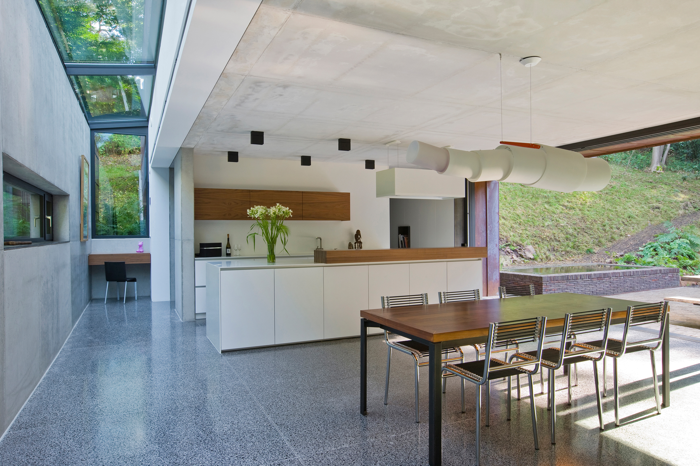 Passend zur durchdachten, hochwertigen und gut isolierten Gebäudehülle (U-Wert 0,11) wählte der Architekt und Bauherr auch die nachhaltige Haustechnik unter bioklimatischen Aspekten aus. So wird der Heizenergiebedarf der Fußbodenheizung vollständig durch eine Wärmepumpe gedeckt und das Warmwasser über Solarthermie-Elemente erzeugt, die auf dem Flachdach platziert sind. Eine automatisierte Be- und Entlüftungsanlage mit Wärmerückgewinnung sowie eine Zisterne mit 10.000 Liter Volumen für Brauchwasser runden das nachhaltige Gebäudekonzept konsequent ab.
