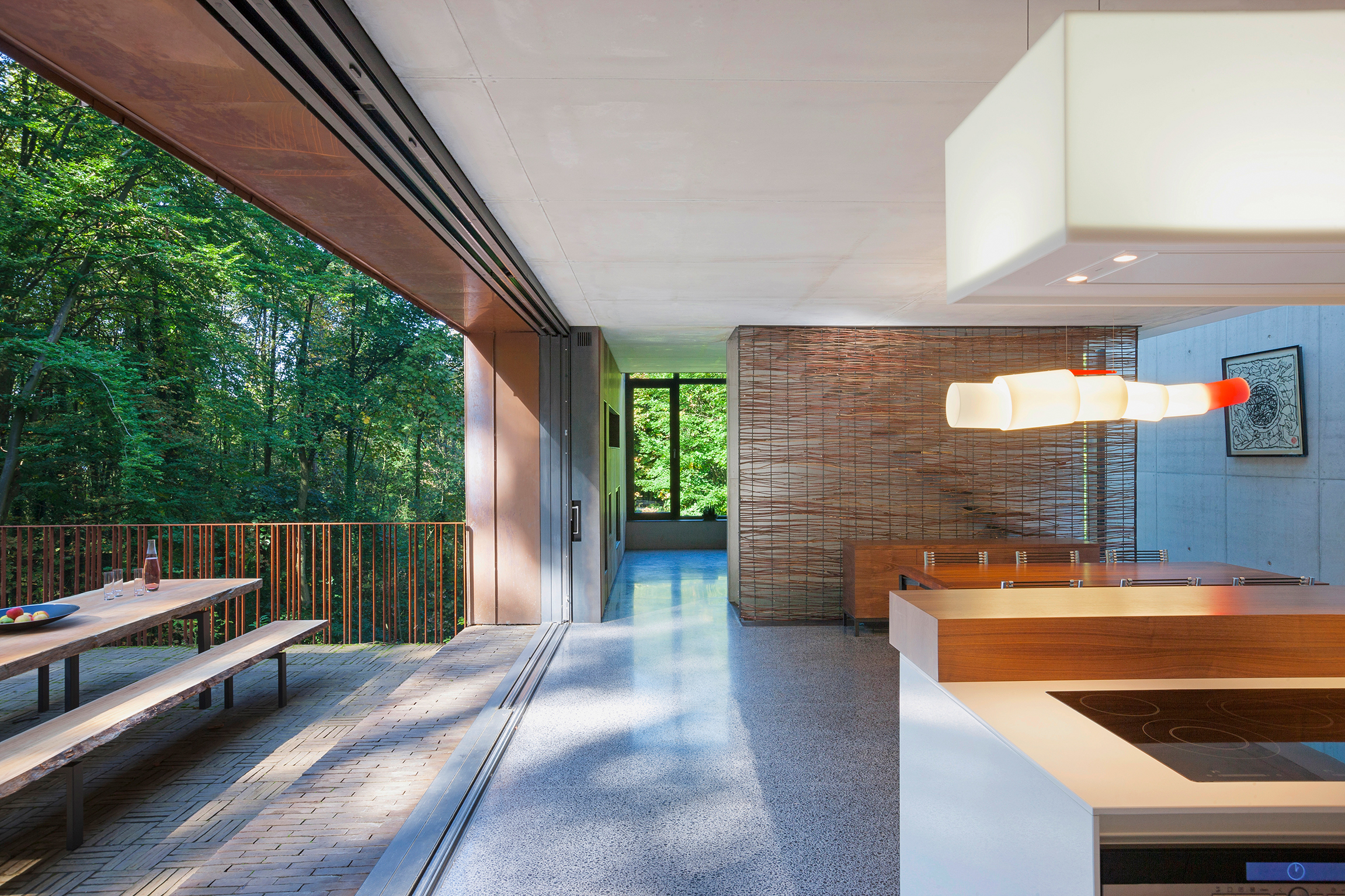 Die nach Norden ausgerichtete Fassade ist oberhalb des Sockels durch ein um 1,20 m vorstehendes Fassadenelement geprägt, das im oberen Bereich über eine 17 m² große Dachverglasung mit dem Hauptbaukörper verbunden ist. Dieses vertikale Lichtband führt bereits morgens ein Maximum an Tageslicht in den Gebäudekern. Weitere „Lichtbringer“ sind die doppelgeschossigen Fassadenelemente an der Westseite sowie der 7,5 m breite Zugang zur Südterrasse. Er erfolgt über eine raumhohe, dreigeteilte Hebe-Schiebe-Wandkonstruktion, die im geöffneten Zustand vollständig in den dafür vorgesehenen Hohlräumen in der Fassade parkt und den Ess- und Kochbereich im Erdgeschoss zu einer überdachten Terrassenverlängerung macht.