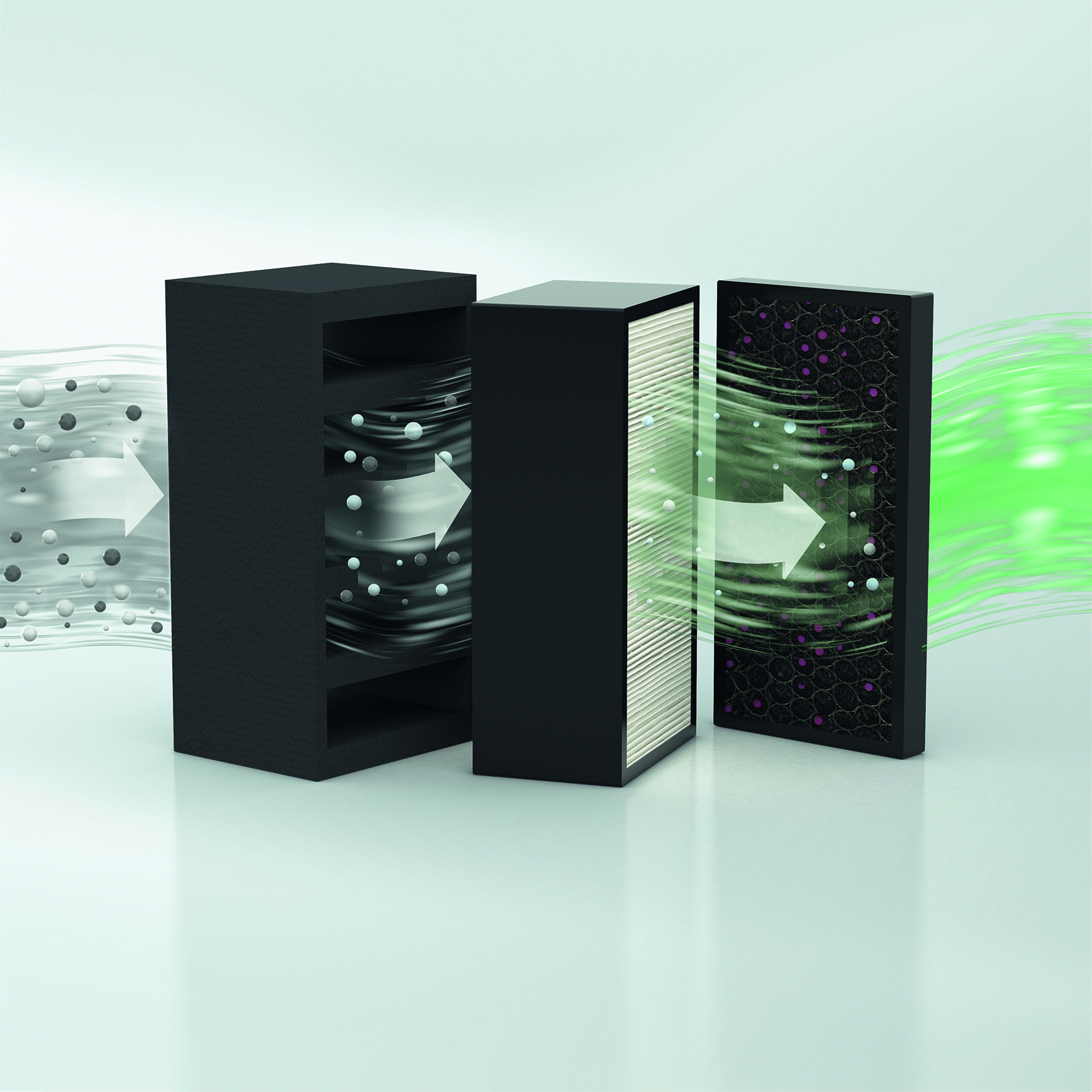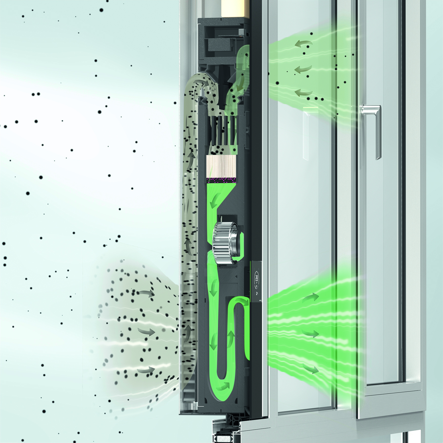 Ein optimales Raumklima und eine gesundheitsfördernde Luftqualität sind für den Nutzer eines Gebäudes wichtig. Mit dem Lüftungssystem Schüco VentoLife wird das menschliche Grundbedürfnis nach sauberer Luft erfüllt. Während der lebensnotwendige Sauerstoff den Lüftungsfilter ungehindert passiert, reinigt die Multiple Air Filter Technology die von außen zugeführte Luft: Kleinste Feinstaubpartikel, Allergene und gesundheitlich bedenkliche Bestandteile bis hin zu einem Mikrometer werden mit einem Wirkungsgrad von 99,5 Prozent aus der Luft herausgefiltert. Die hohe Reinigungswirkung der Luft wird durch eine eng plissierte, elektrostatisch geladene Polypropylenmembran erreicht, die äußerst robust ist und eine dauerhaft hohe Filterleistung gewährleistet. Eine Schicht aus Aktivkohle-Kaliumpermanganat-Gemisch eliminiert störende Gerüche, Bakterien und gesundheitsschädliche Gifte. Der Filter ist je nach Anzahl der Betriebsstunden und Höhe der Luftbelastung nach sechs bis neun Monaten einfach und werkzeuglos zu wechseln.