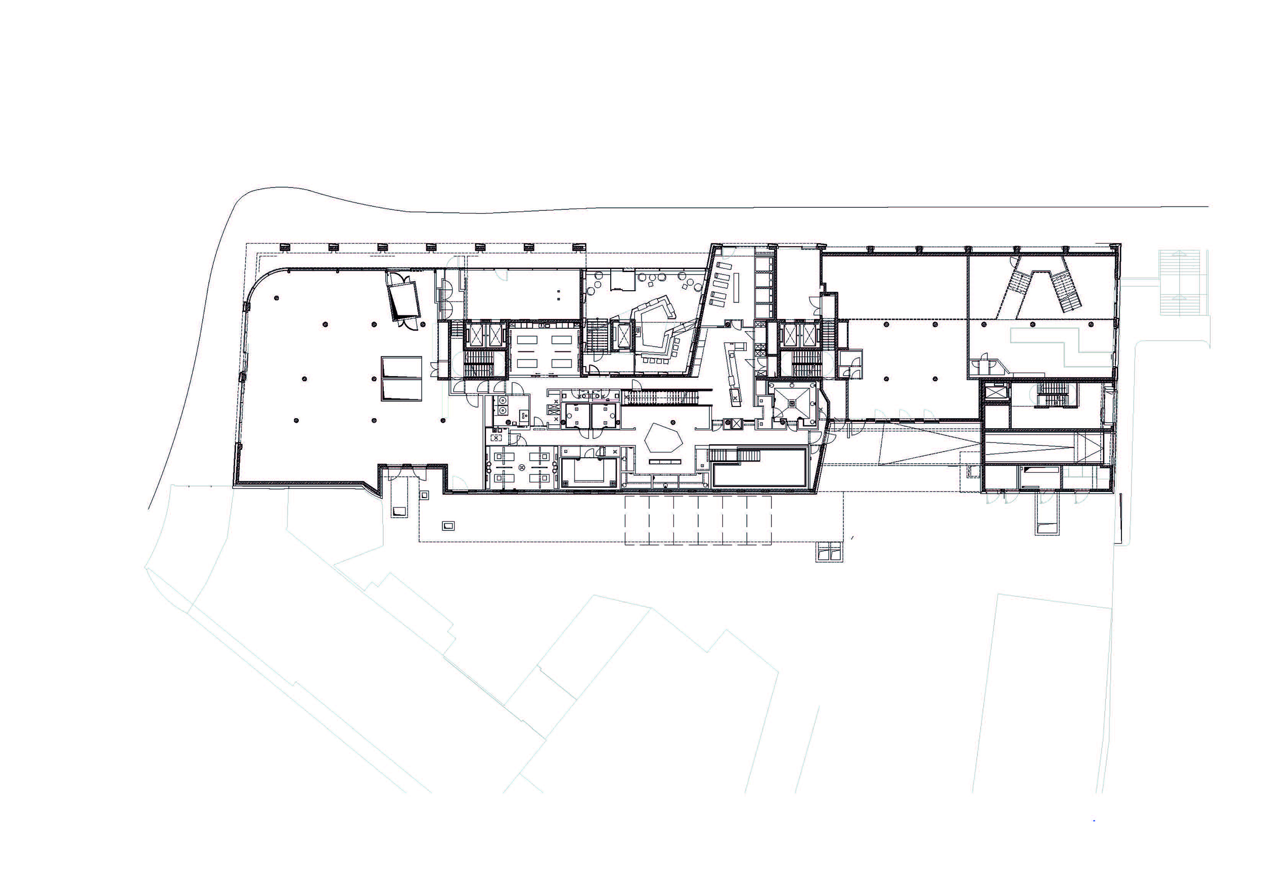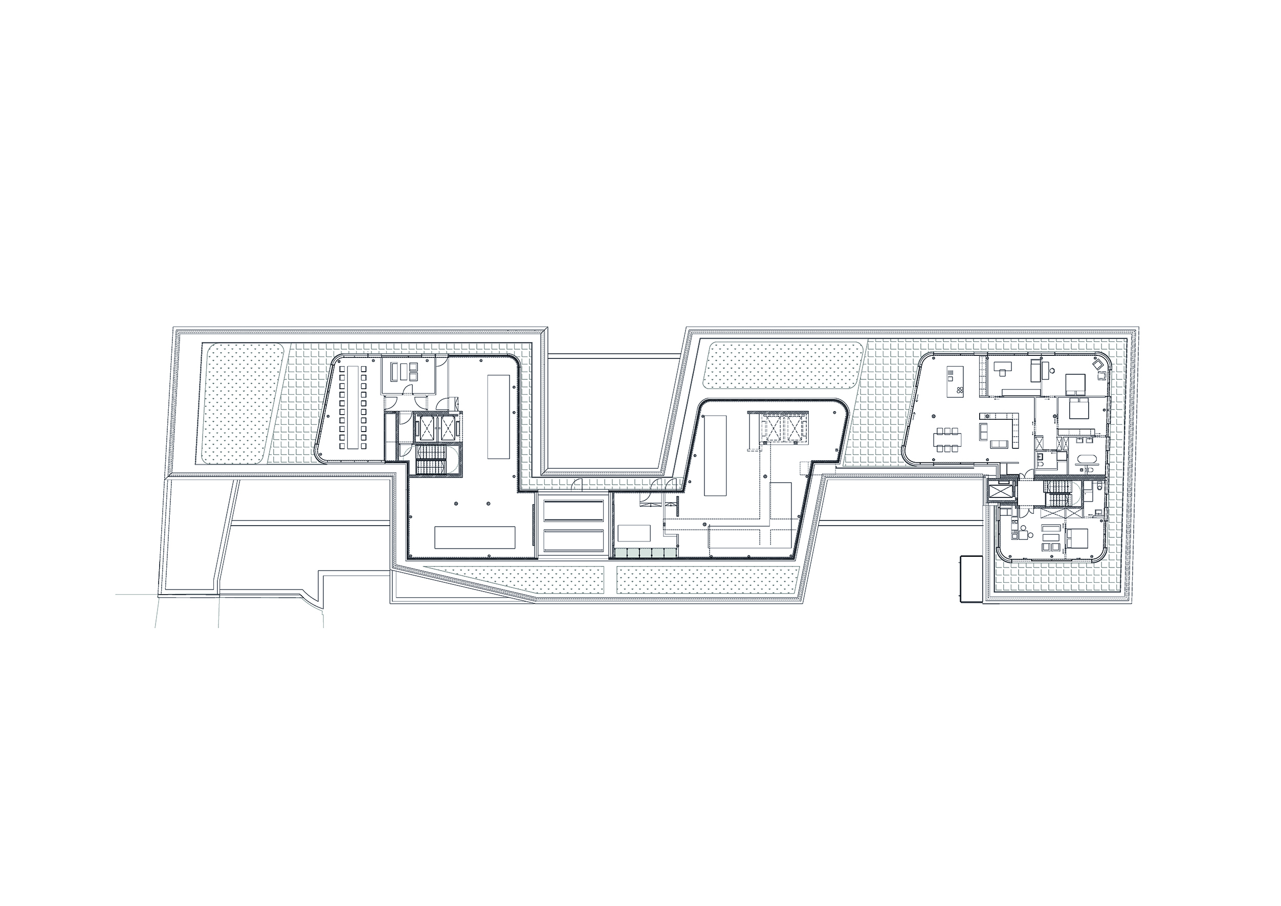 Der Gebäudeabschnitt mit Wohnnutzung – an der ruhigeren Hofseite gelegen – ist als eigenständiger Baukörper gestaltet und mit einer hellen Putzoberfläche versehen. Der Eingang zu den Wohnungen an der Katzenpforte sowie die Einfahrt zur Tiefgarage sind in den Sockelbereich eingeschnitten. Die raumhohen Lichtöffnungen in den Obergeschossen wurden mit Öffnungsflügeln und verglasten Brüstungselementen ausgestattet.