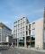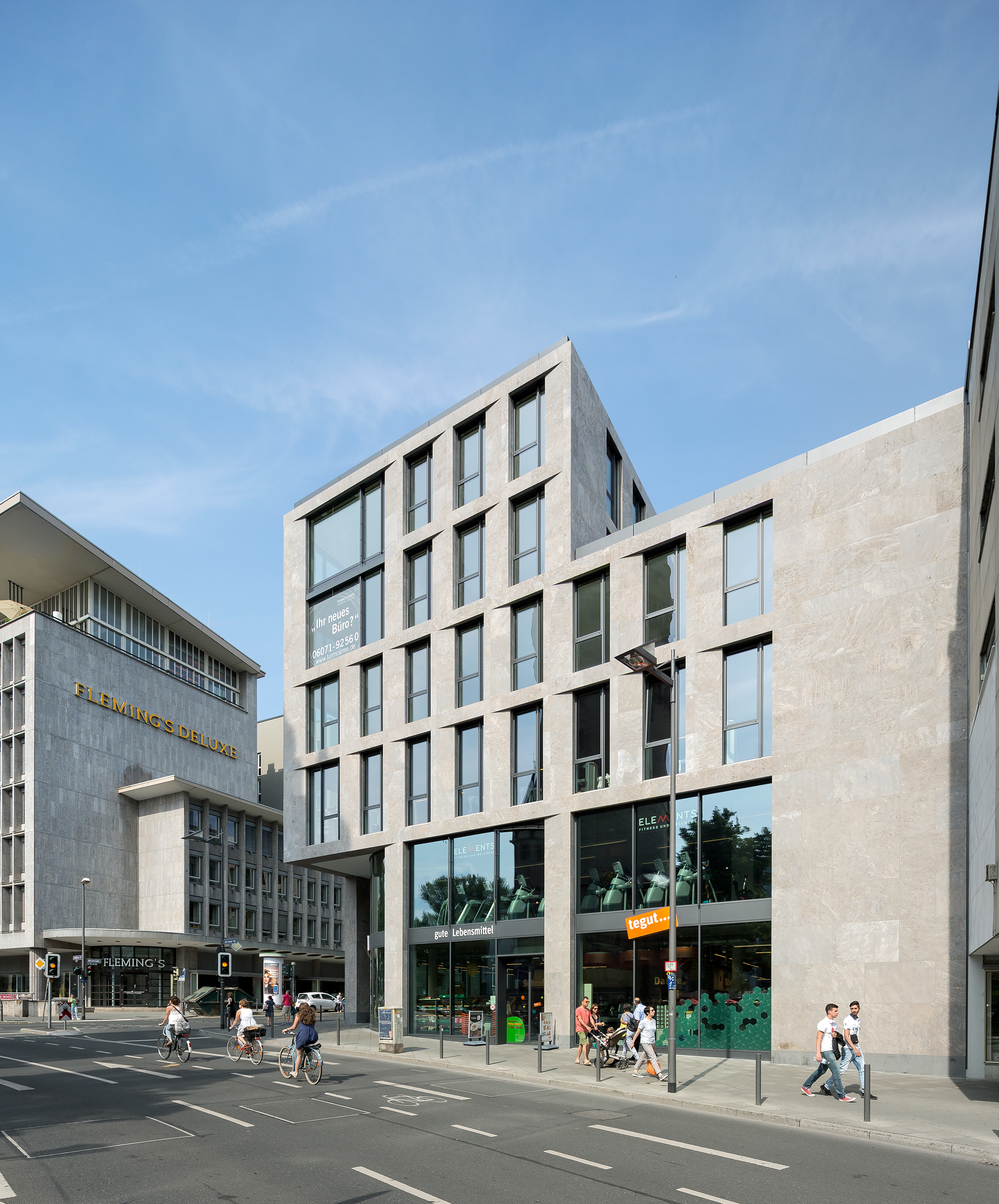 In Anlehnung an die Bestandsbebauung aus der Nachkriegszeit wurde für die Fassade ein heller Naturstein (Muschelkalk) gewählt. Das Fassadenbild des 6-geschossigen Neubaus gliedert sich in einen zweigeschossigen Sockelbereich mit Arkade, vier Obergeschosse und ein zurückversetztes Staffelgeschoss. Schräg gerichtete Natursteinelemente rahmen die Fenster in den Obergeschossen und fassen jeweils zwei Geschosse optisch zusammen, was für ein lebendiges Licht- und Schattenspiel in der Fassade sorgt. Die großflächigen, bodentiefen Fenster (System Schüco AWS 75.SI) sind mit einer Dreischeiben-Isolierverglasung und außen liegendem Sonnenschutz ausgestattet.