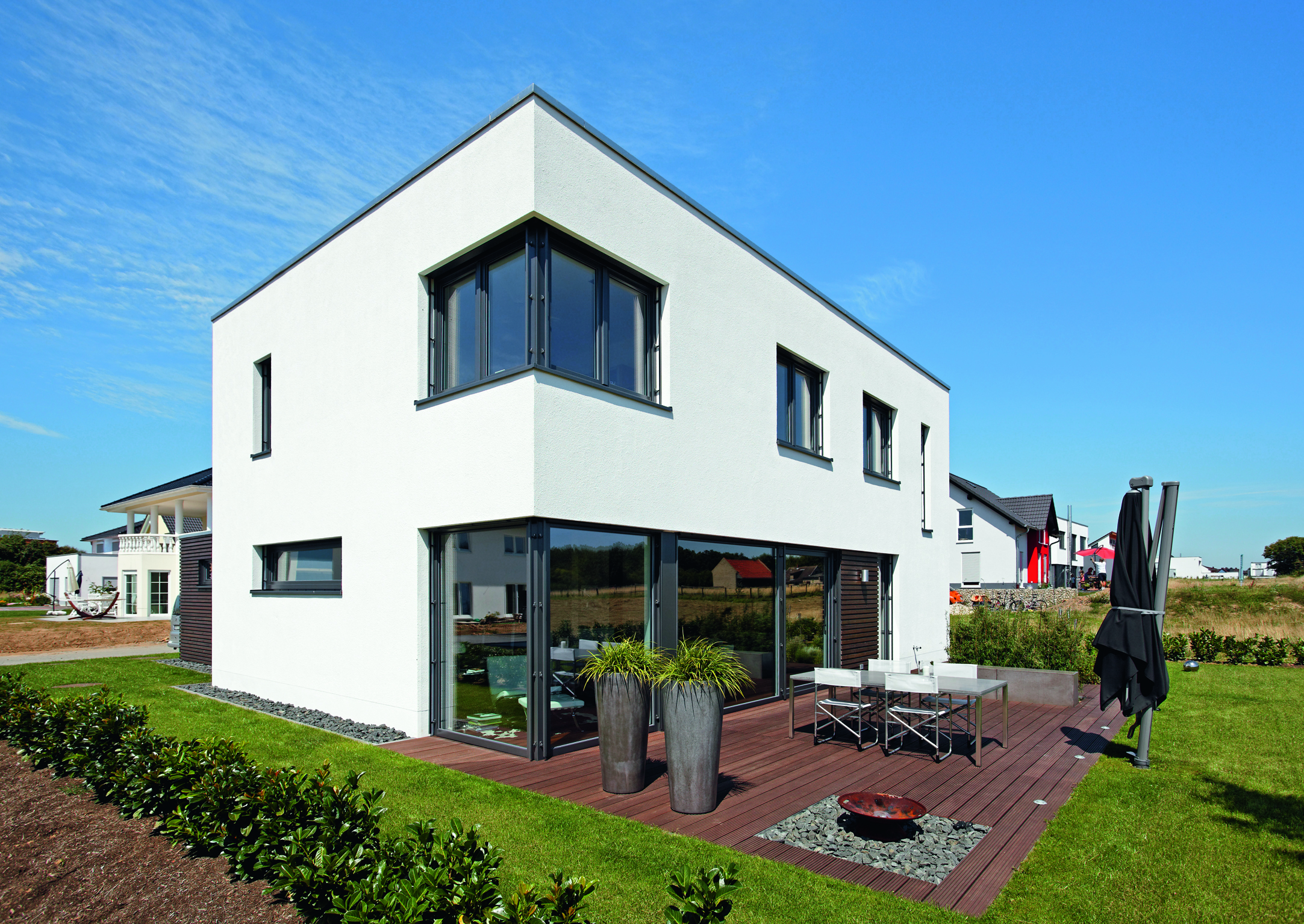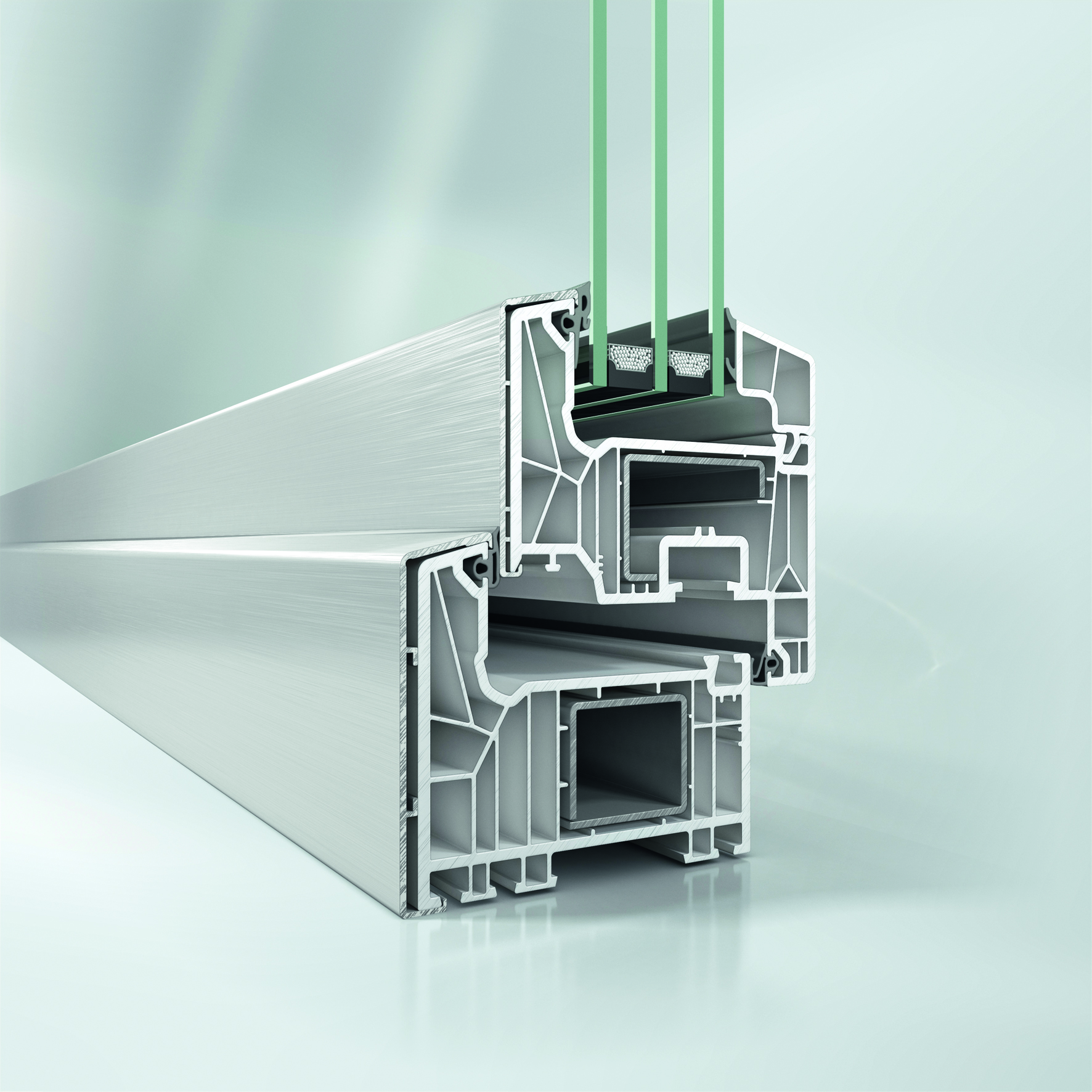 Überall dort, wo eine hochwertige Aluminium-Optik gewünscht wird, eröffnet die Kombination aus Kunststoff-Systemen und Aluminium-Deckschalen eine besonders wirtschaftliche Alternative. Ein besonderer Vorteil ist die einheitliche Optik in der Fassadenansicht, denn Elemente mit außenliegender Aluminium-Deckschale unterscheiden sich in Ihrer Außenansicht nicht von reinen Aluminium-Elementen. So können auch Mischobjekte hinsichtlich ihrer unterschiedlichen Nutzungsziele mit intelligenten und wirtschaftlichen Materialmix-Lösungen realisiert werden, ohne auf die jeweiligen Vorteile beider Werkstoffe zu verzichten.