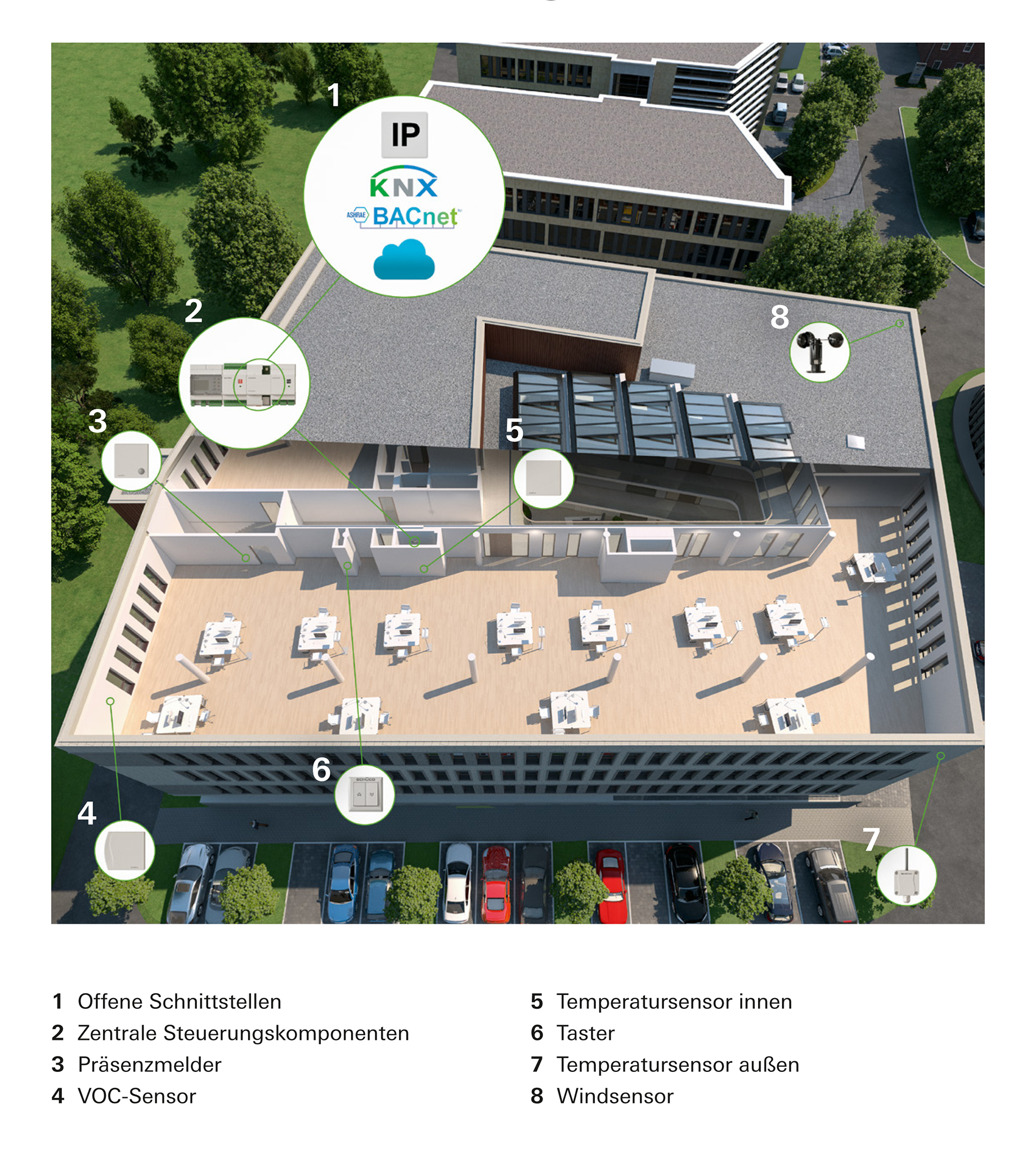 Nutzerdefinierte Vorgaben können mit Building Skin Control individuell konfiguriert werden: Automatisches Fensterschließen bei Regen, zeitgesteuertes Fensterlüften oder die Schließung von Öffnungselementen bei Abwesenheit von Personen sind Beispiele, die über Sensoren einfach zu regulieren sind. Das Sensor-Portfolio umfasst Wind- und Regenmelder, Temperatursensoren für den Innen- und Außenbereich, Präsenzmelder sowie Raumluftgüte-Sensorik VOC (Volatile Organic Compounds).